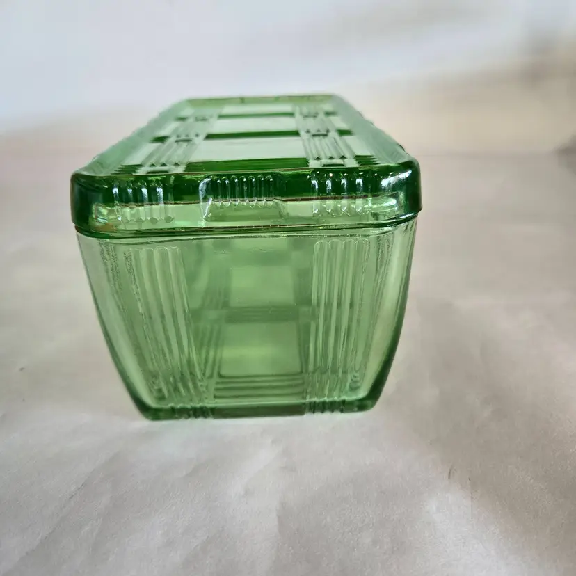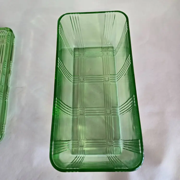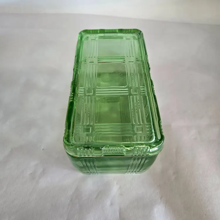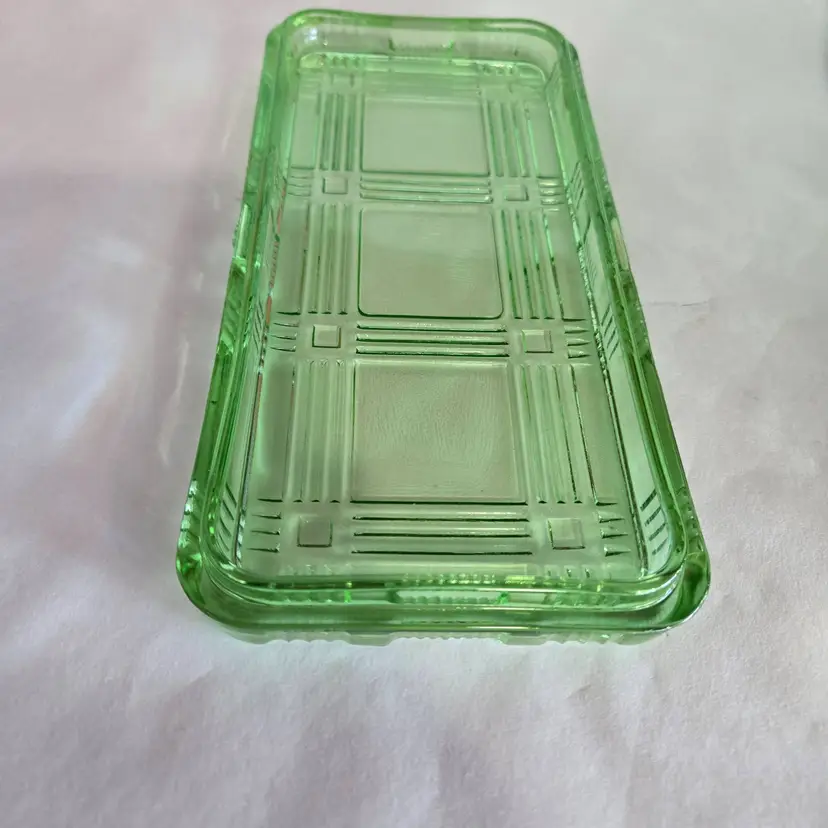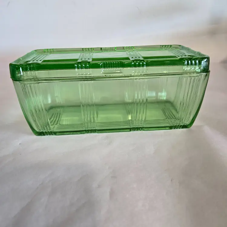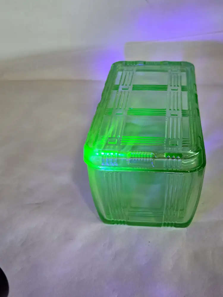 Vintage uranium hazel atlas criss cross refrigerator dish that glows vibrantly under a blacklight. This is a large, heavy dish that would look great in any collection. This has normal wear, refer to pictures for a closer look. This is a statement piece for a gift or add to your personal collection.