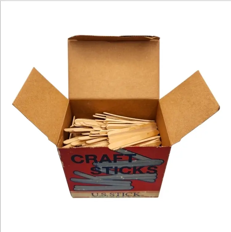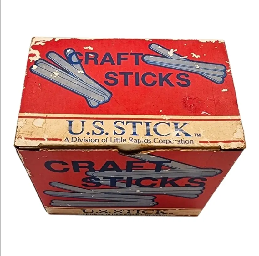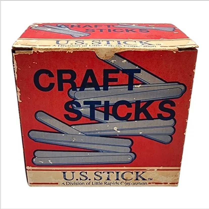 Vintage U.S. Stick Craft Sticks set by Little Rapids Corporation, complete with the original wooden craft sticks still included. This is a classic mid-to-late 20th century craft supply box, often used in classrooms, schools, and home craft projects.