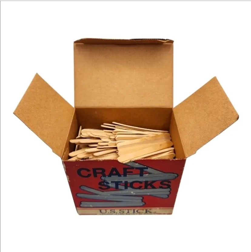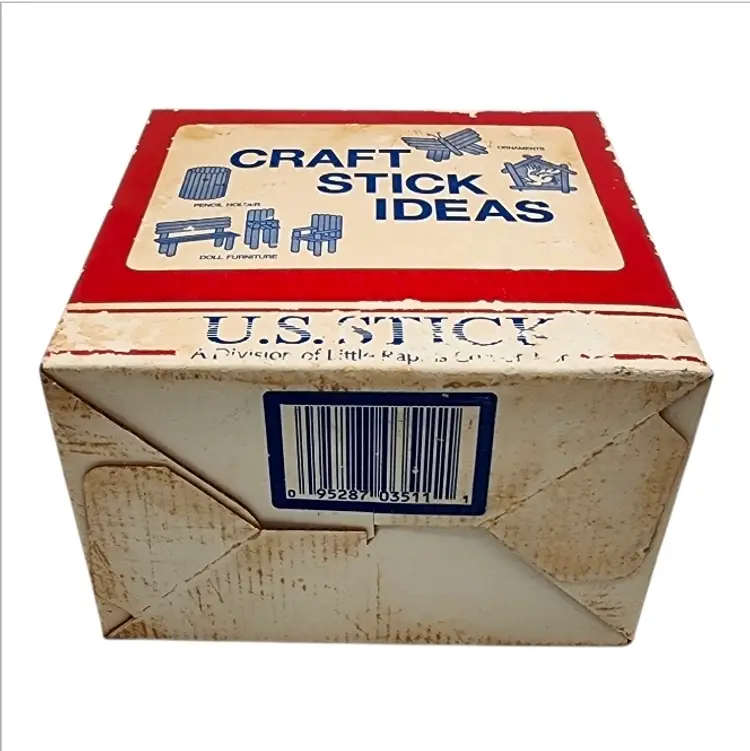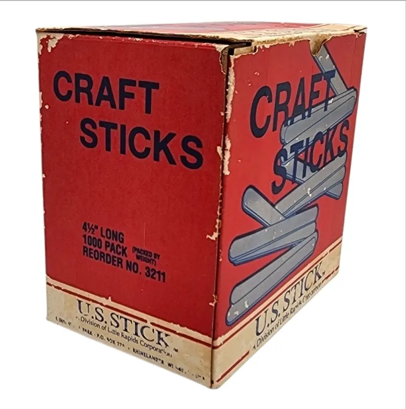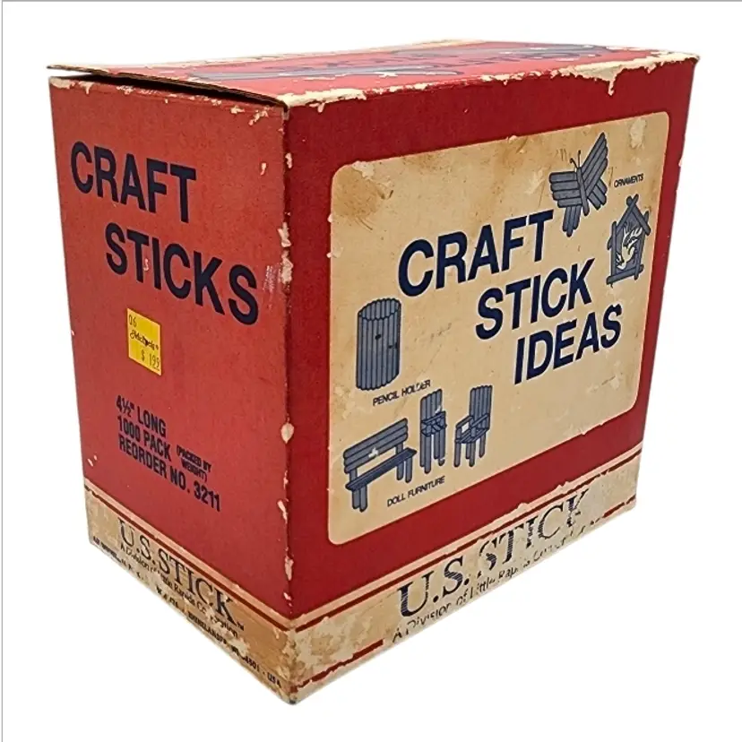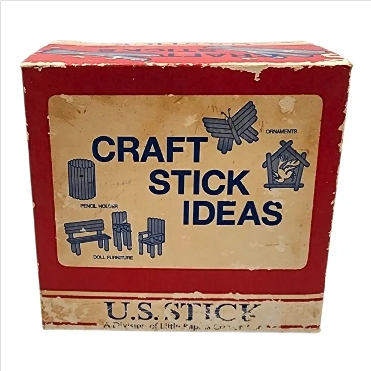 The box features original “Craft Stick Ideas” graphics, showing examples such as pencil holders, ornaments, doll furniture, and small builds — a great nostalgic touch that also makes this a fantastic display or décor piece.