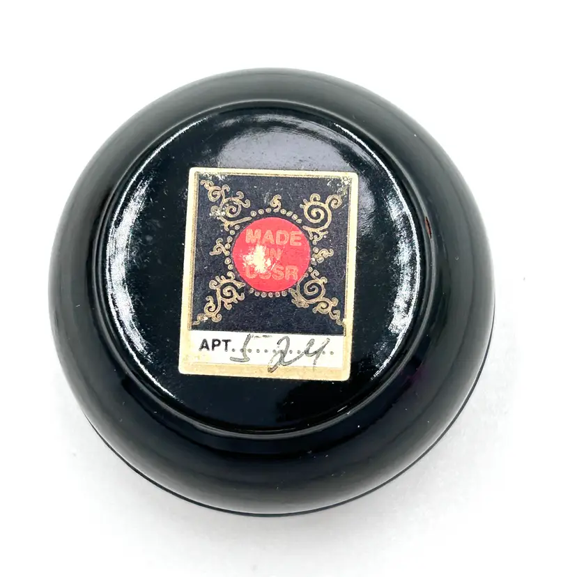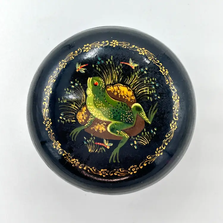 Add a touch of vintage charm to your collection with this beautiful round lacquered trinket box from the USSR. The box features a hand-painted frog design on multicolor background, making it a perfect addition to all occasions and any room in your house. Small in size, it is ideal for storing jewelry, trinkets, or other small items. Crafted from high-quality lacquered wood, this original piece has a unique Russian style and is handmade with care. The box is a Keepsake Box and is an ideal gift for collectors or anyone who appreciates unique and beautiful items. Don't miss the chance to own this one-of-a-kind piece of history. Excellent condition. Approximate size: 2" diameter x 1" high. Please see photos for more details.