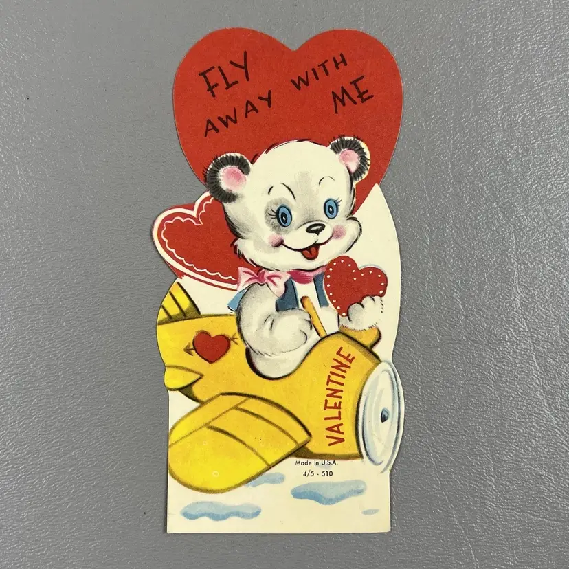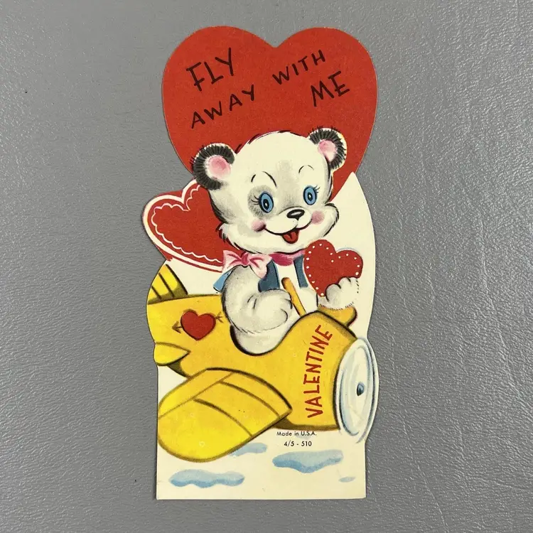 Vintage Valentine Card Die Cut Bear Yellow Airplane Flay Away With Me 5" USA