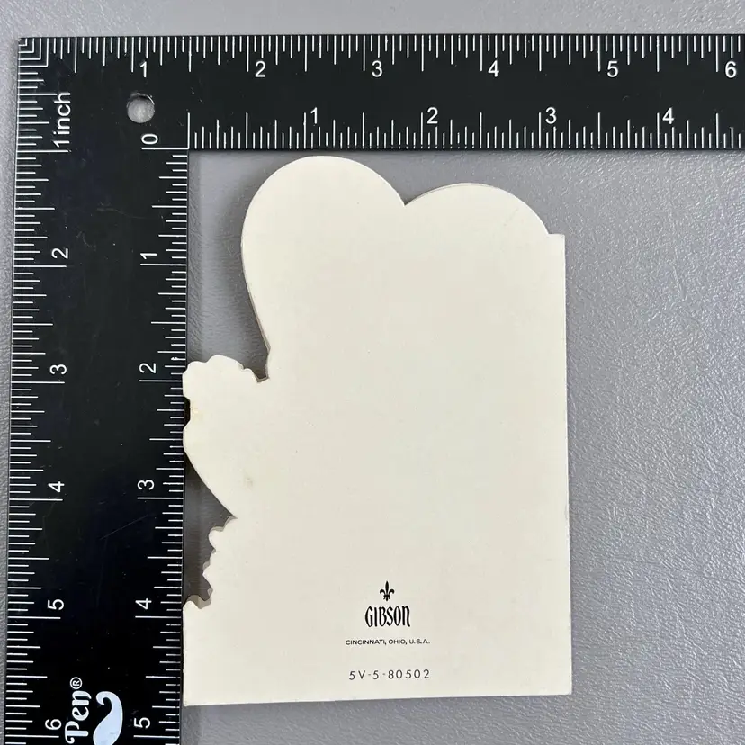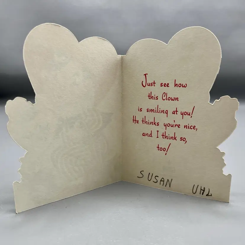 Vintage Valentine Card Die Cut Clown Just For You Heart Flowers Umbrella Gibson 4.75"
