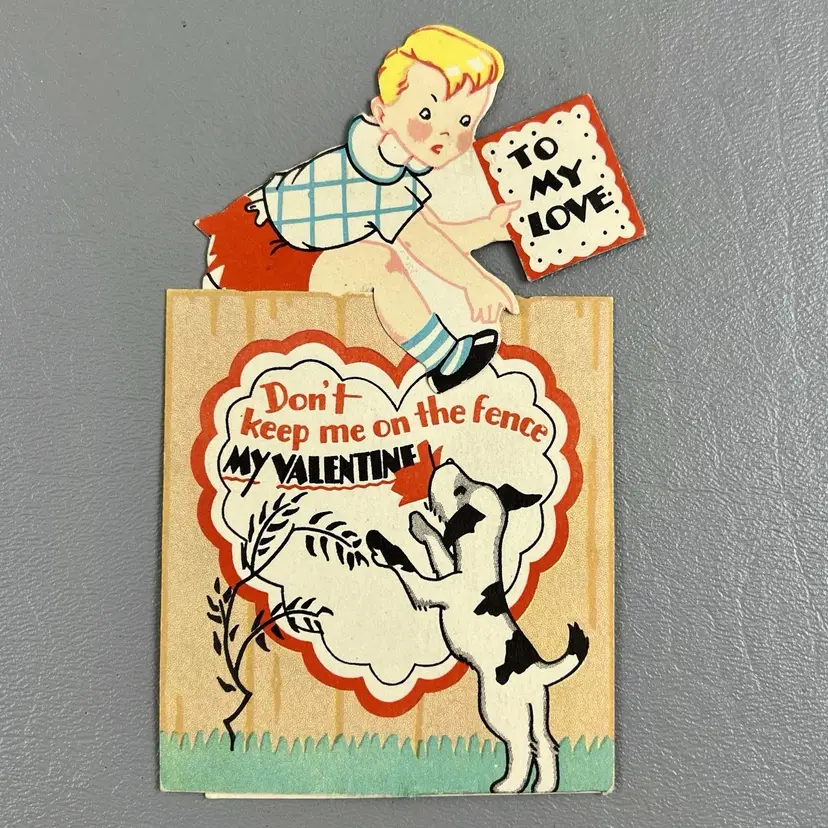 Vintage Valentine Card Don't Keep On the Fence Boy Dog Carrington Co USA Die Cut Pop Up Stand