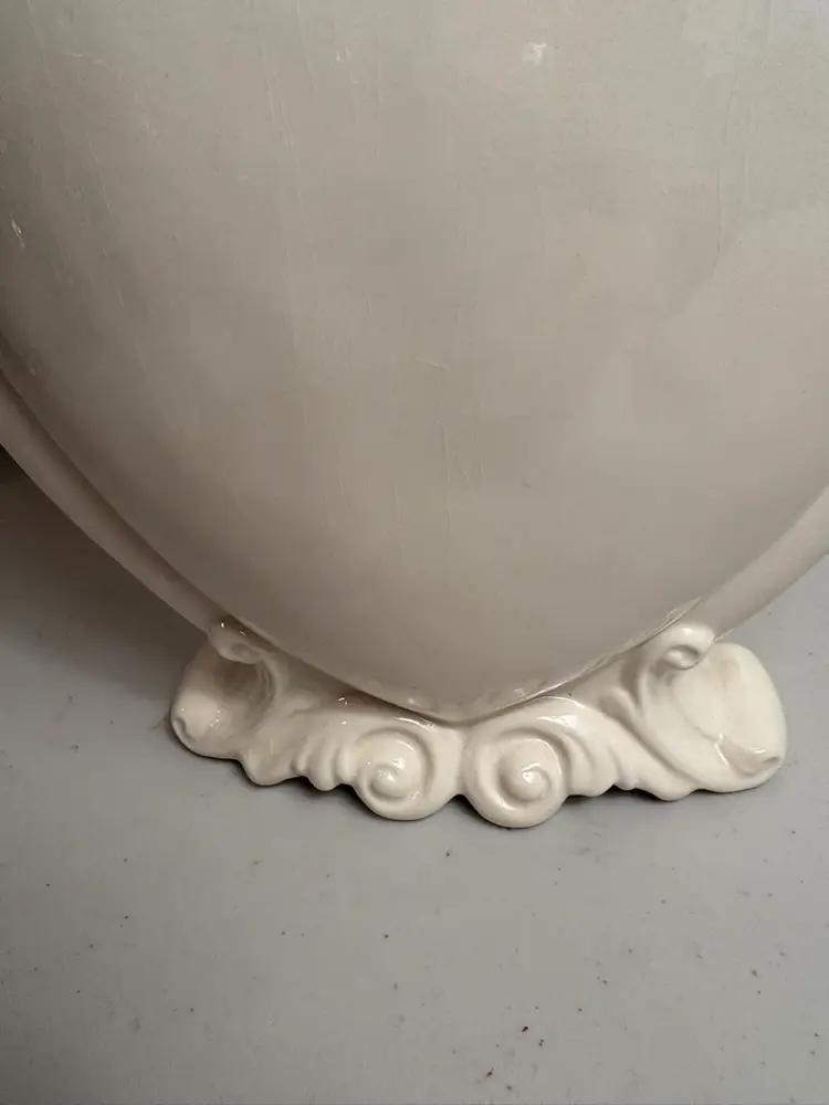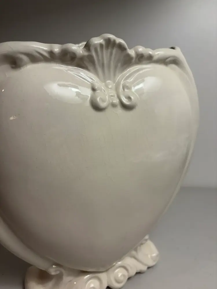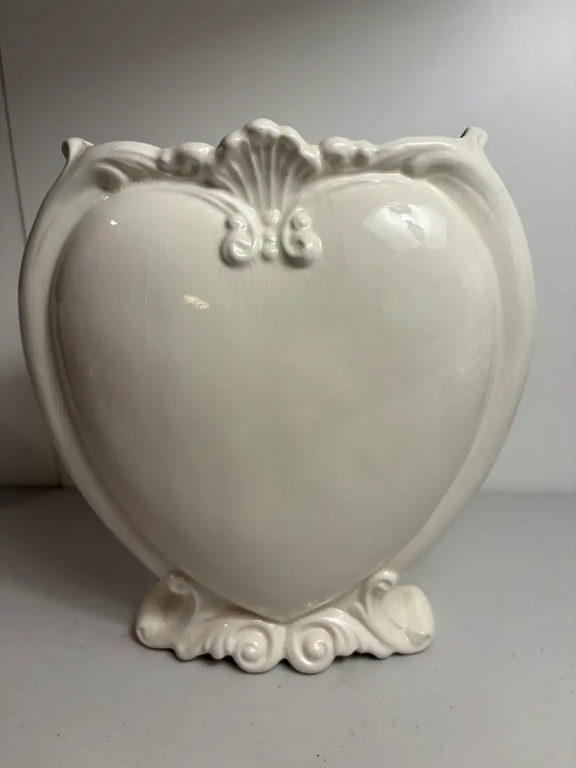 Perfect for Valentine’s Day. This vintage ceramic heart-shaped flower vase stands at 9 1/4" tall, featuring a delicate ivory color that adds a touch of elegance to any floral arrangement. Crafted from ceramic, this vase is not only functional but also serves as a charming collectible piece for those who appreciate classic and timeless decor. Its unique heart shape makes it perfect for displaying a lovely bouquet of roses or as a lovely addition to a collection of decorative vases.