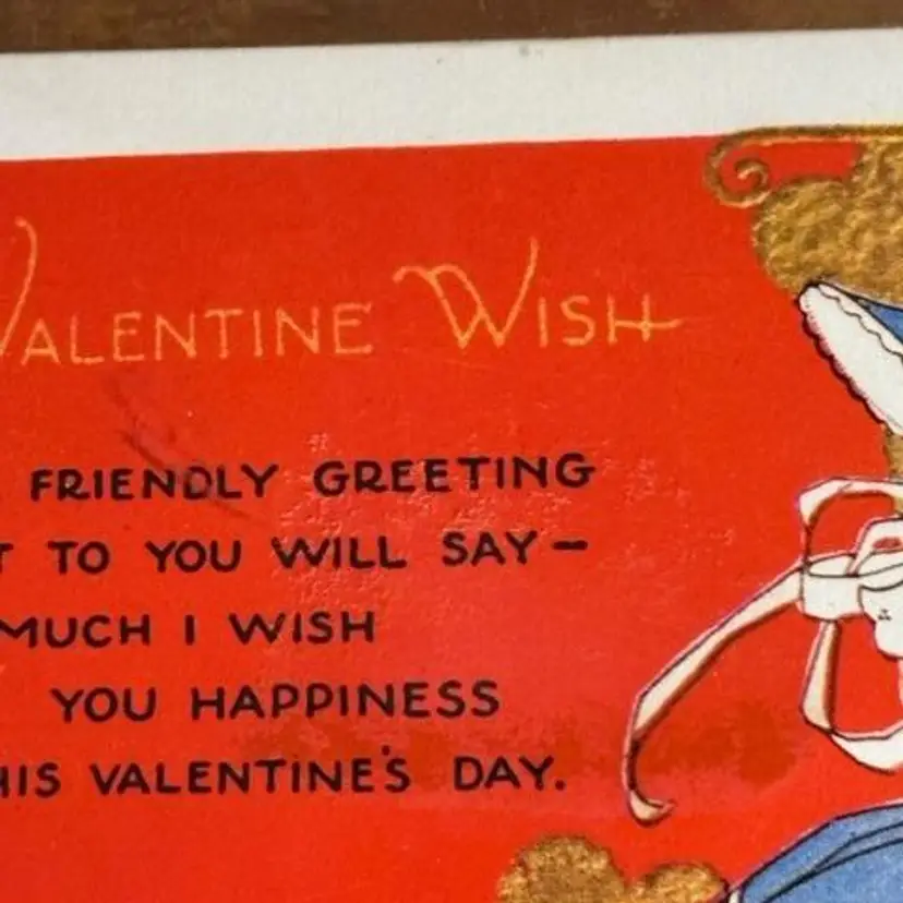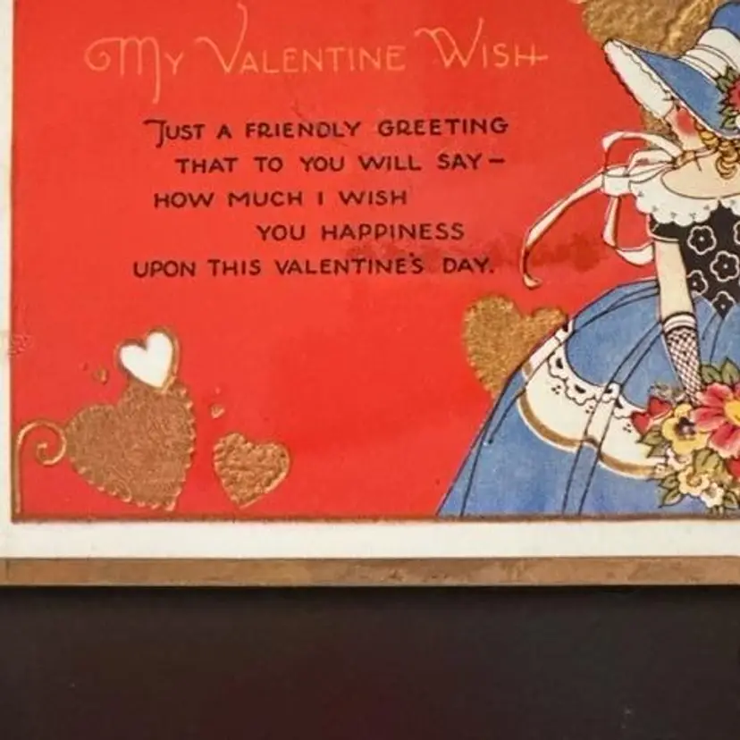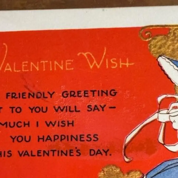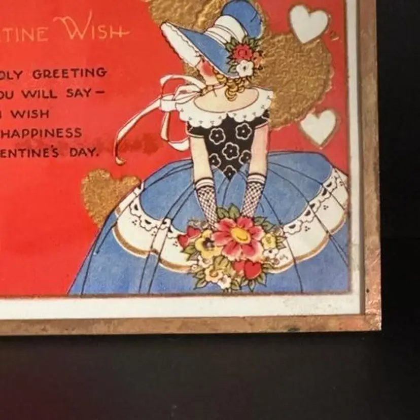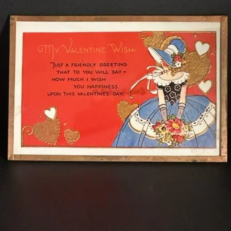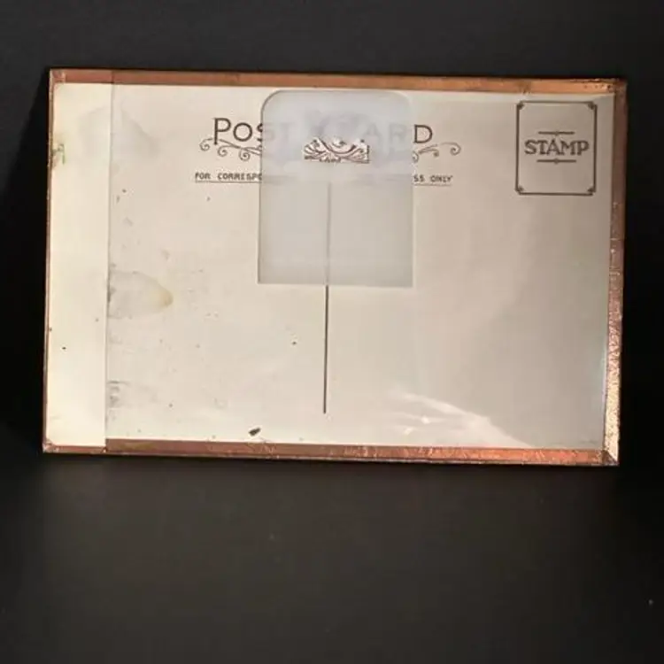 I have this Vintage Valentines Day Postcard my mom framed many years ago. Has been in the frame for a long time. It cannot be removed or it will tear. You can see where it is stuck on the front of the glass. Sill very cute for the Holidays. Measures 4x6
