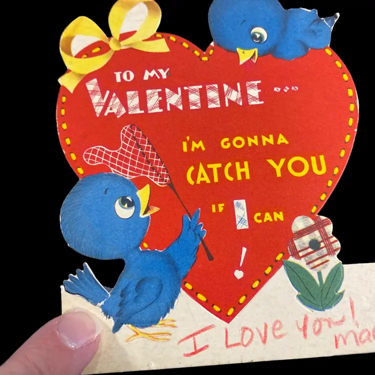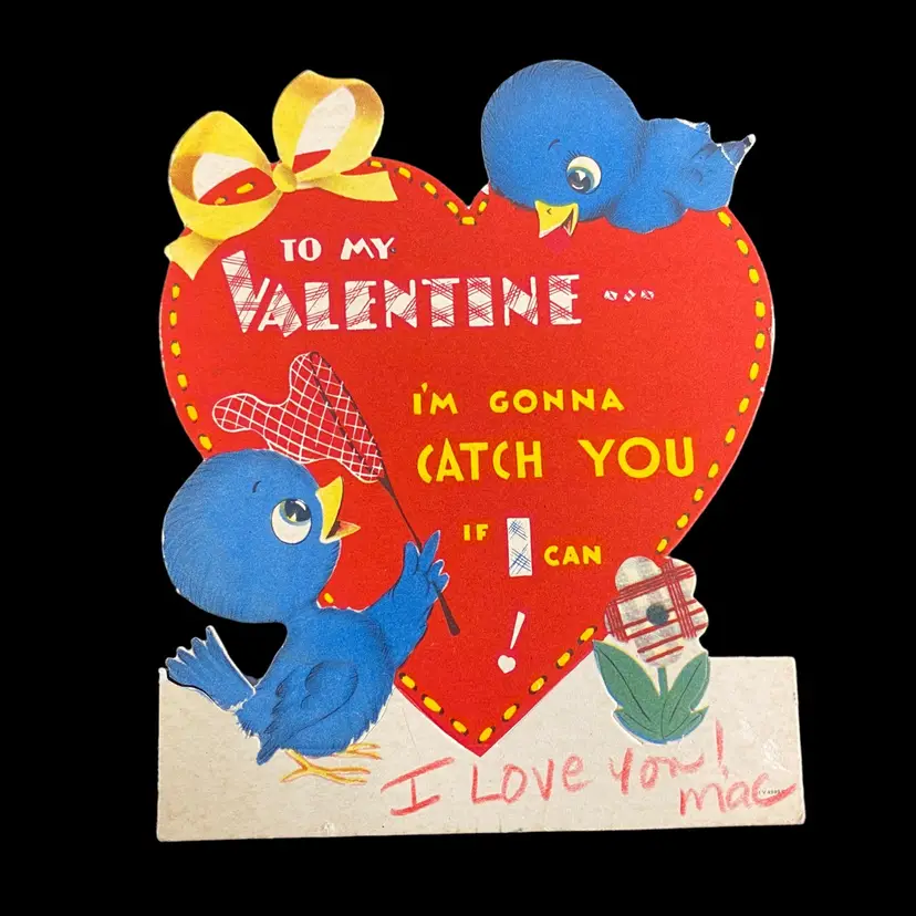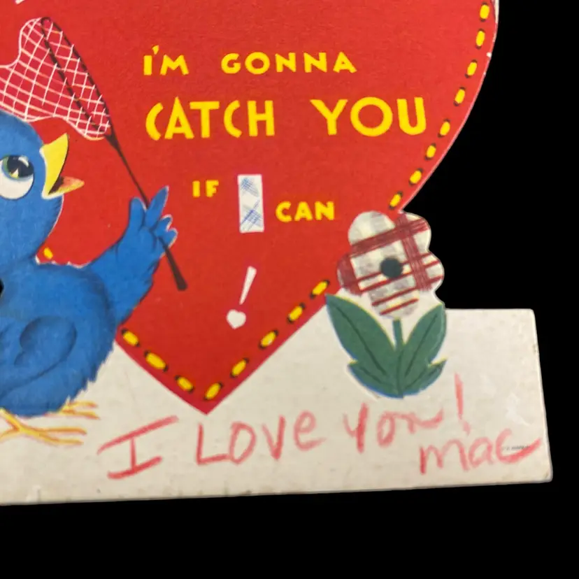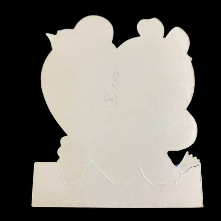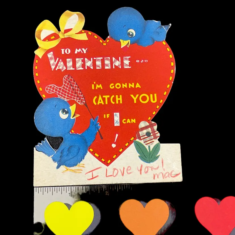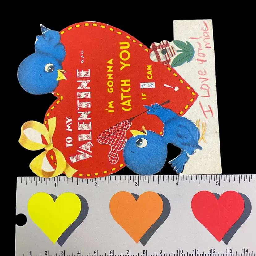 4” x 5”, has writing on the front and back. Has wear on birds, wings, and tails. The bird on the lower left corner has tape on its tail. Please see all photos.