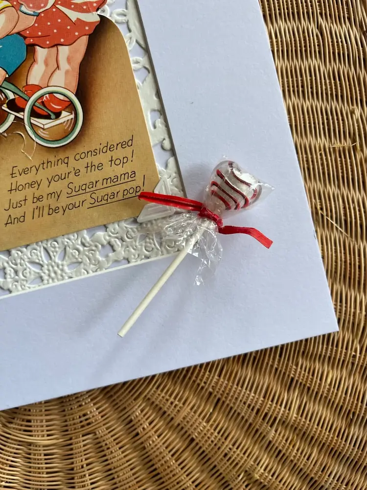 Card condition is pictured. Card can be carefully removed from tabs without damaged. Includes fake lollipop made from glass bead. “Lollipop” is removable and will be delivered out of the card. Artwork comes in a protective sleeve.