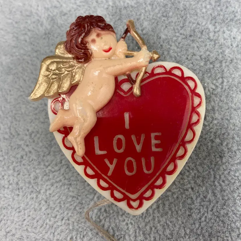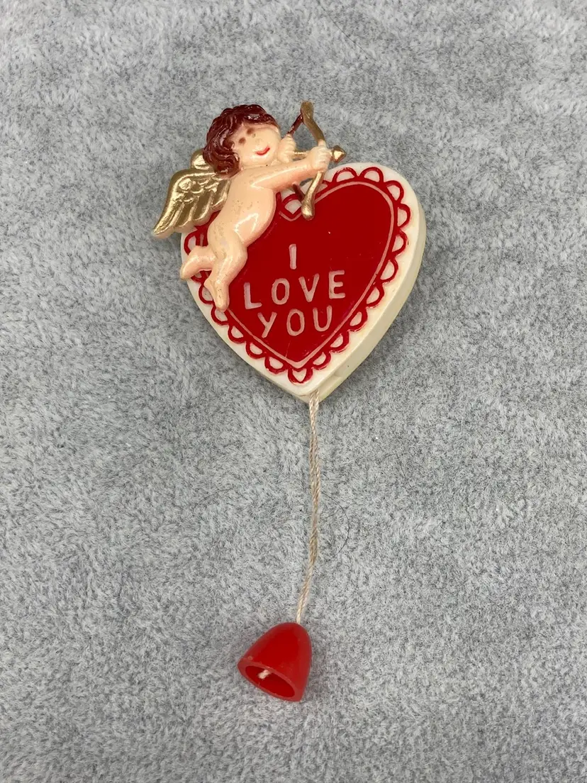 This pin is in good overall condition. The glue on the plastic has somewhat yellowed over the years. This pin measures approximately 3 3/4" long including the pull string and the main heart itself measures approximately 2" x 1 3/4".