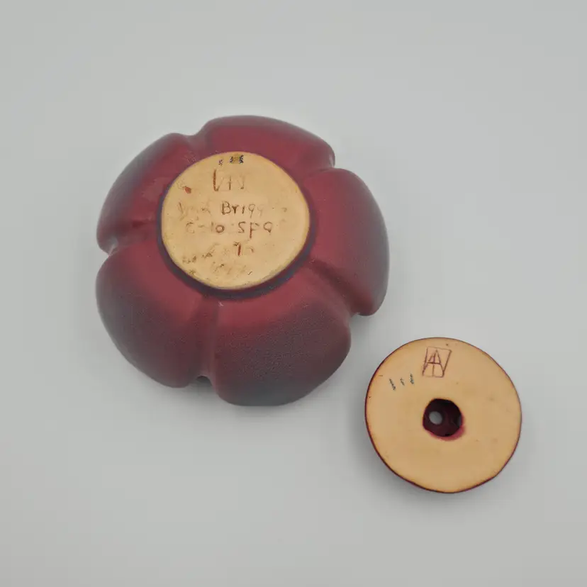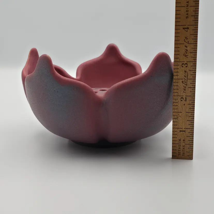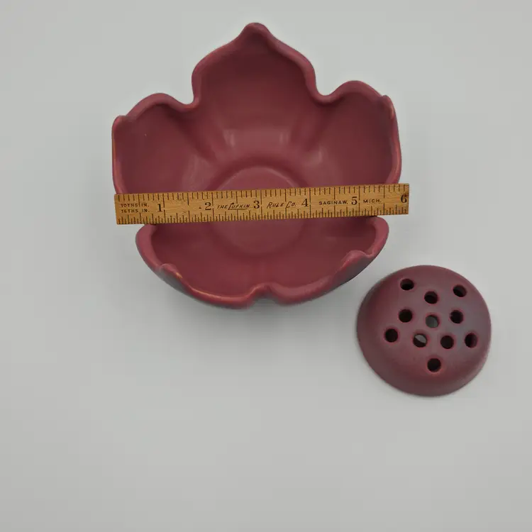 Vintage Van Briggle Art Pottery Mulberry Lotus Bowl Flower Frog signed on frog and vase. Great condition no chips, cracks or scratches. Bowl measures just under 6 inches in diameter and 3.5 inches tall. Flower Frog is 3 inches in diameter and 1.5 inches tall. Thank you for looking and have a great day today!