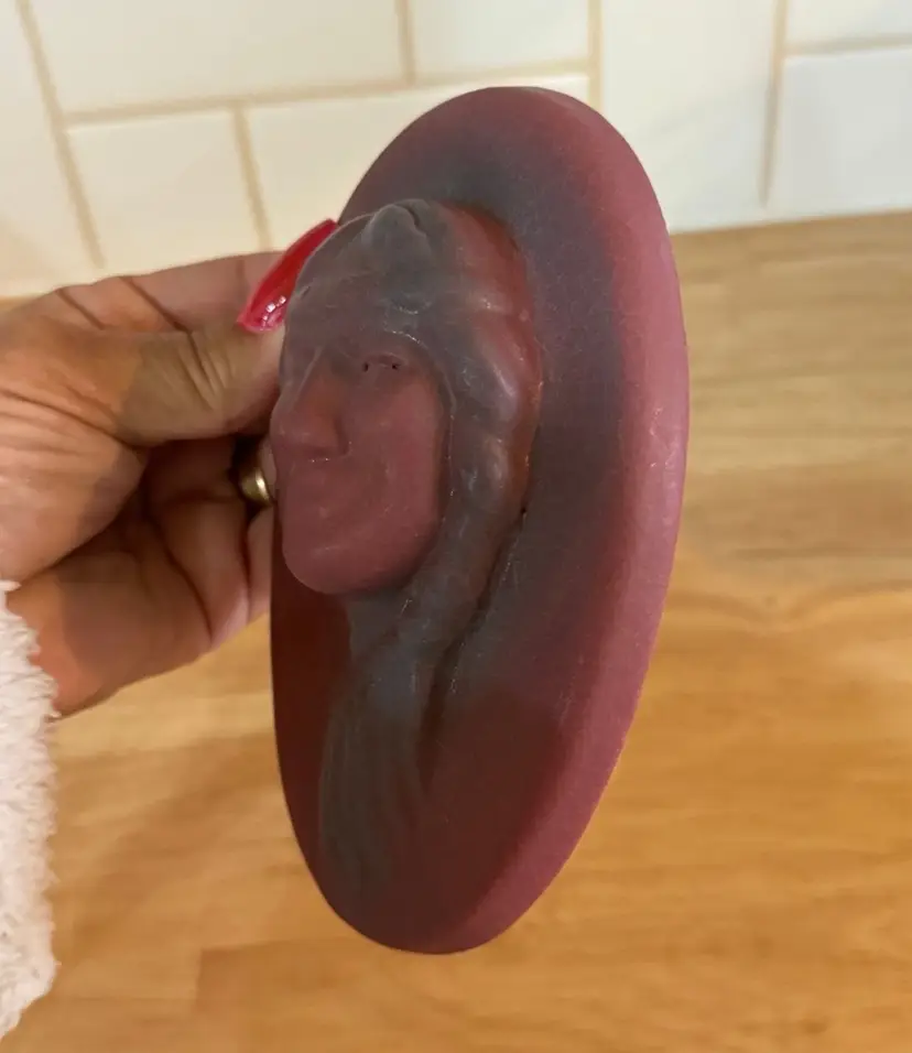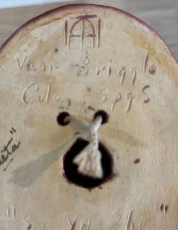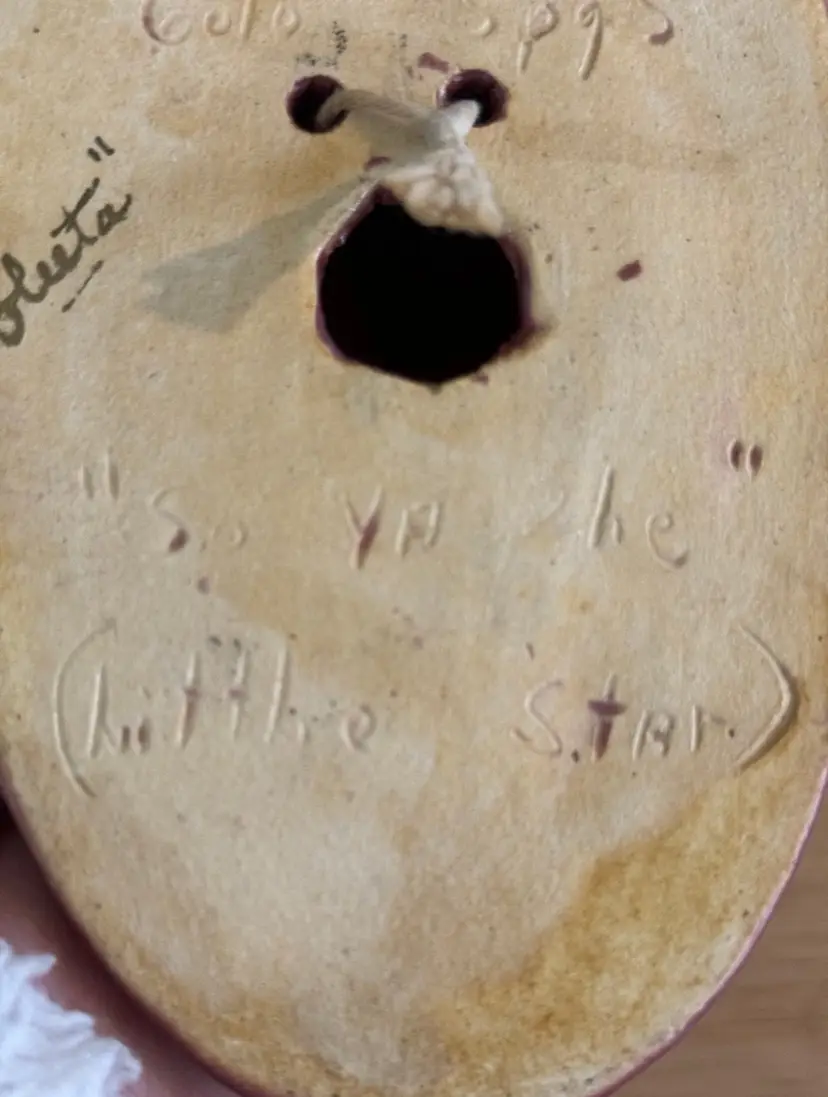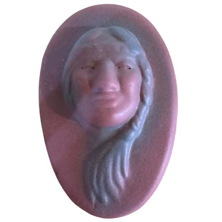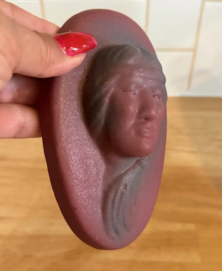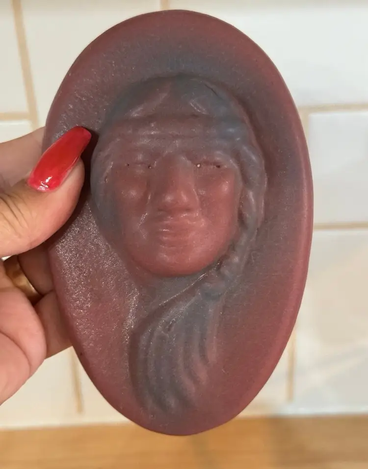 Vintage Van Briggle Pottery "Little Star" Indian Maiden ceramic wall plaque in satin finish maroon. Van Briggle, a Tradition in American Art Pottery since 1899! This lovely 3D face front portrait of a Native girl in a headband and a braid worn to one side is handsome and charming. A collector piece in perfect condition. Width: 3.5 in, Height: 5.5 in, Depth: 1.5 in Signed and has “so ya he” little star inscribed as well as markings. Good early mold! Nice clean features.