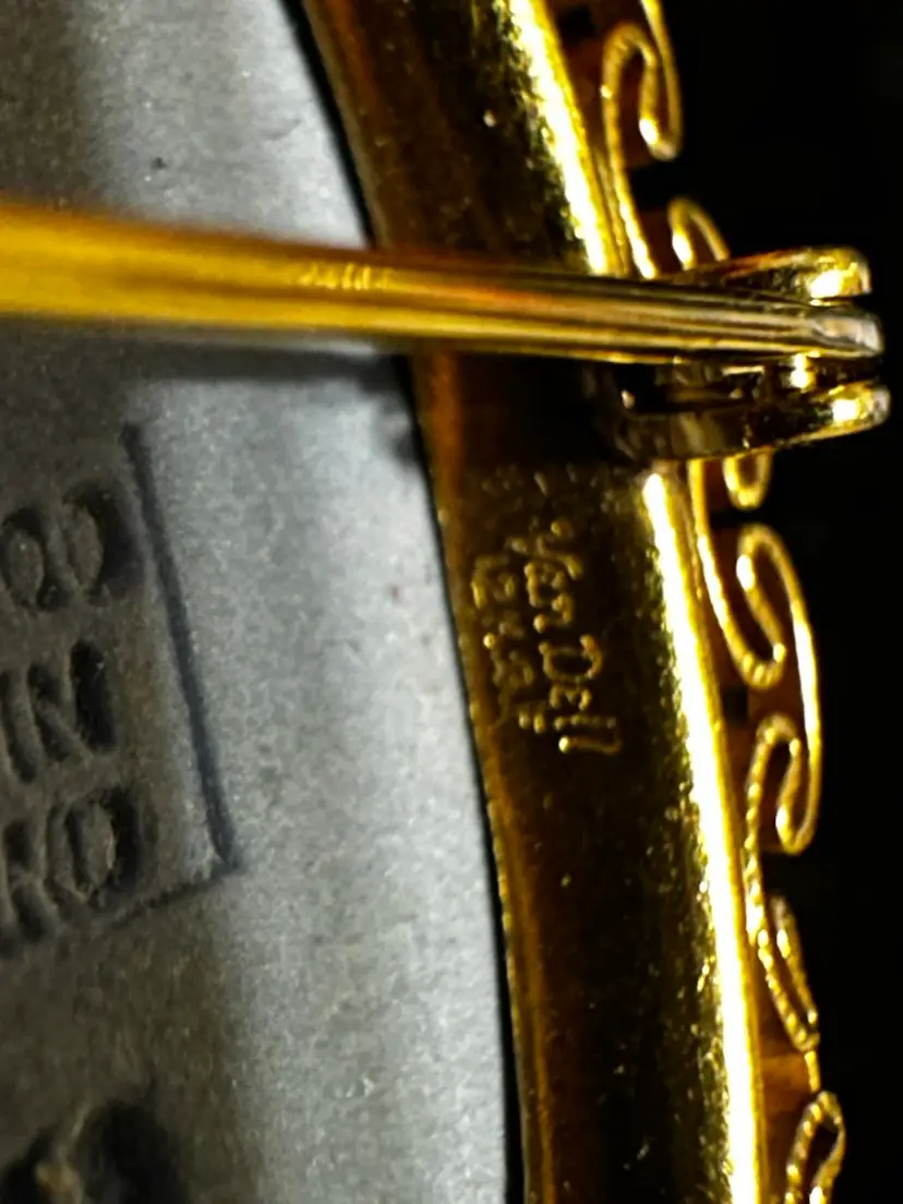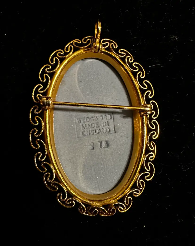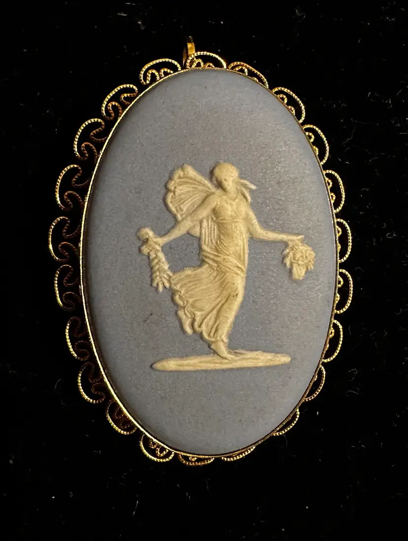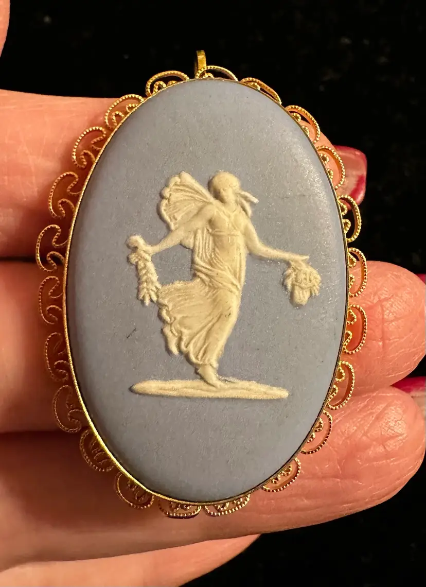 Lovely vintage brooch/pendant made by Van Dell. It is 12k gf frame and set with blue & white Wedgwood jasperware. It measures 1.75” x 1.25”. It is in very good condition.