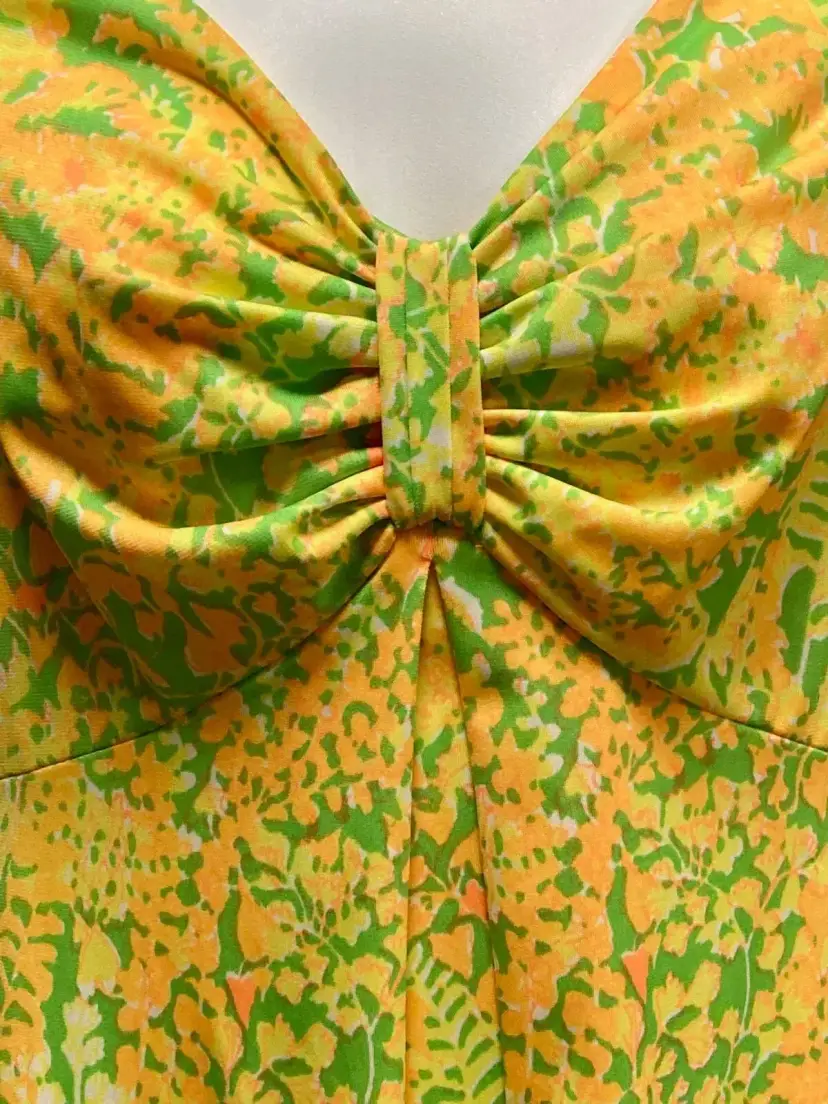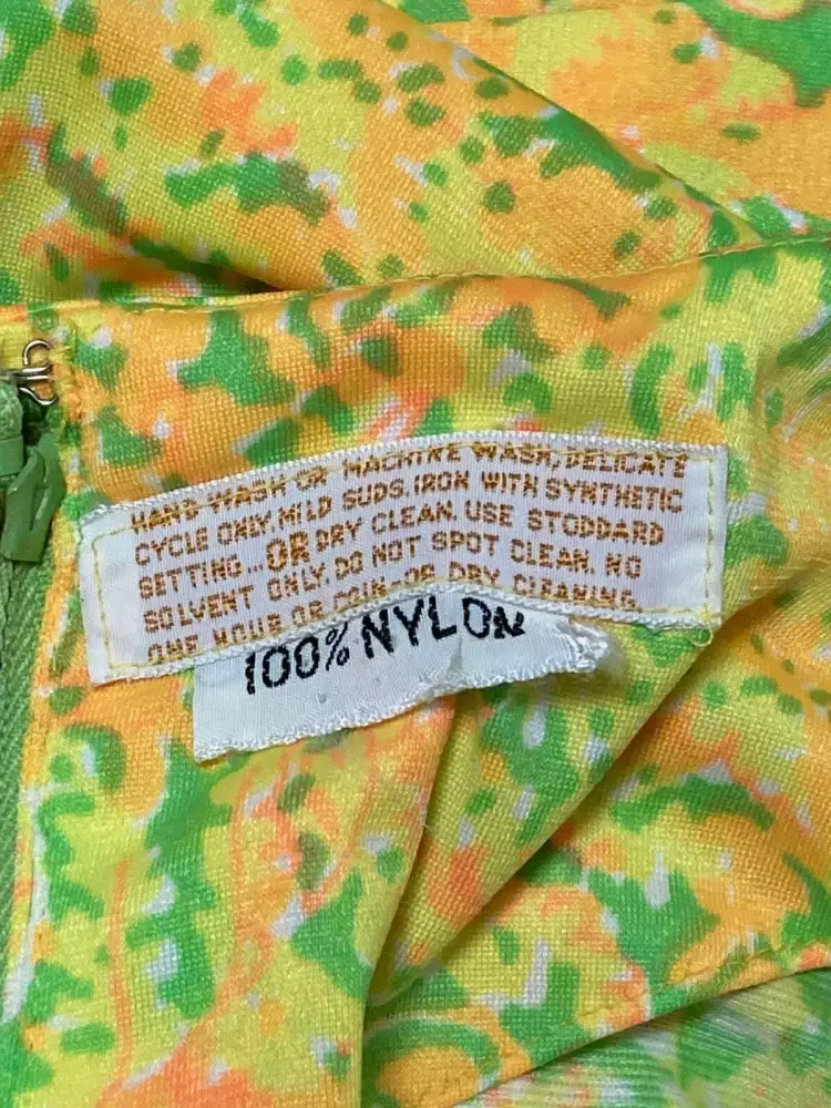 Amazing green, orange, yellow, and white colors. Could use some reinforced stitching in the underarm areas as shown in the photos. Angled hemline. One of a kind!