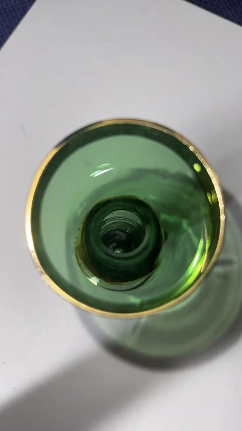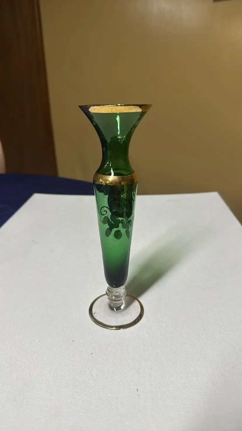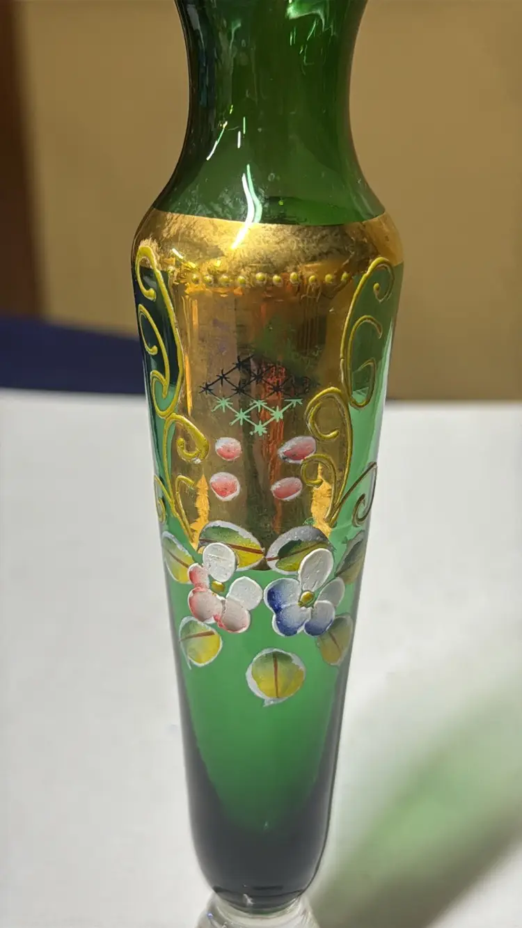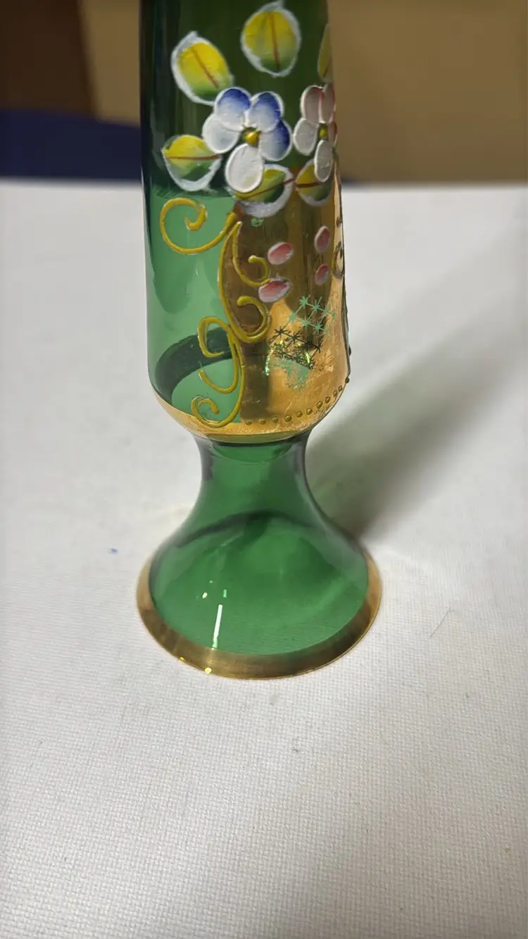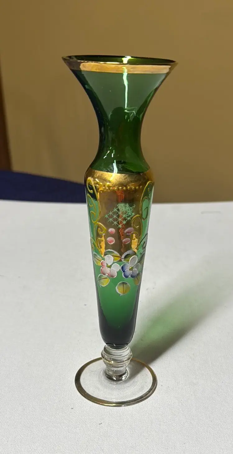 This elegant glass vase features a stunning green hue with intricate gold detailing. Perfect for adding a touch of sophistication to any room. Vintage Bud Vase Green Czech Bohemian with Hand Painted Gold Enamel Flowers 8” tall Excellent condition with no breaks or chips there is some wear of the gold (77171725a)