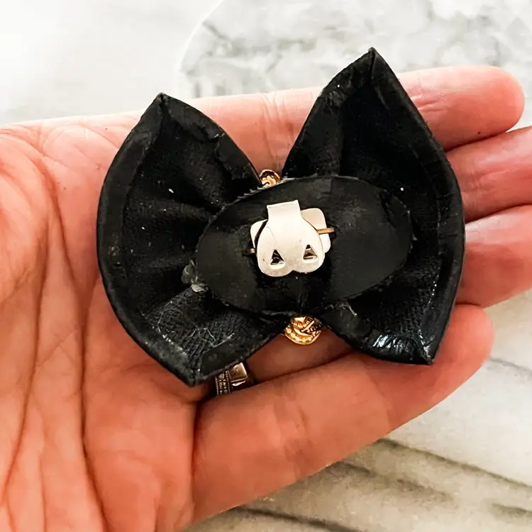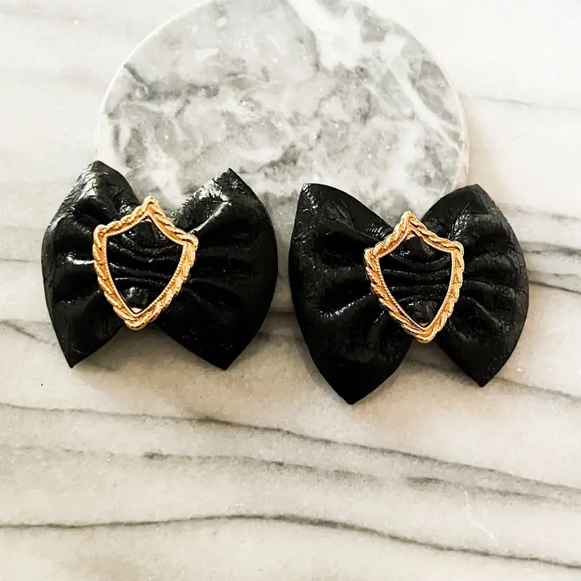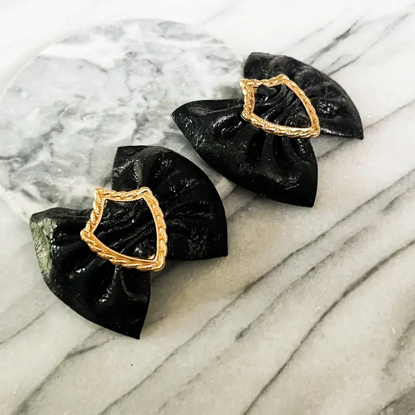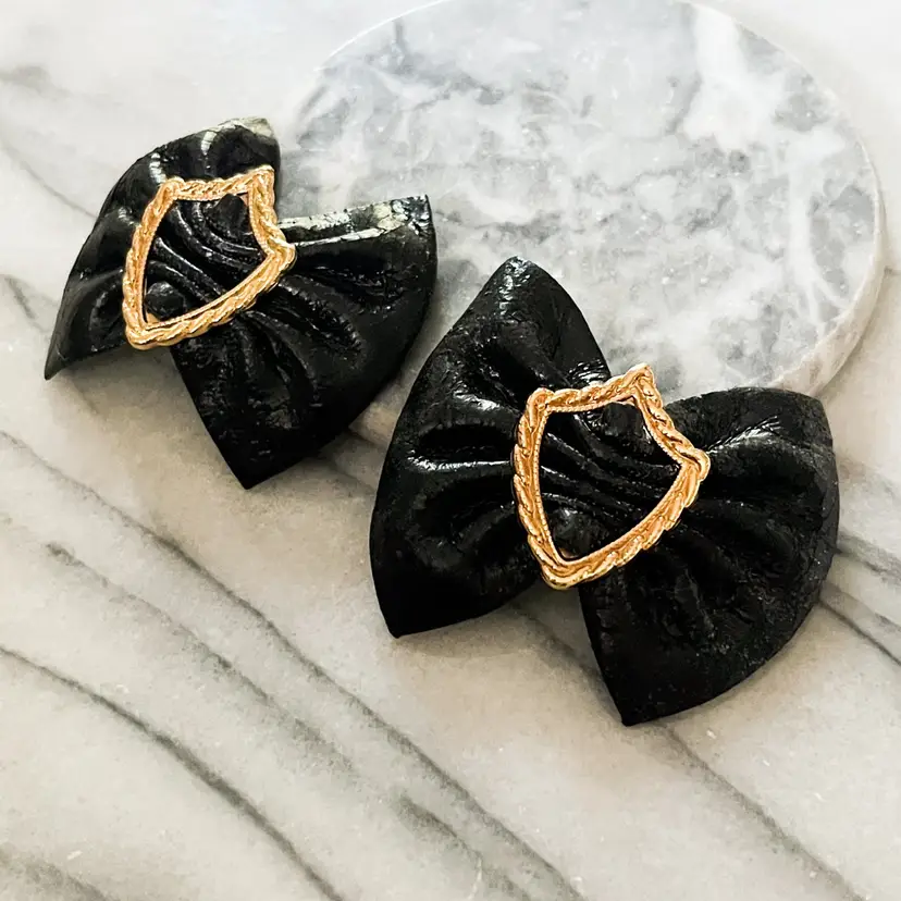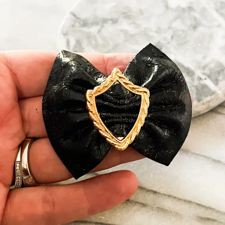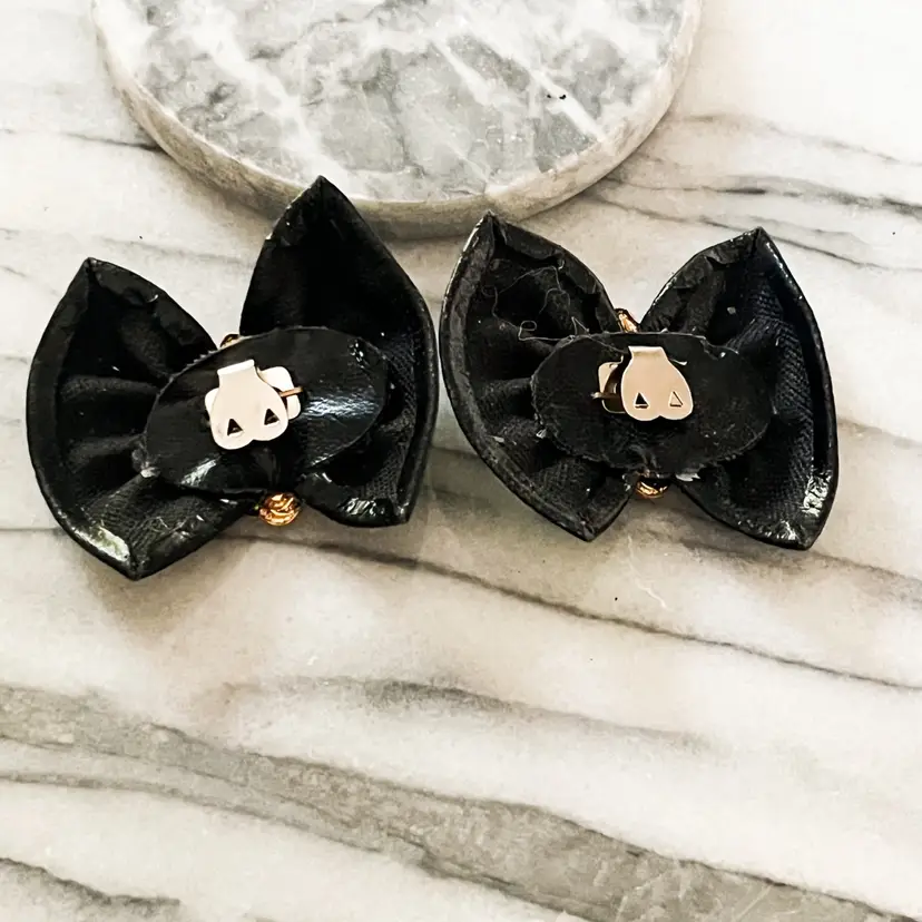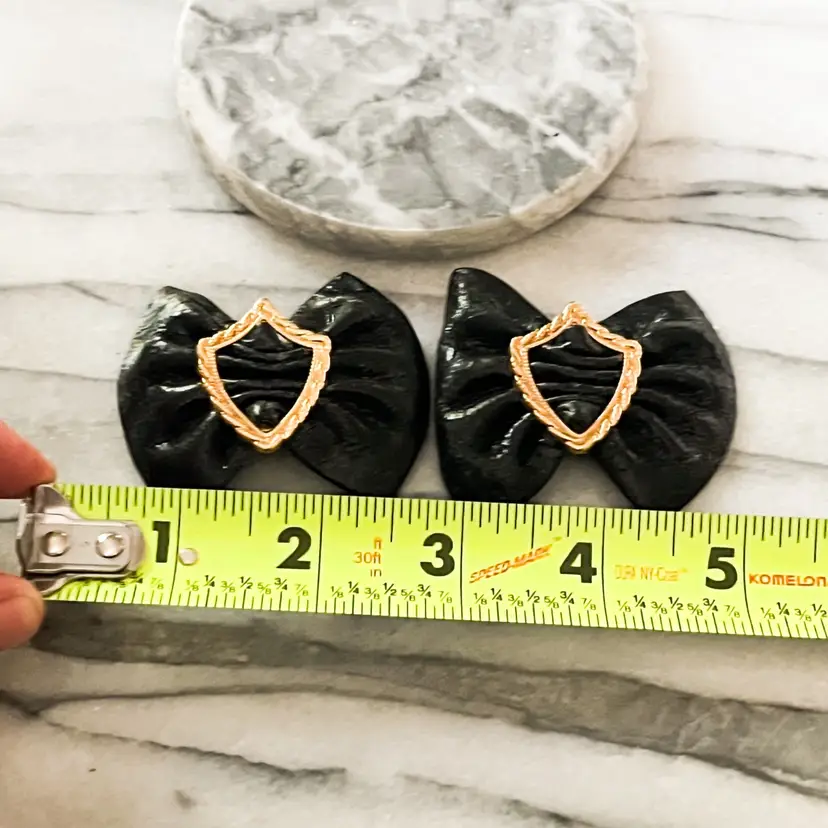 Vintage Vegan Leather Bow Shoe Clips Black with Gold Toned Metal Hardware 1980s design Say hello to retro glam!