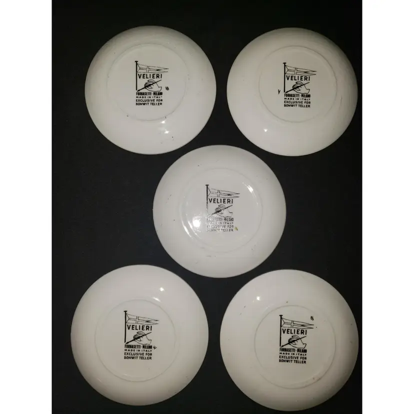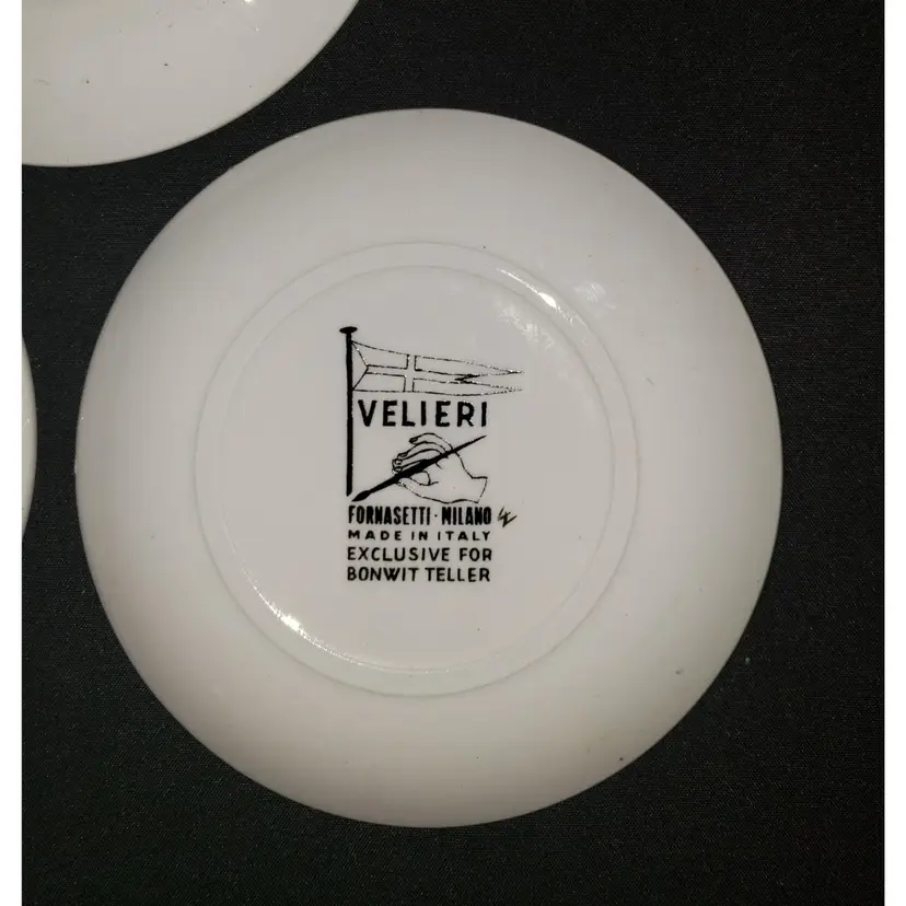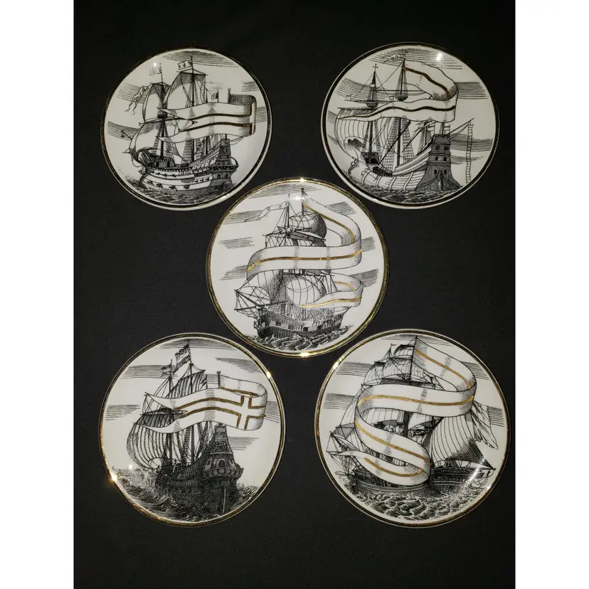 Each of these amazing vintage coasters/plates show a different tall ship. They are designed in black and gold on white porcelain with gold rims. All color is in very, very good condition. No cracks or major chips. There are a couple of very minor flea bites on the edge of two. Each measures 4" in diameter.