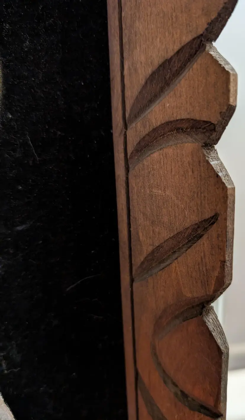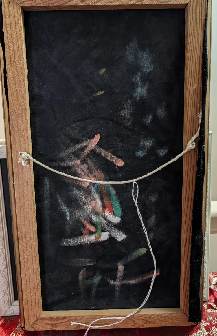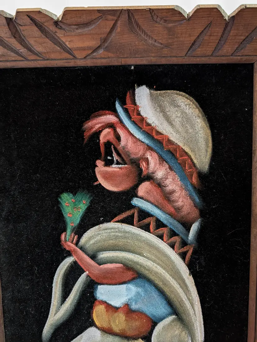 Charming vintage velvet painting featuring a whimsical character in traditional attire, set against a rich black background. The piece is beautifully framed with a carved wooden border, adding a rustic touch. Piece is used but is in Amazing condition with no cracks or chips and no tears but does have a small worn spot on bottom right edge from sitting on the floor of antique store but is not noticeable at all when displayed but does make piece AS IS. Perfect for adding a unique flair to your decor. The painting measures approximately 22.5 inches height with 13 inches width and a frame thickness of 2.5 inches. A delightful addition for collectors of folk art.