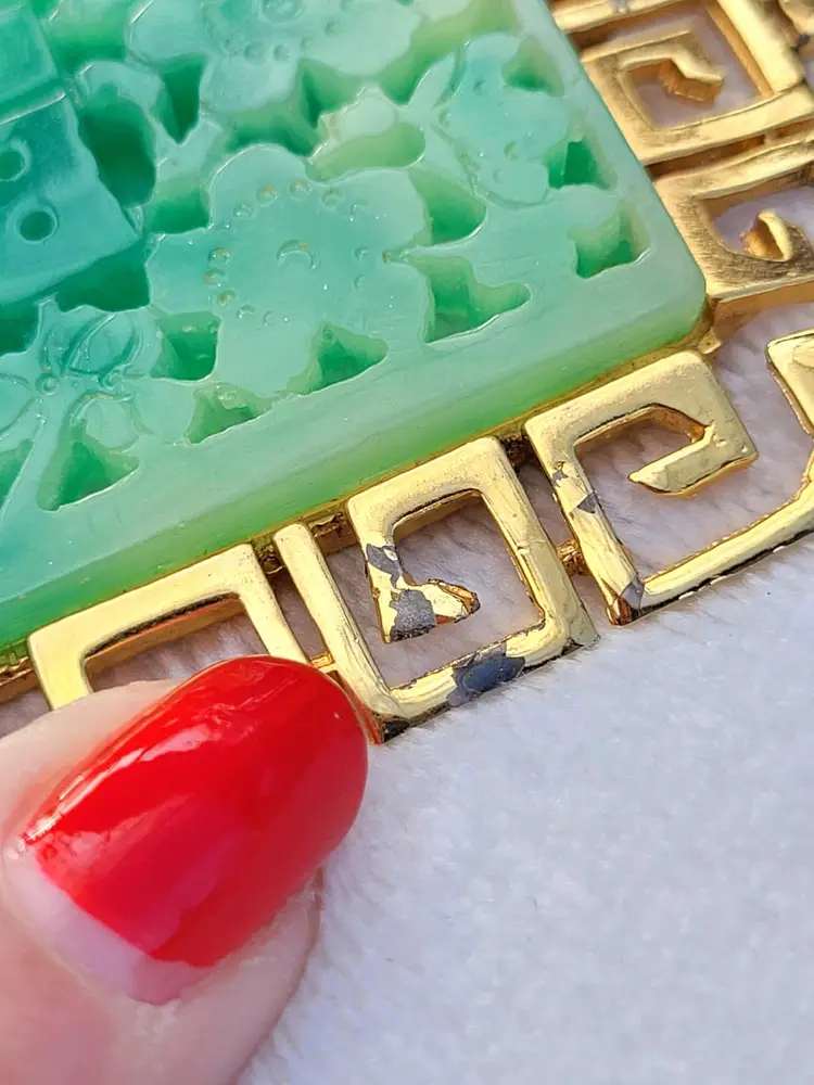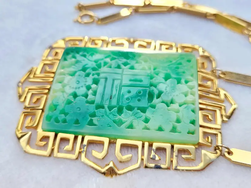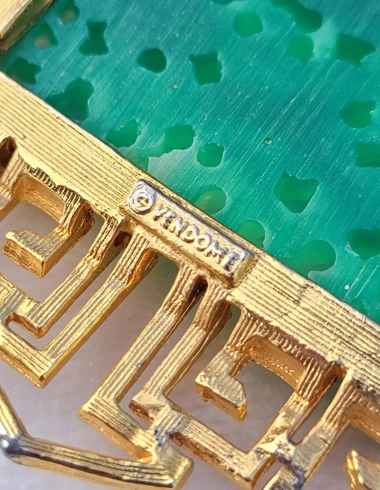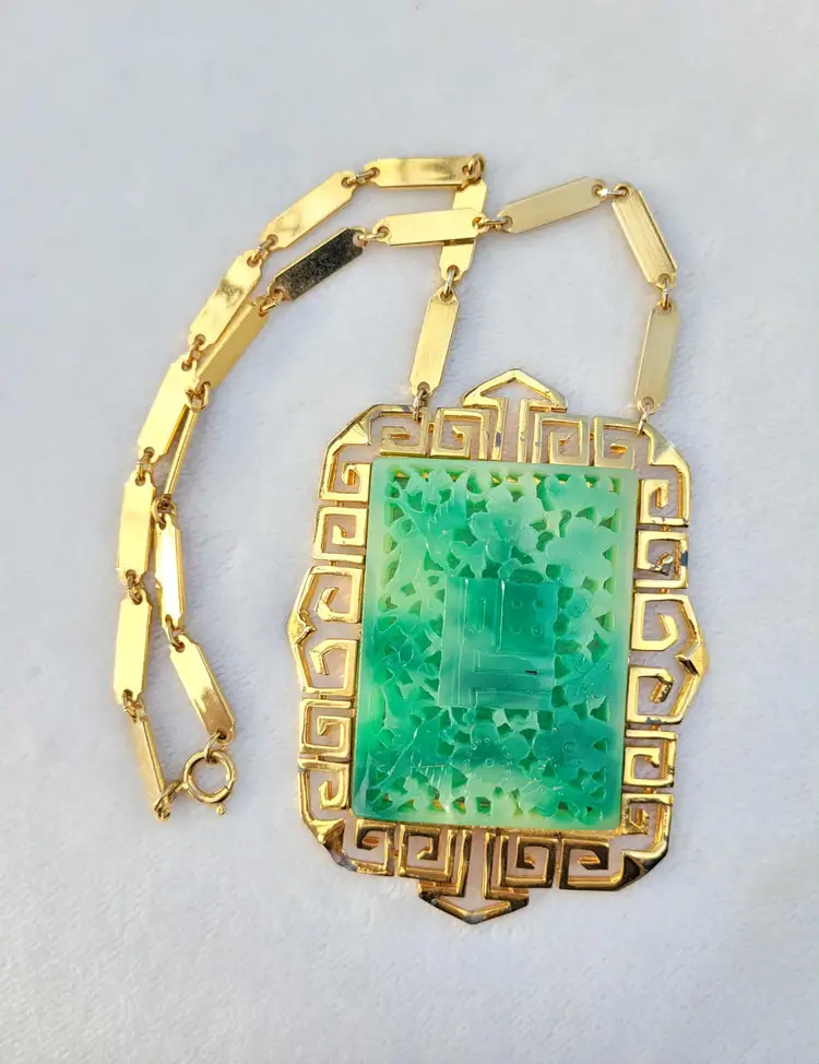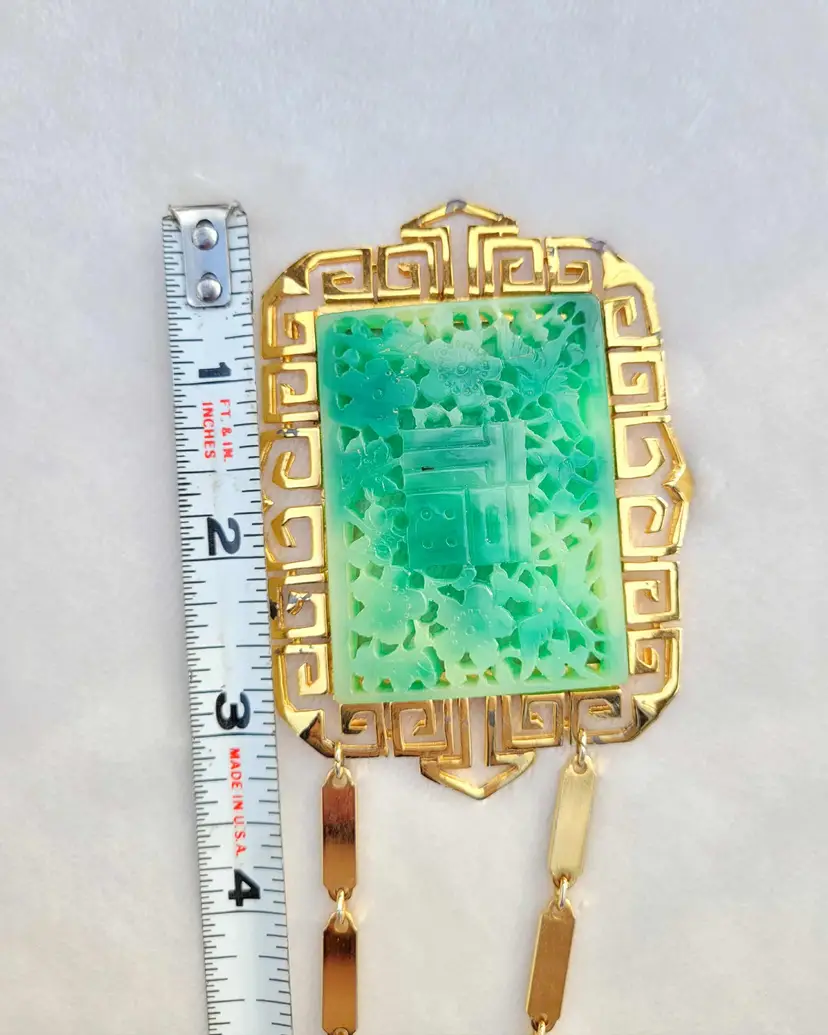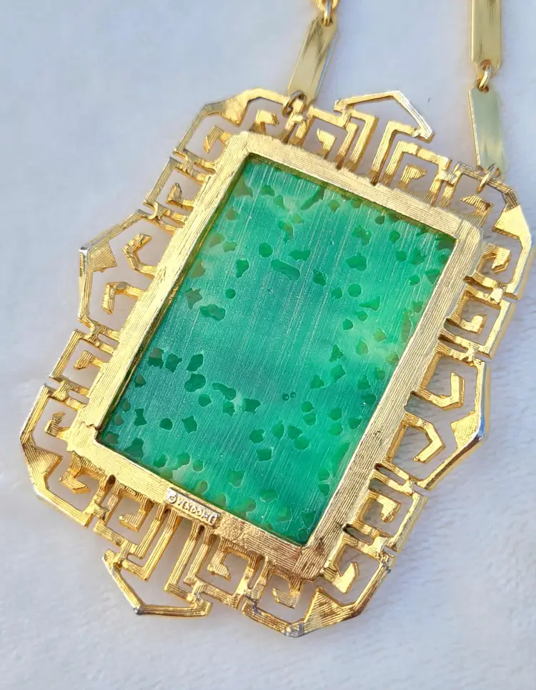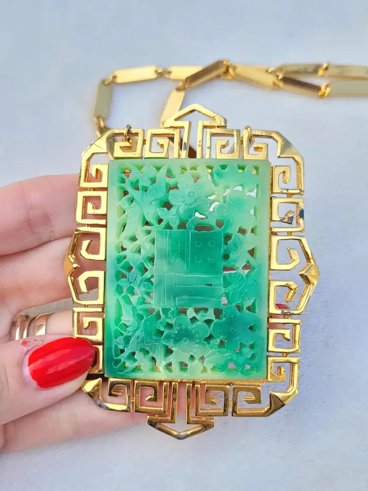 Massive Asian-styled pendant necklace, circa 1970s and signed by designer Vendome! This is in good condition from an estate, with the only flaw being some wear to the gold plating that I've pointed out in pictures. Please see pictures for details and measurements.
