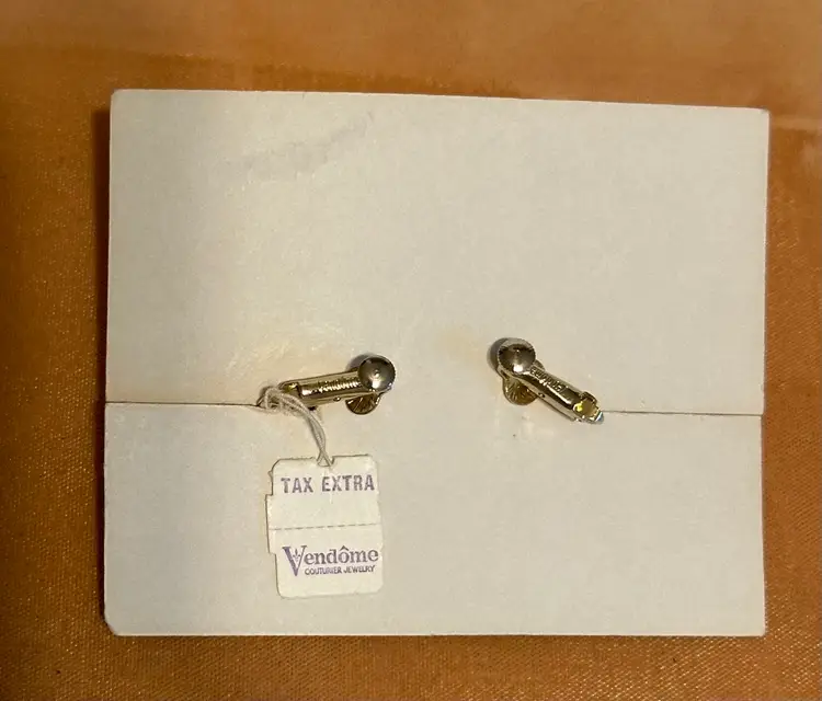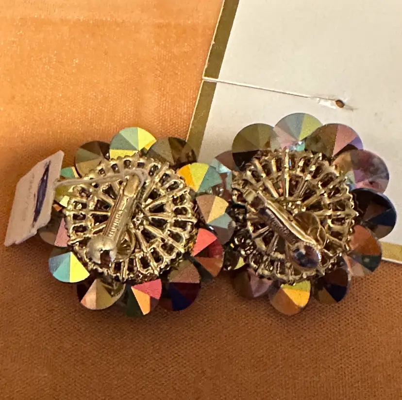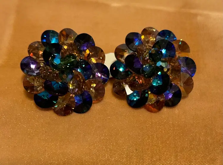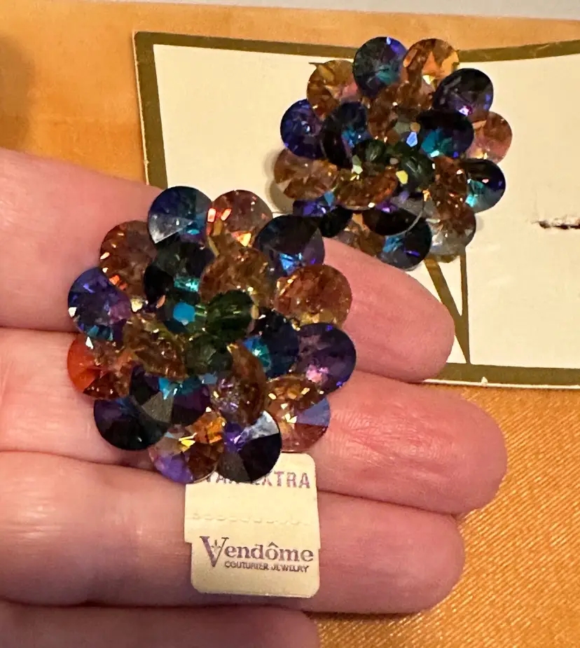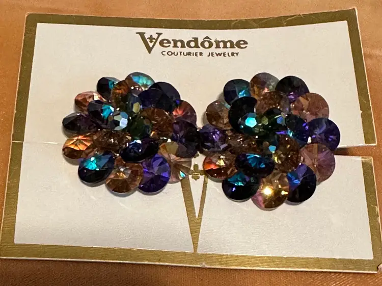 Wonderful vintage Vendome earrings on original display card. Also has hangtag. They have AB blue & citrine colored crystal rivoli beads. The earrings are 1.5”. Excellent condition.