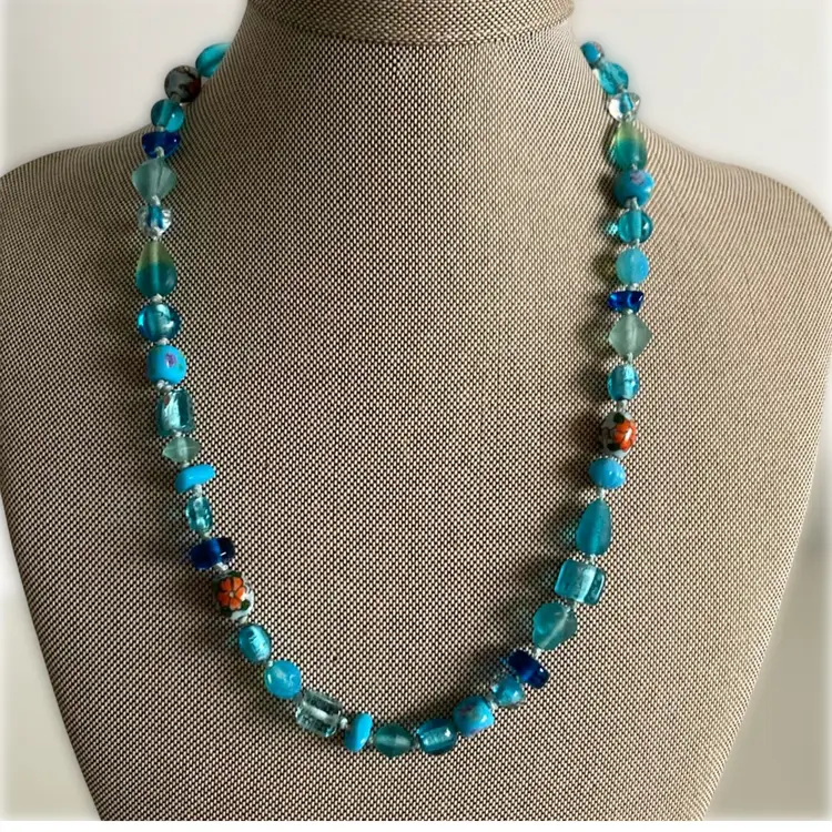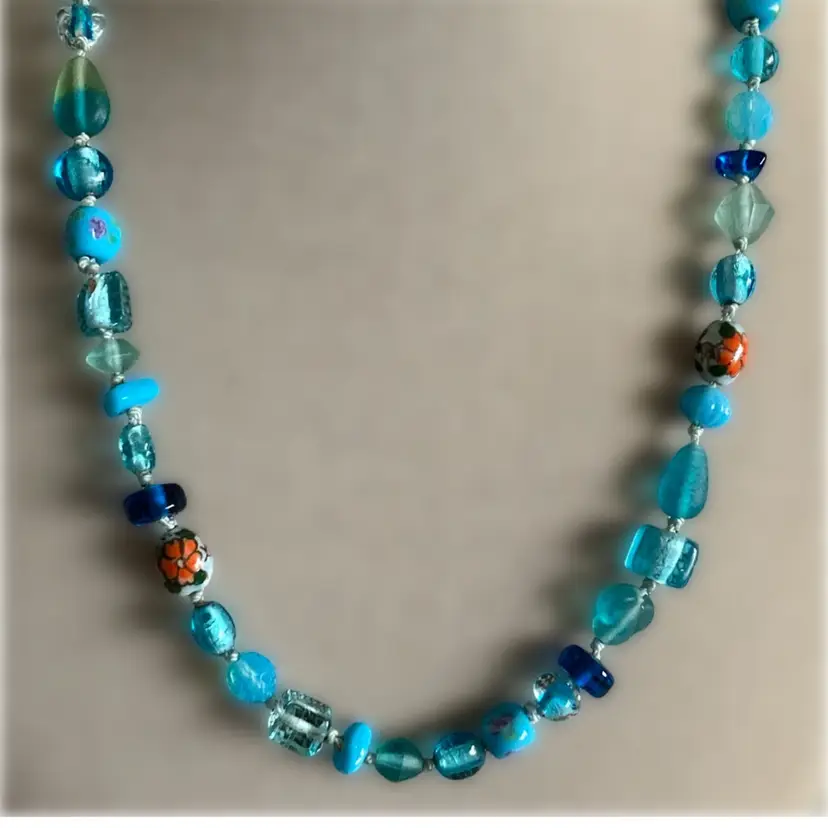Vintage Venetian beaded necklace in cool blues. Necklace measures 19” to 30” with adjustment. This is an upcycled design using vintage beads and findings.