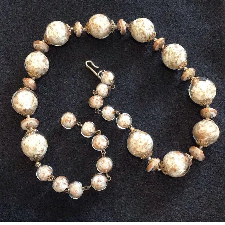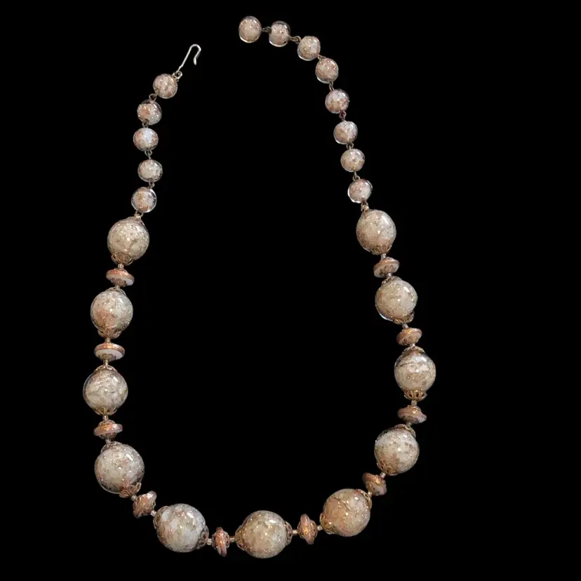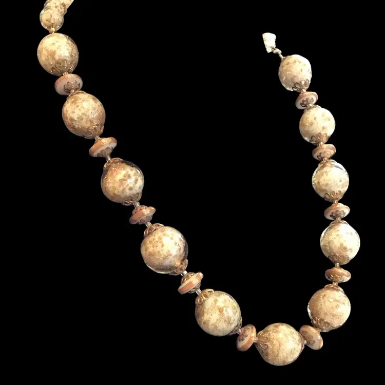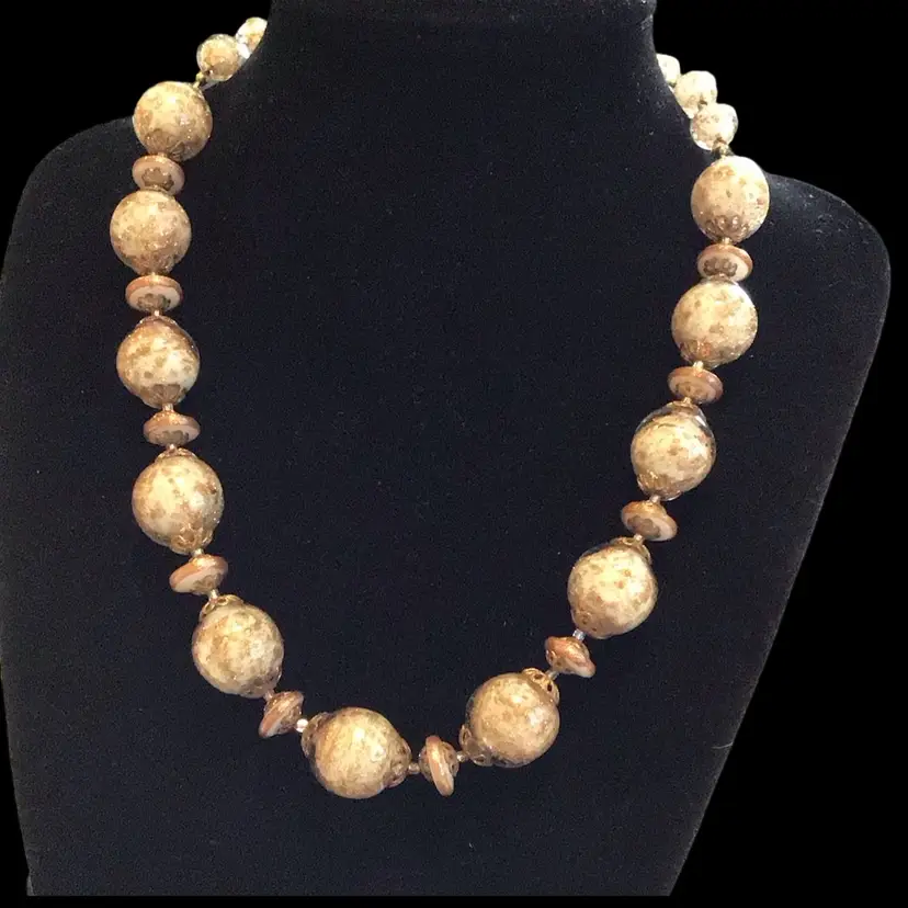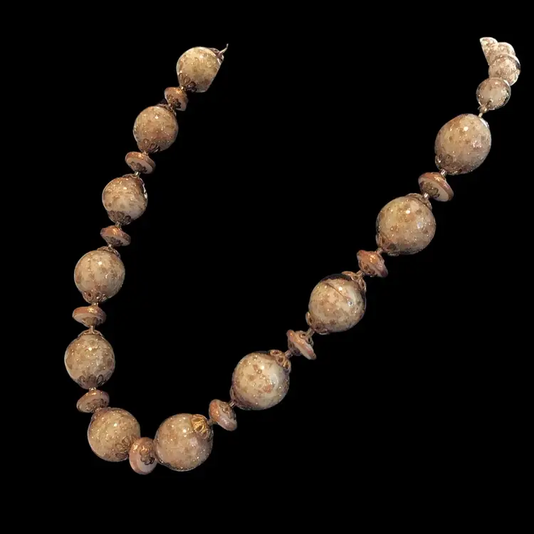 18” Venetian beads made with copper particulate gives shimmer & shine, large beads have filigree caps as well as disc shaped beads in between. Replaced hook closure. #320