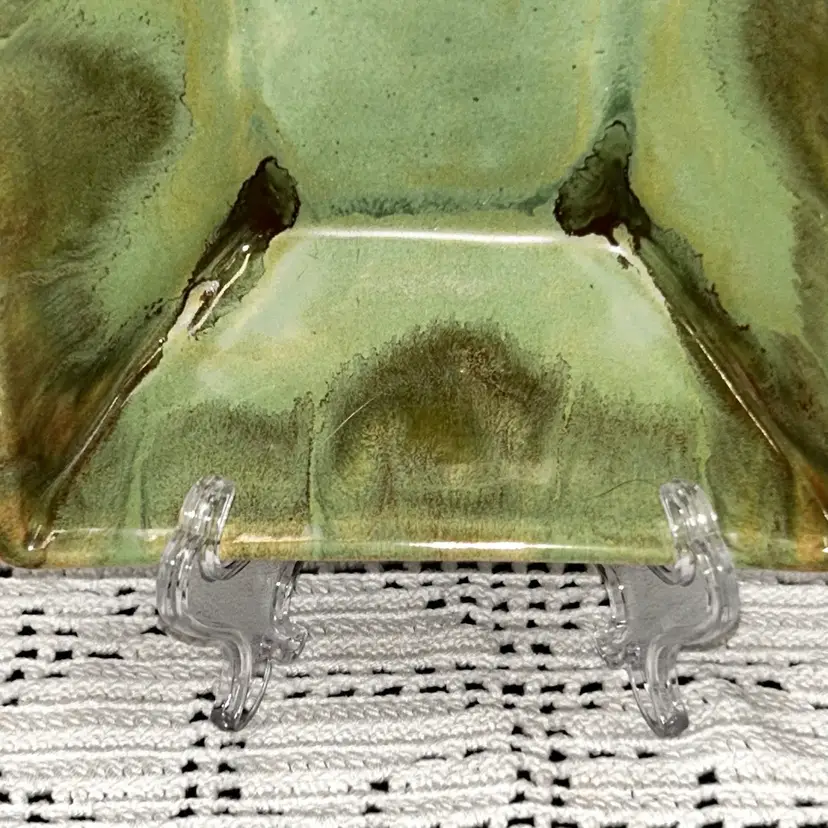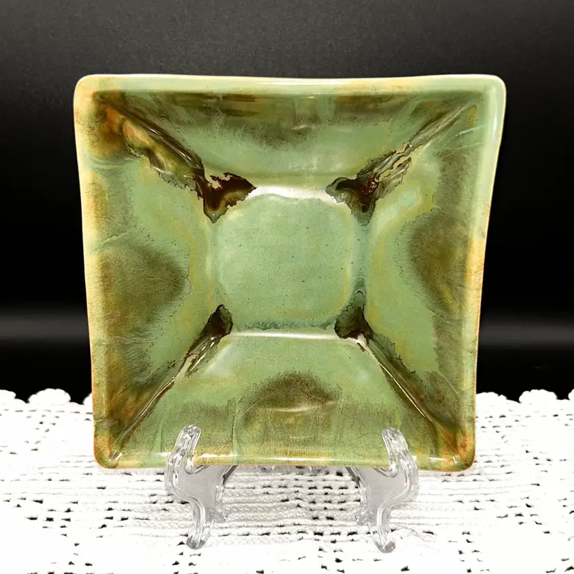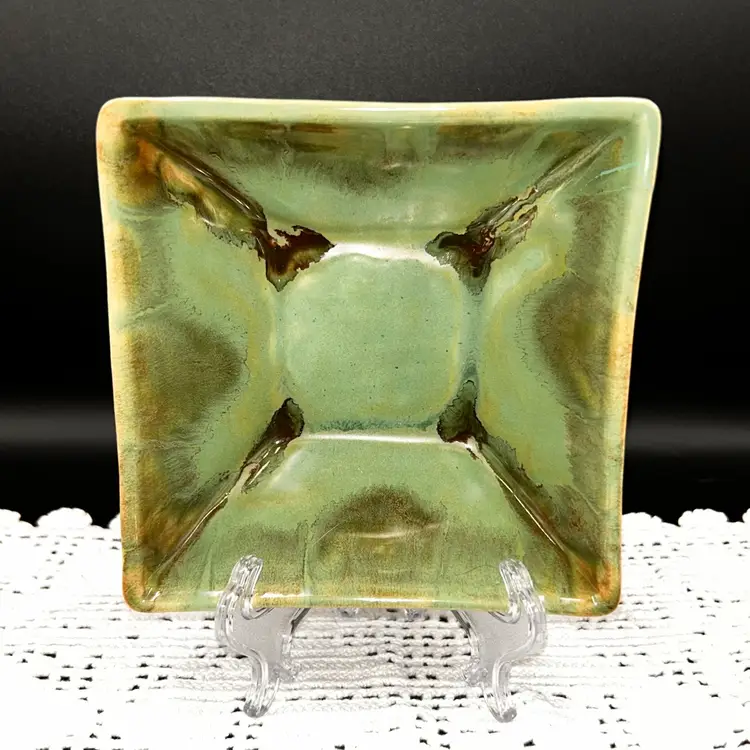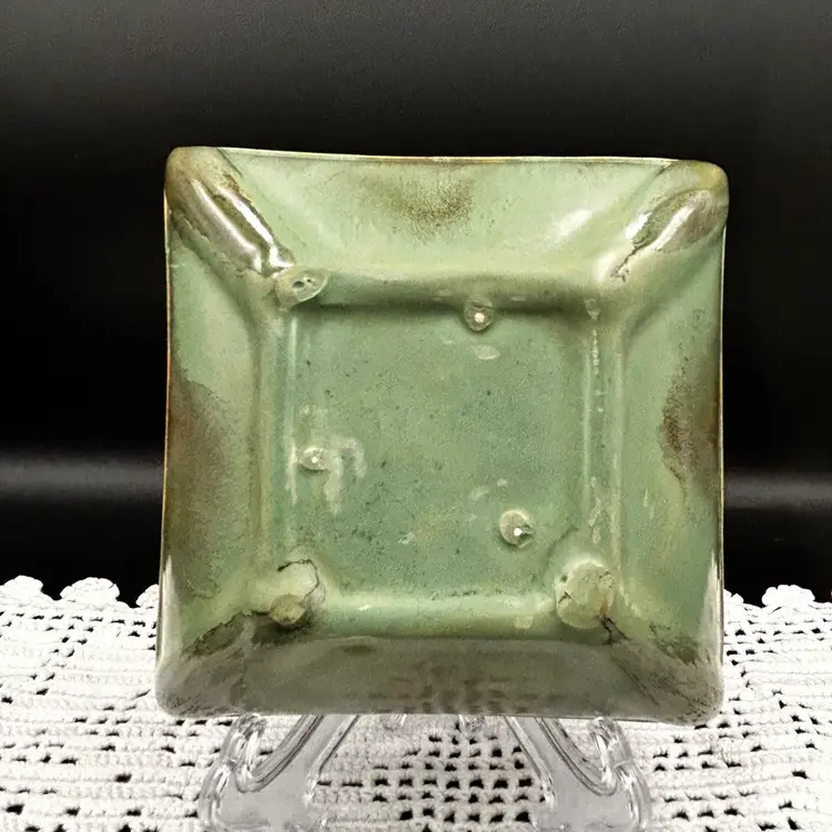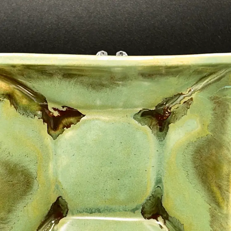 Company only in business 1940-1949 featuring very unique, in-house developed glazes on limited edition pieces. Bowl is 5” square, 2” tall. Excellent condition, no chips or cracks. Guppy’s mark barely visible.
