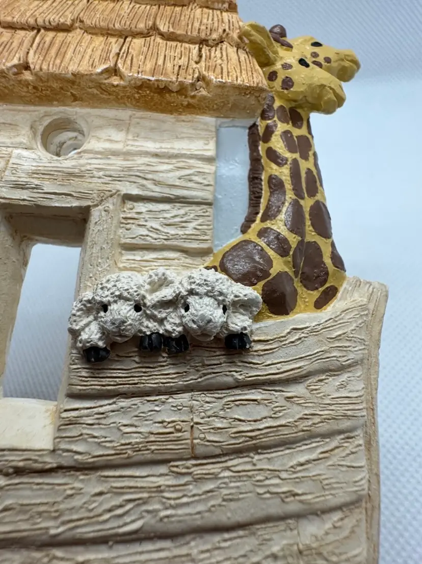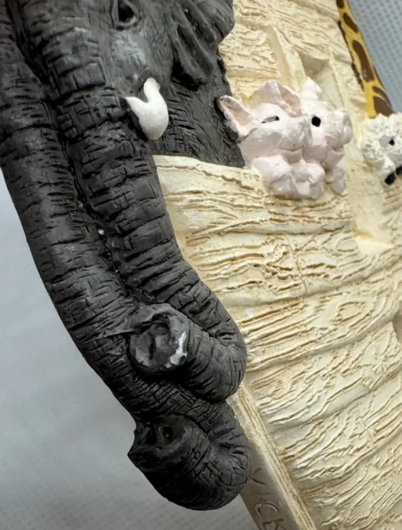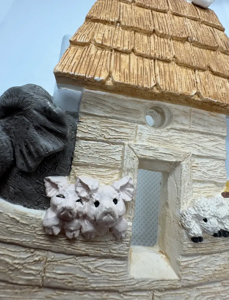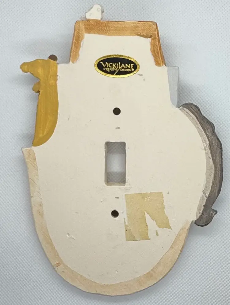 Vintage Vicki Lane Creative Designs one-toggle light switch cover featuring a Noah's Ark design in 3-D. Includes giraffes, elephants, lambs, pigs and birds. Ceramic and painted in a matte finish. There is a tiny chip in the paint on the elephant’s trunk, and the top of the roof. Both could be touched up. No other chips, cracks or repaired spots. Does not include screws. Measures 6.75” tall from the bottom of the ark to the tip of the bird on top of the roof and 4.75” across from the edge of the elephant’s trunk to the tip of the giraffe’s nose. Perfect to compliment a nursery.