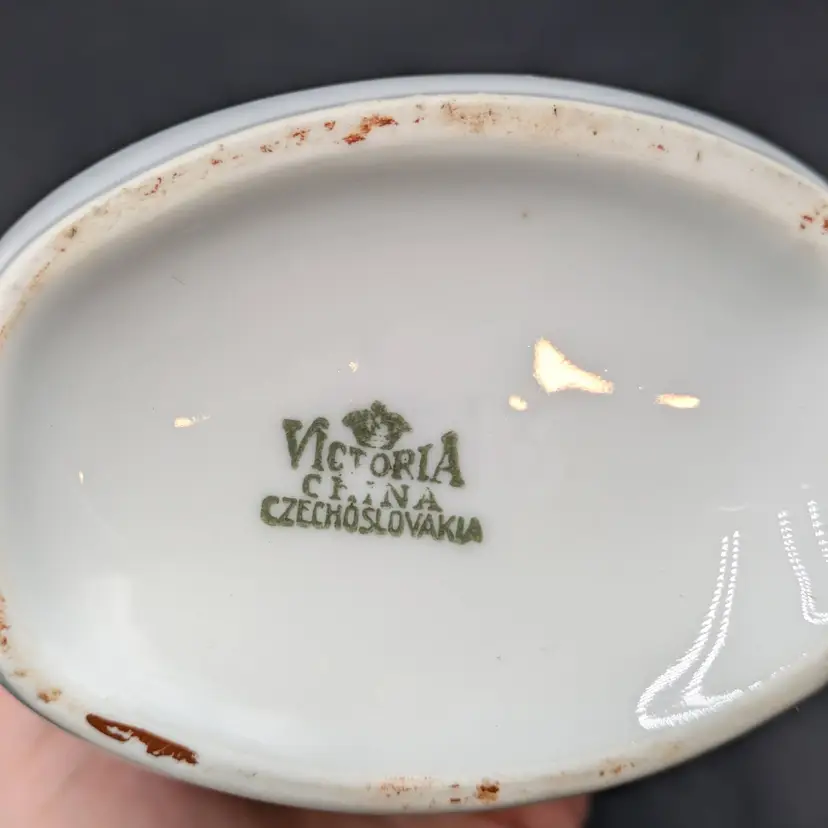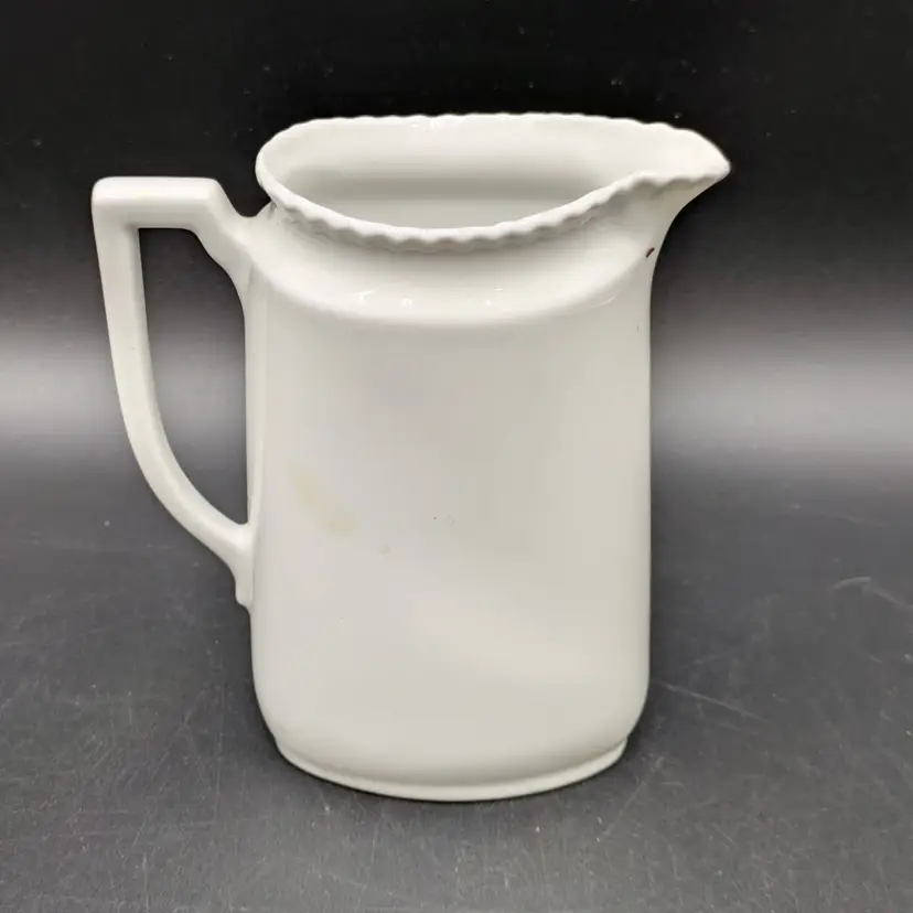 Floral creamer with some signs of wear but no chips or cracks. 5-1/4" tall, 2-1/4" wide, 4-3/4" from spout to handle. The opening is oblong rather than round.