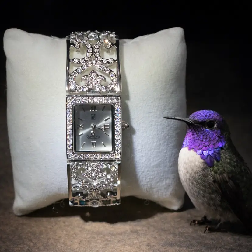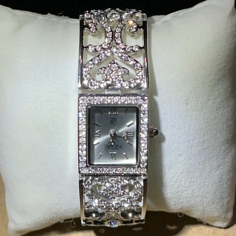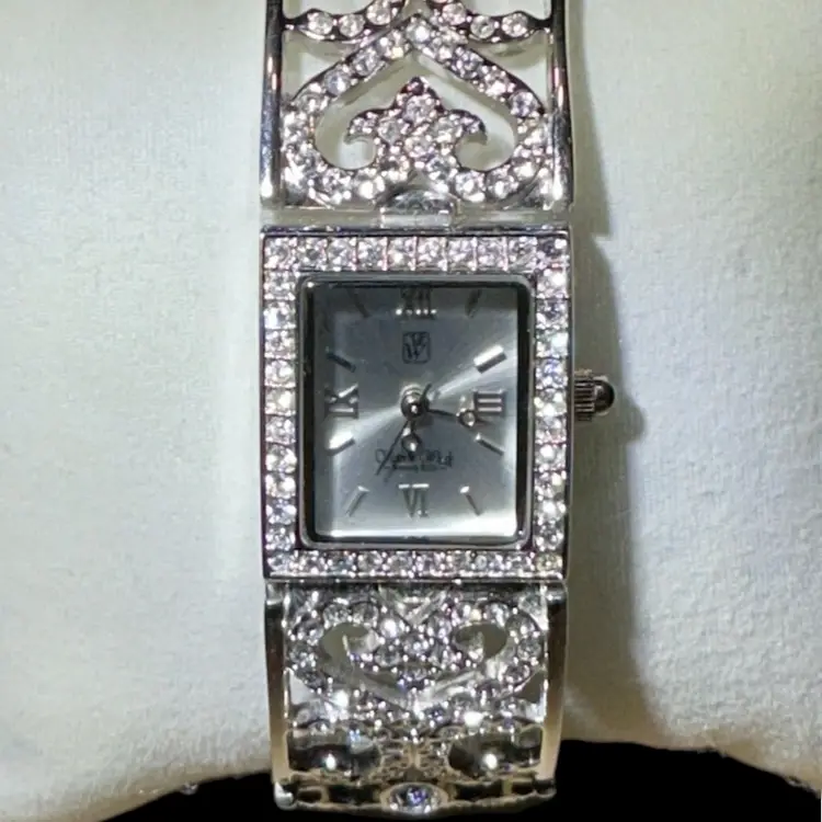 Designer: Victoria Weick Metal: Silver tone Stones: Clear rhinestones (all present) Closure: Fold-over clasp Length: 6.75” Condition: Excellent vintage condition Brand new battery installed