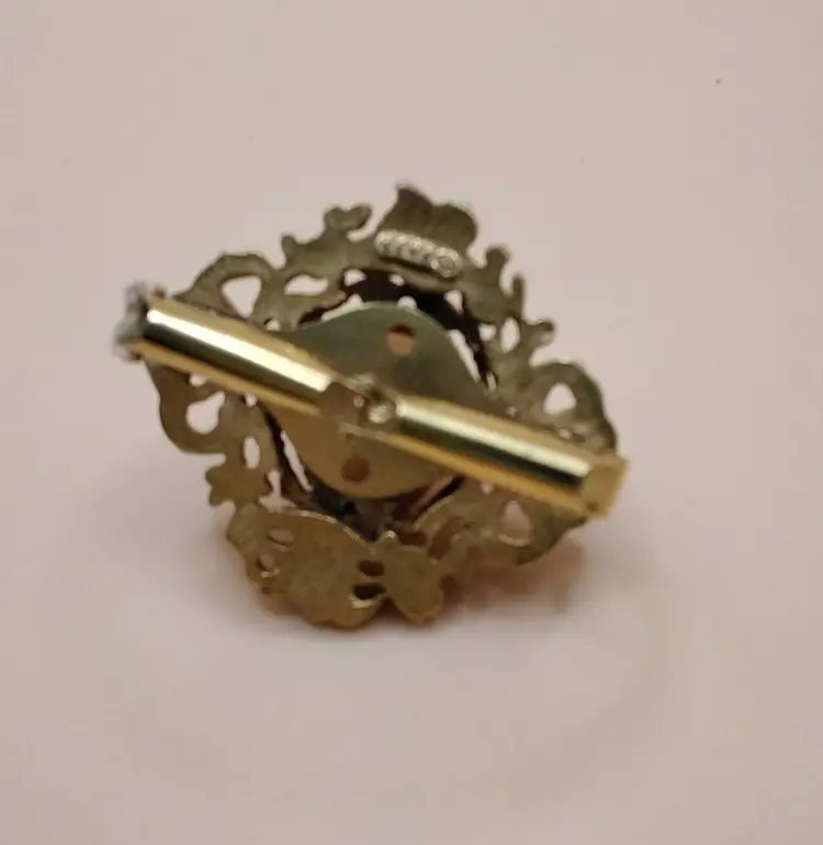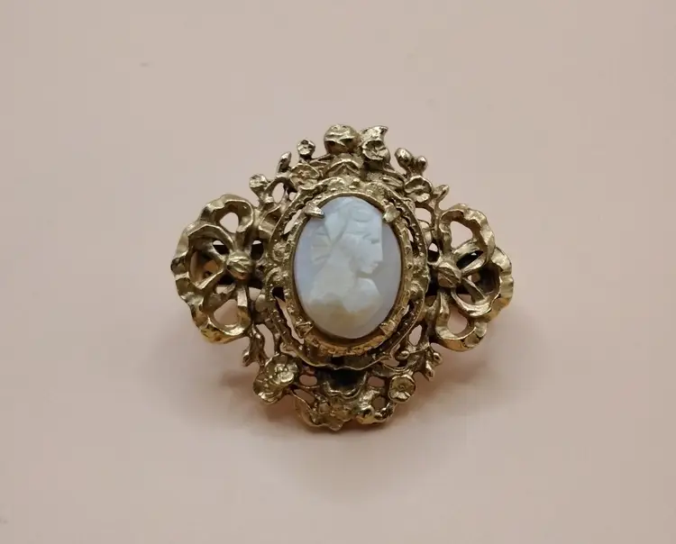Vintage Victorian Hand Carved Champagne colored Oval Cameo Scarf tie Brooch. Has Geno on back. 1960's. Gold toned. Expandable bar on back. It is 1.6 inches by 1.6 inches. In very good Vintage condition. Photos are part of the description.