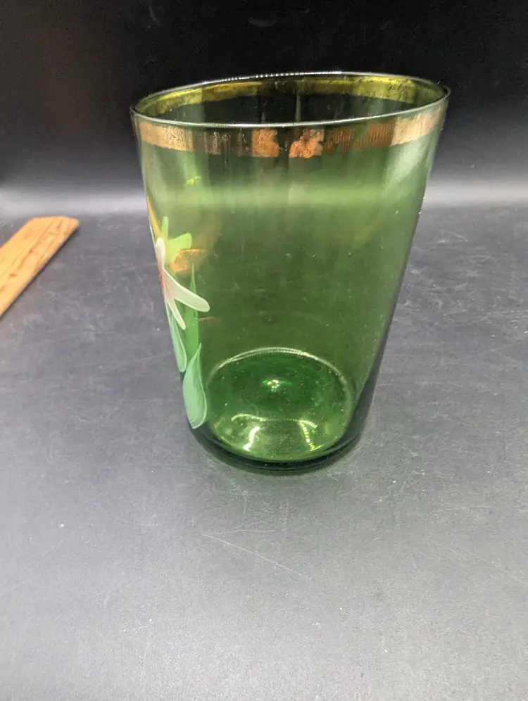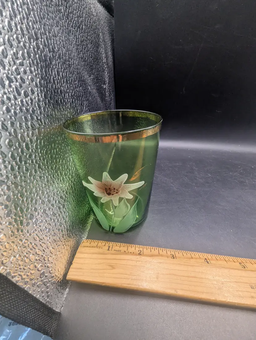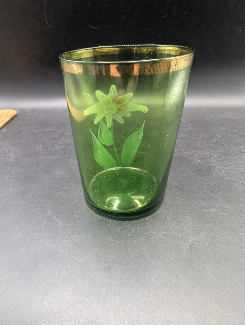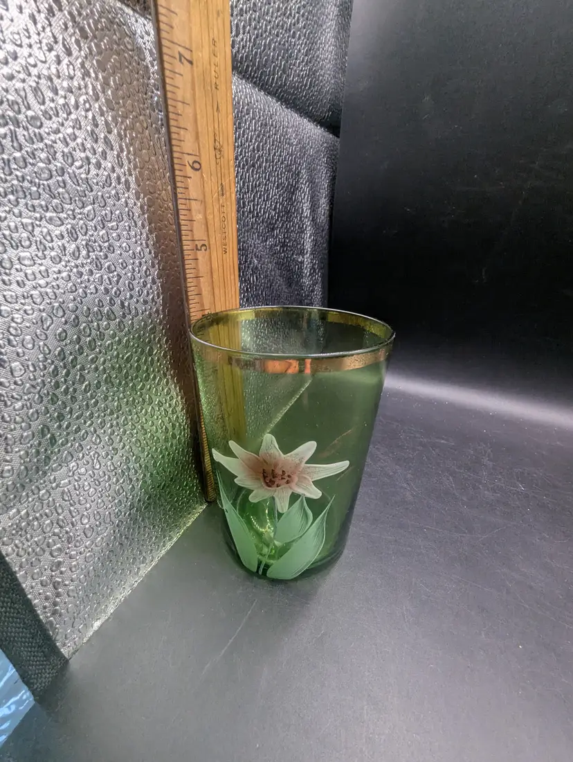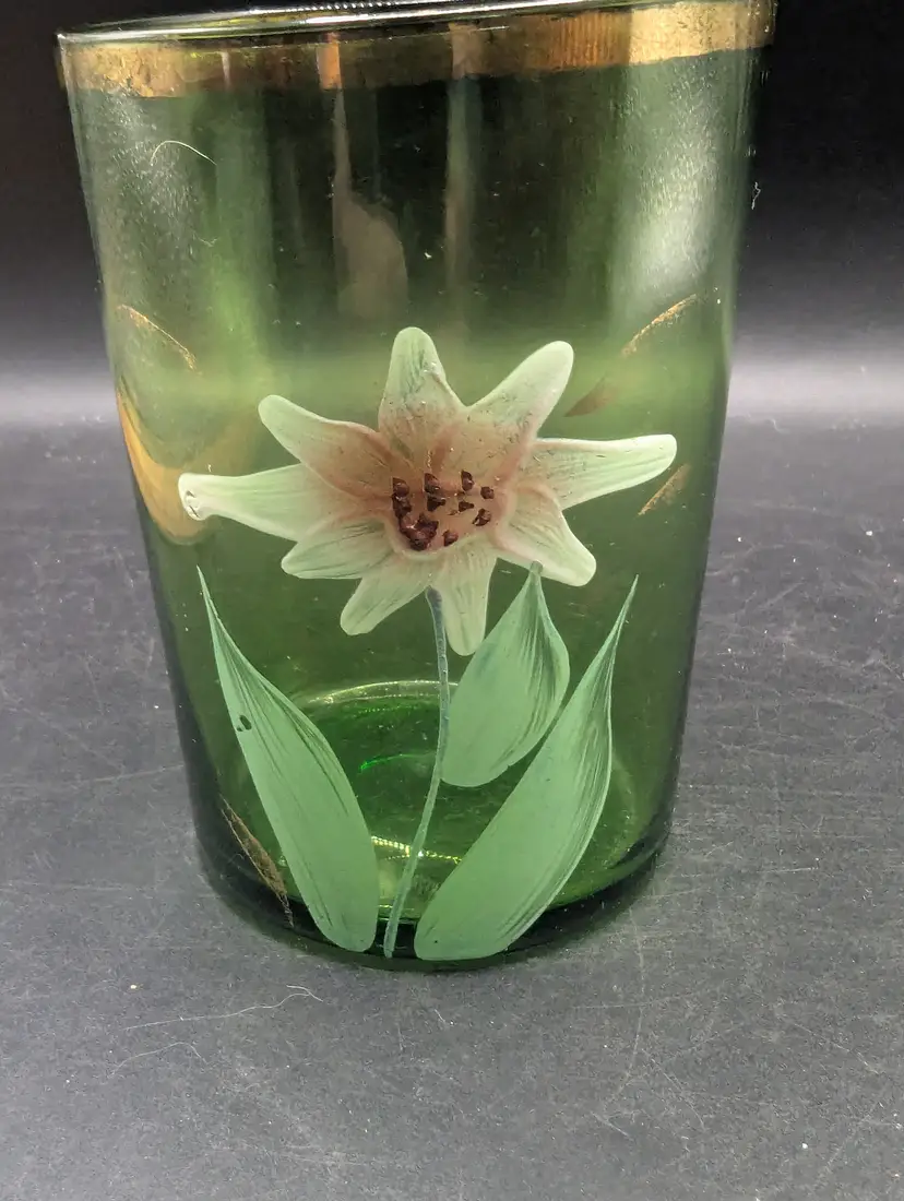 This is a lovely Vintage Victorian Frosted Green Glass Tumbler 4” Hand Painted Floral. No chips or cracks. Please see all pictures for details and measurements.