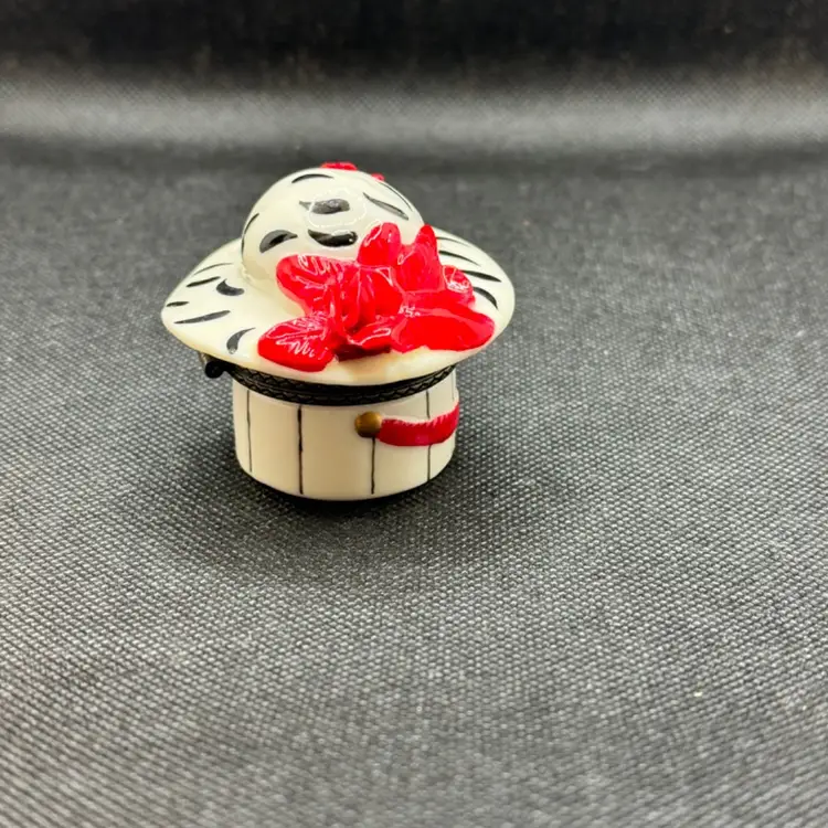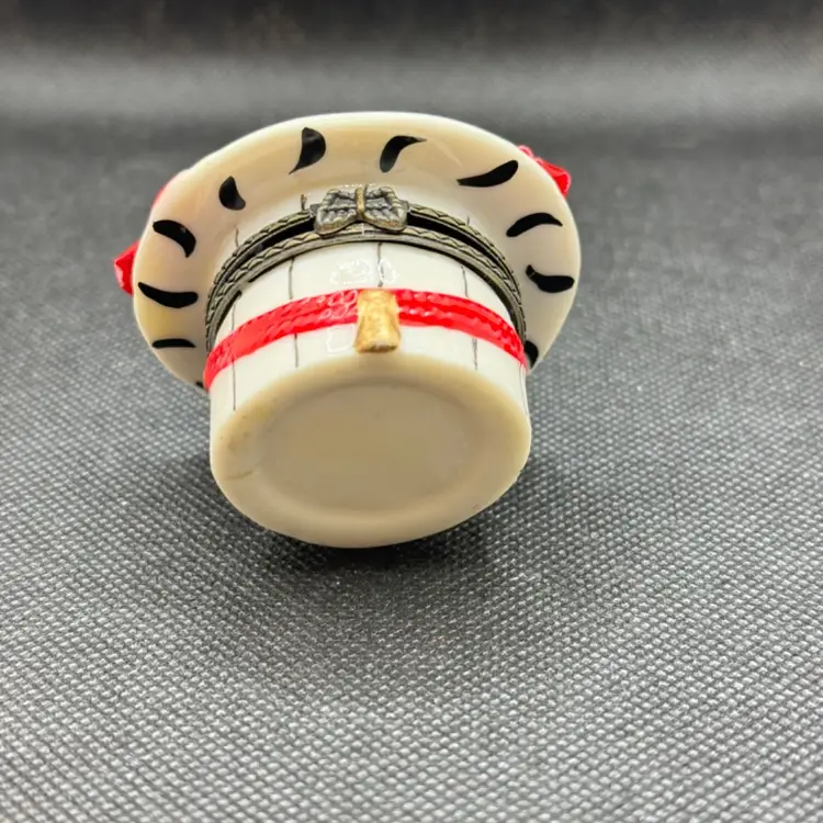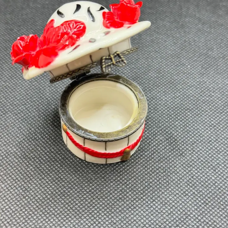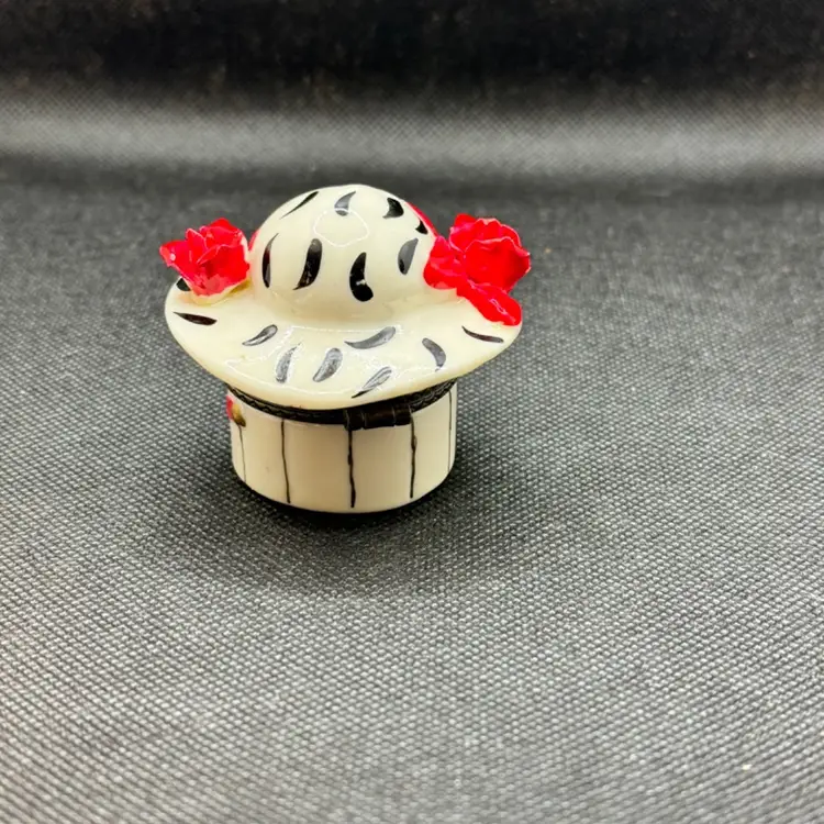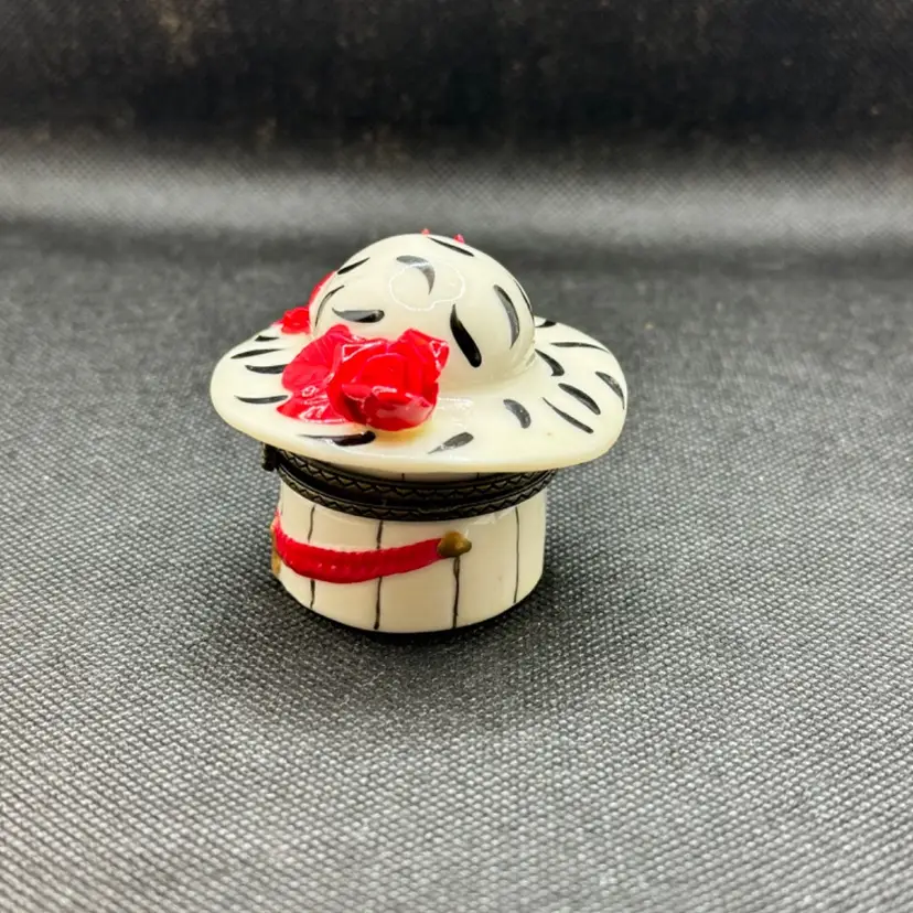 Vintage victorian hat box shape with red roses hinged lid trinket box, unbranded, made in China. Very pretty & cute. Perfect in any room or occasion. No chips or cracks. Measures 3x2.5x1.5. Weighs 4oz.