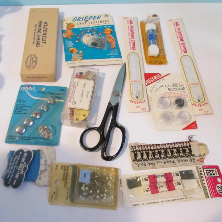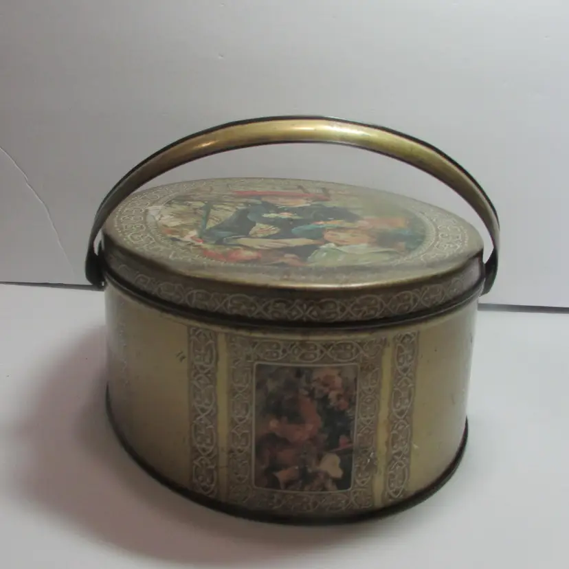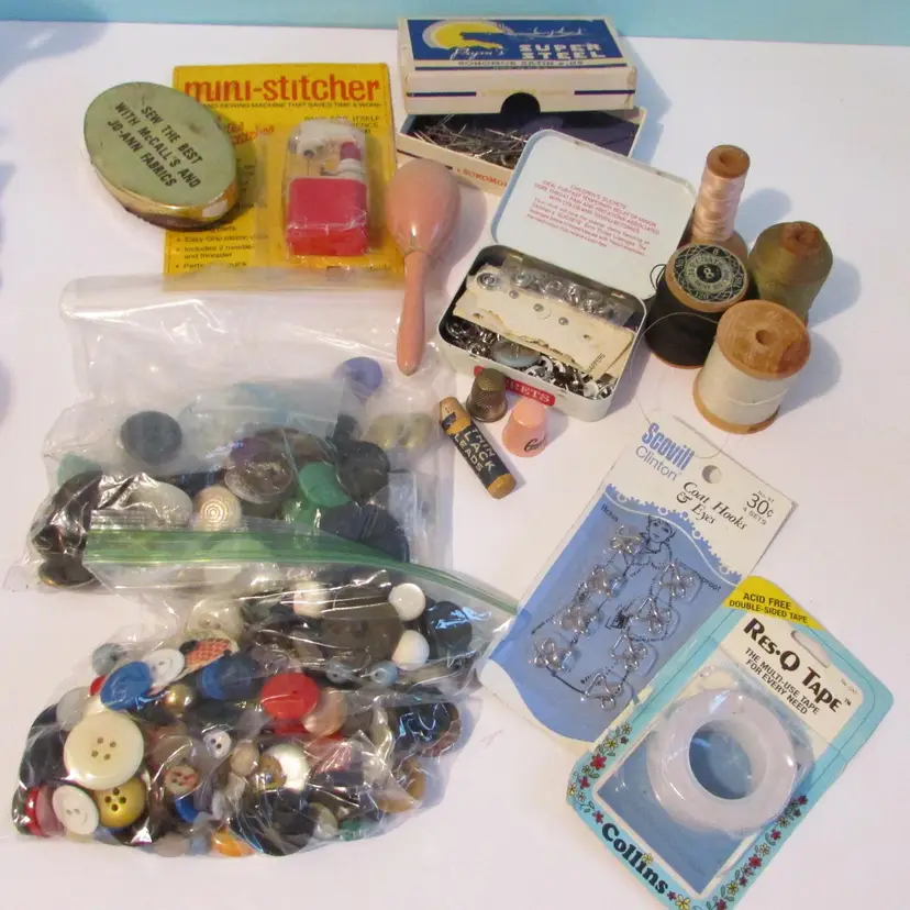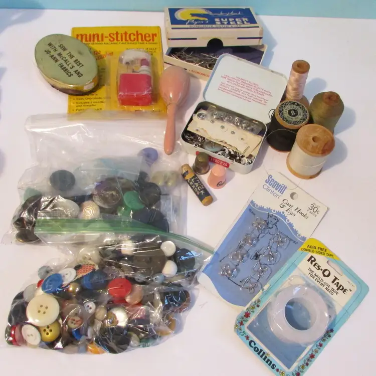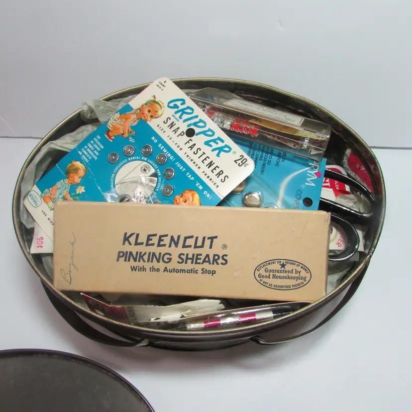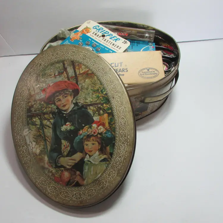This sewing tin is filled with different vintage sewing supplies. The tin and supplies have some wear, but still a nice piece to display. The tin is about 2 3/4" x 7" round. This is shipped from a smoke free home. Thanks for looking! locurr
