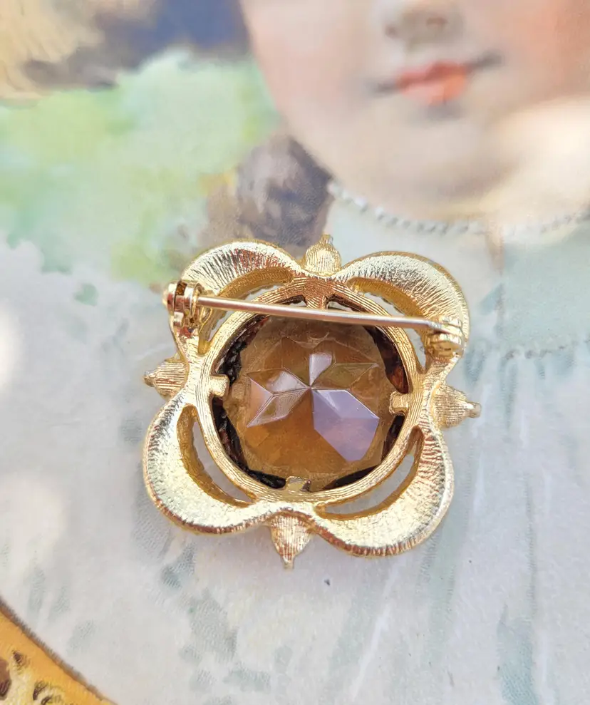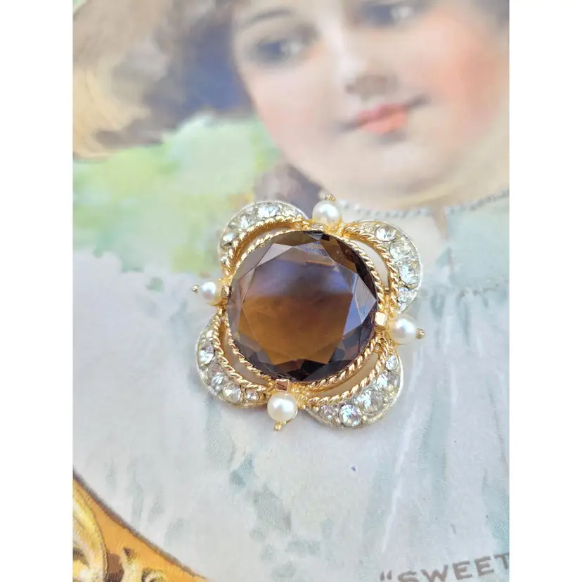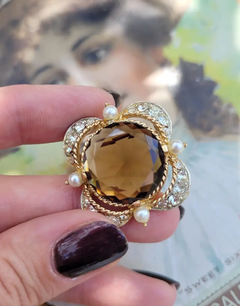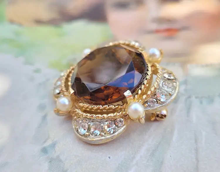 Gorgeous 1970s-does-1870s elegant brooch! It has a large glass faceted stone that's meant to look like topaz, surrounded by sweet little faux seed pearls. In good condition, please see pictures for details and measurements.