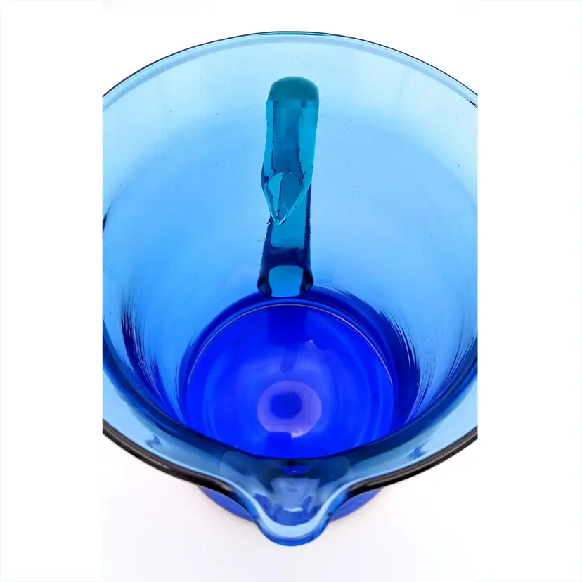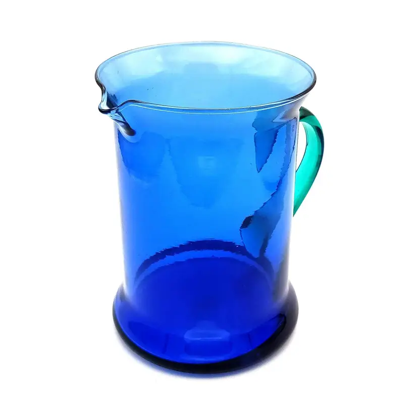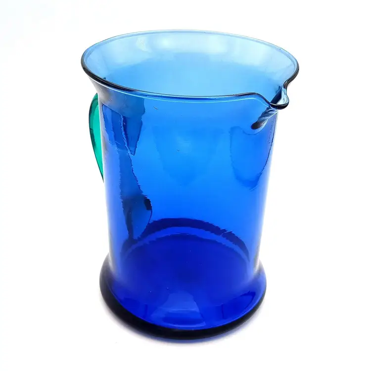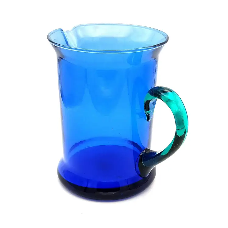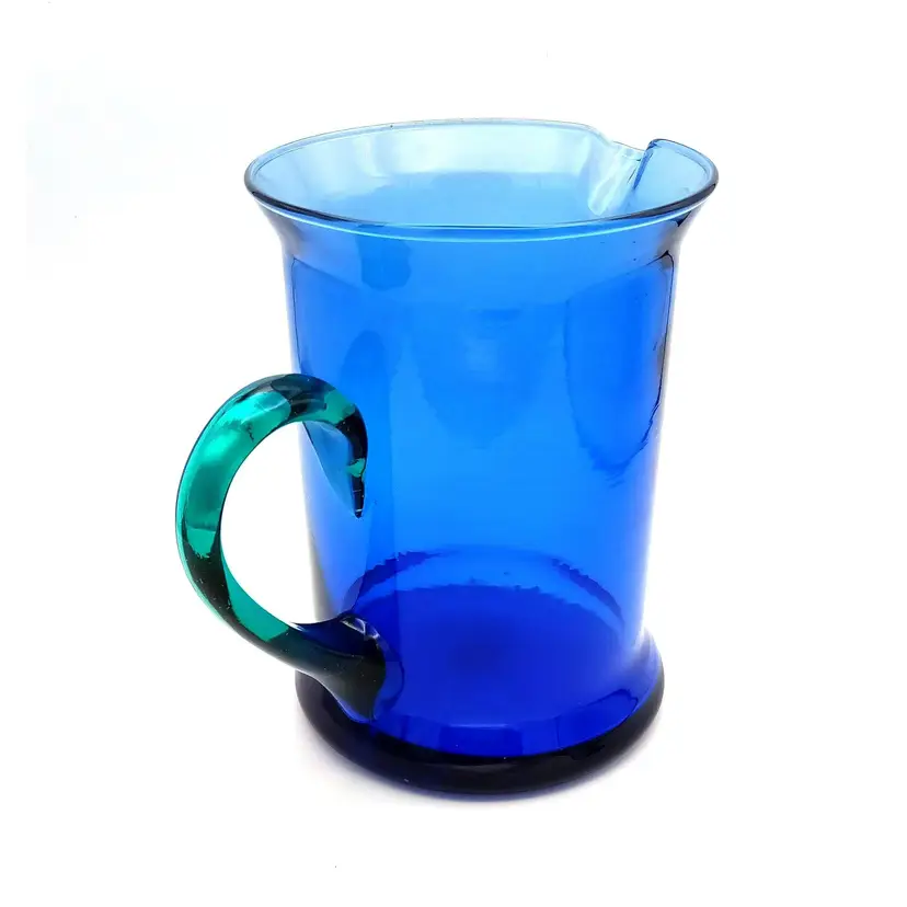Beautiful hand blown blue glass pitcher from Spain complimented with a teal blue applied handle. There is no damage to this item. It stands 7" tall and 5" wide. Thanks for looking!