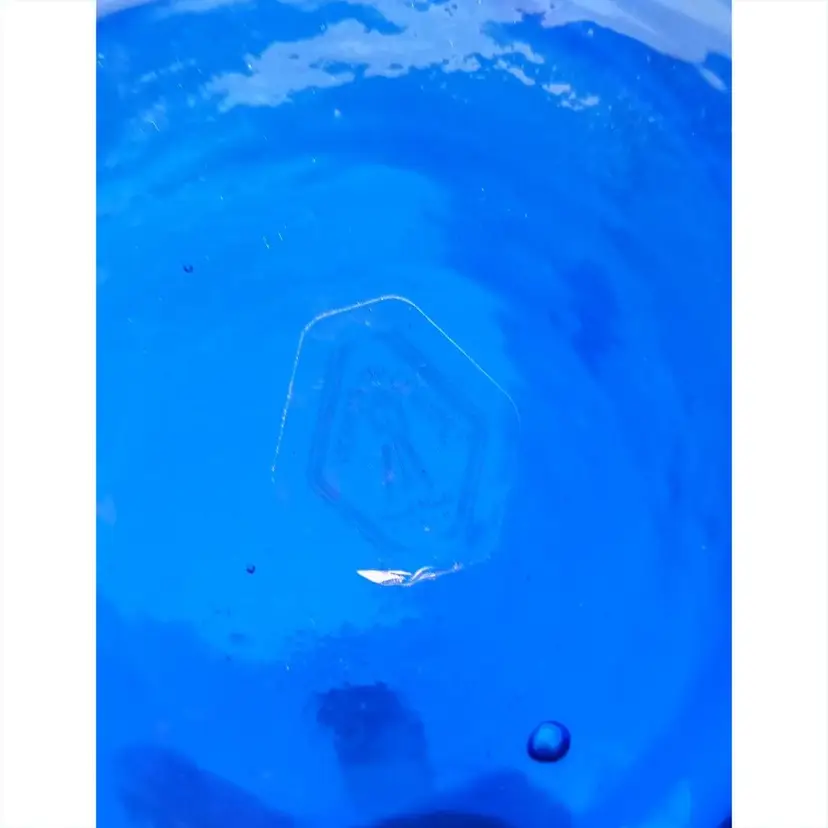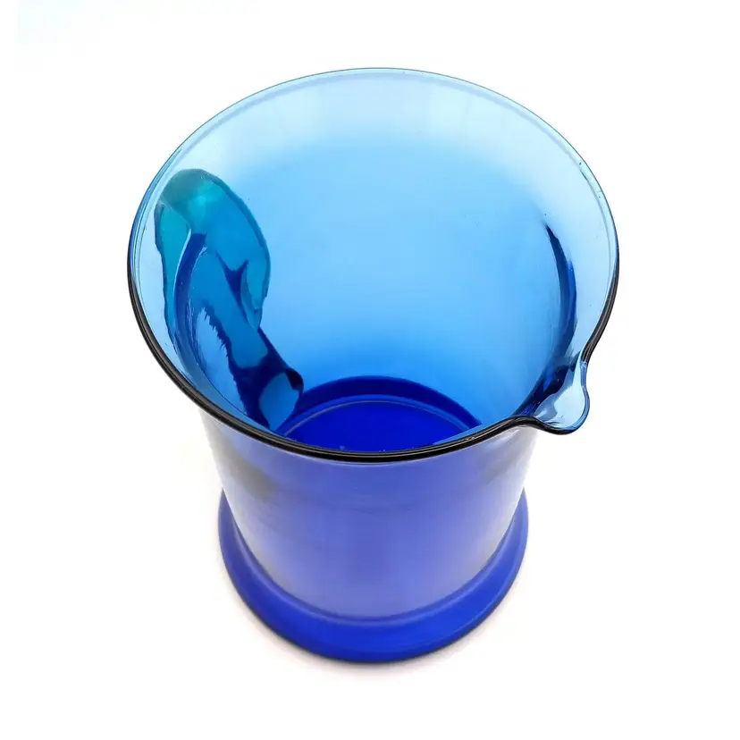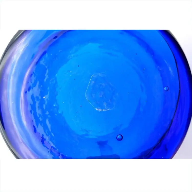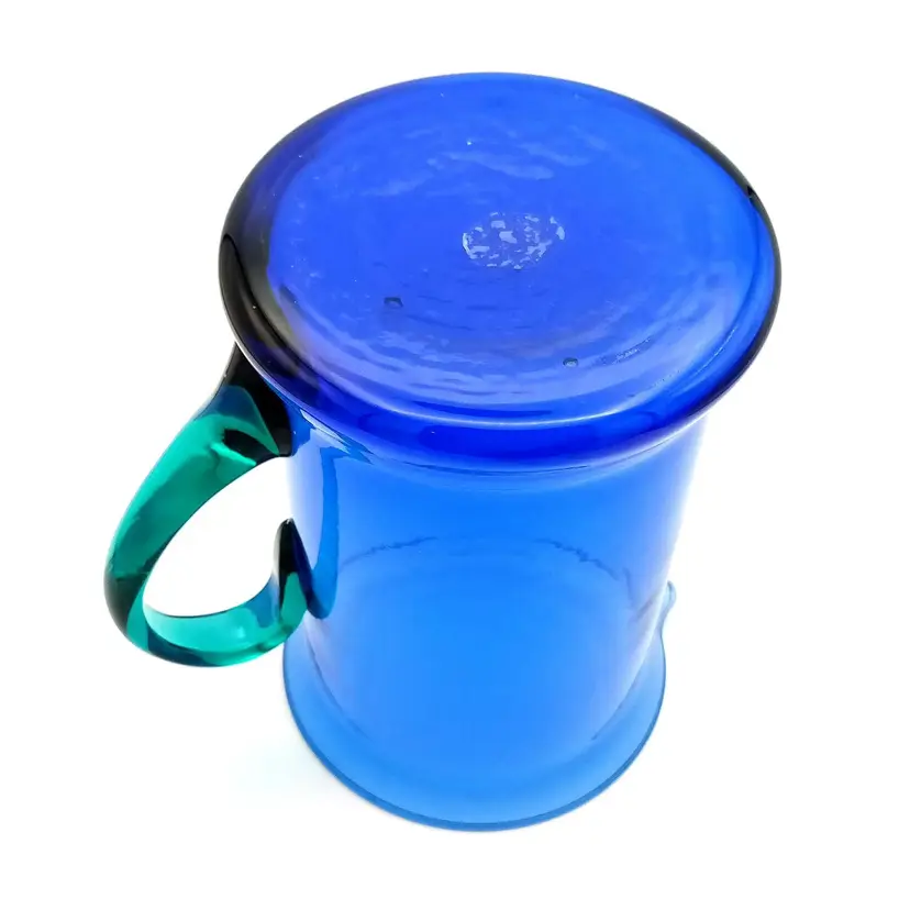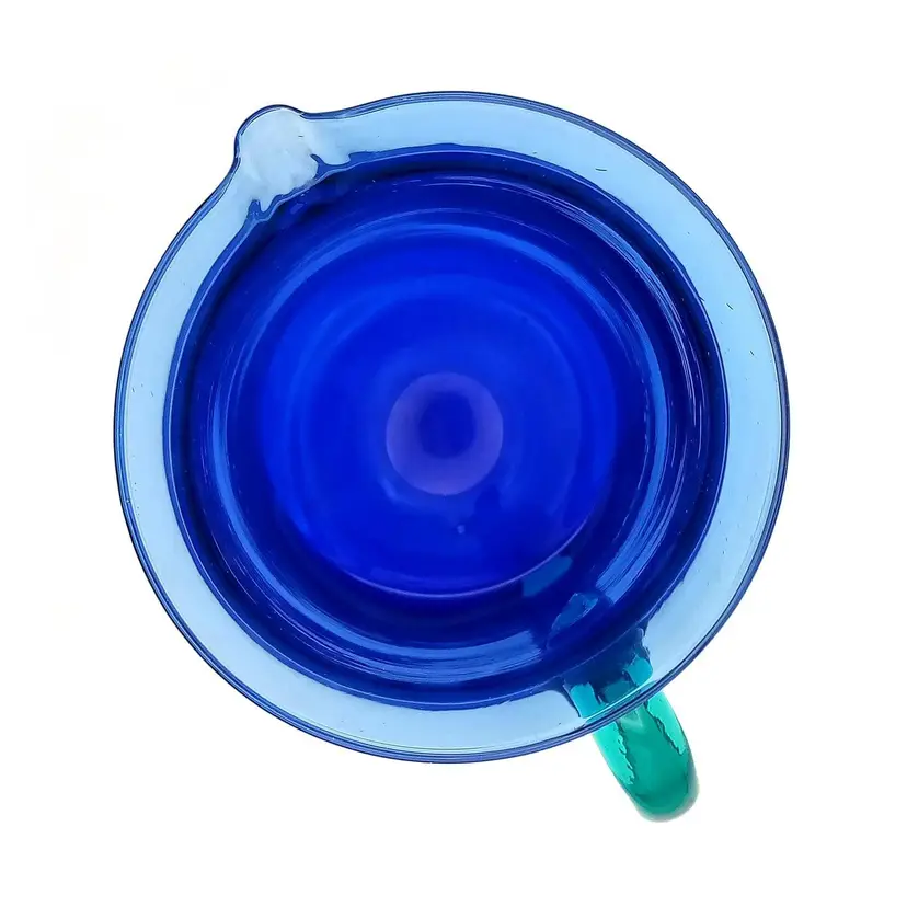 Beautiful hand blown blue glass pitcher from Spain complimented with a teal blue applied handle. There is no damage to this item. It stands 7" tall and 5" wide. Thanks for looking!