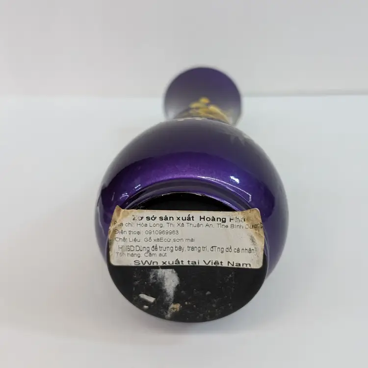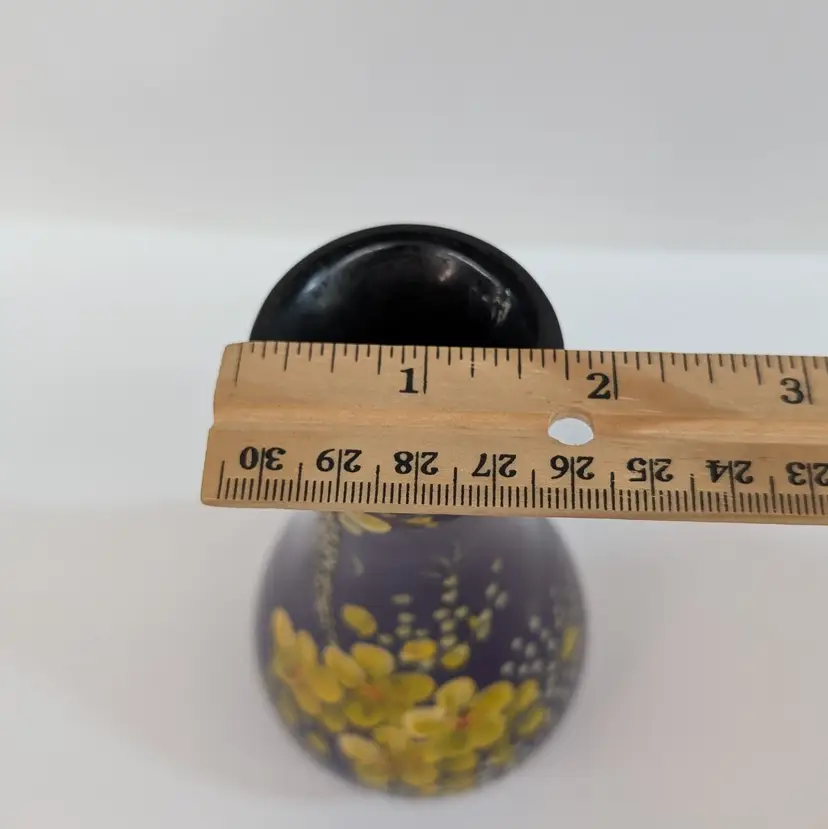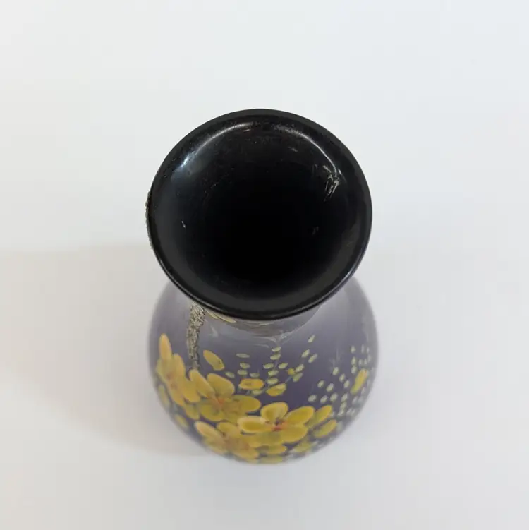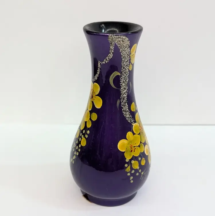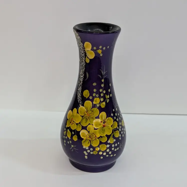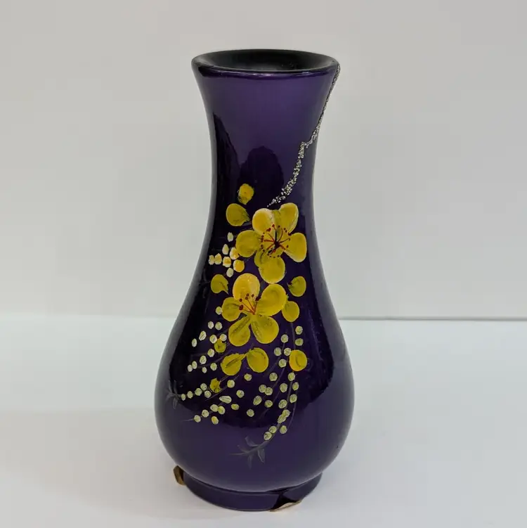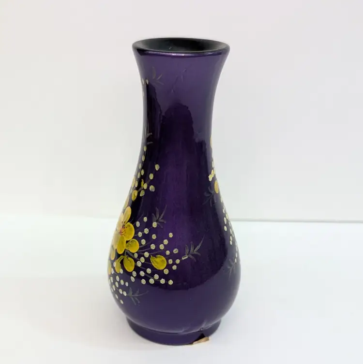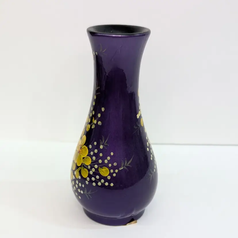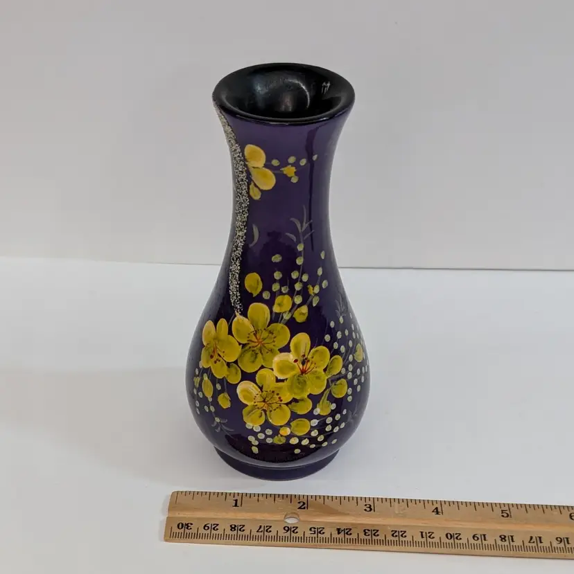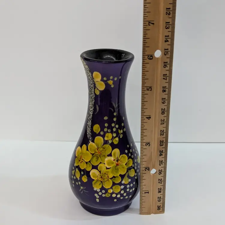 Lovely, bright purple vase with yellow hand painted flowers and textured branch. Perfect for decor or dry flowers. In nice, used condition with minimal paint wear, a scuff in the top lip and some thick lacquer in one area on the base (see pictures). Measurements ~ 3 x 6" with a 1.75" top