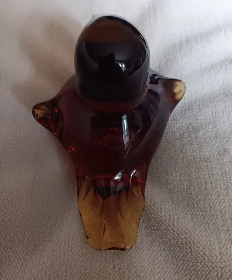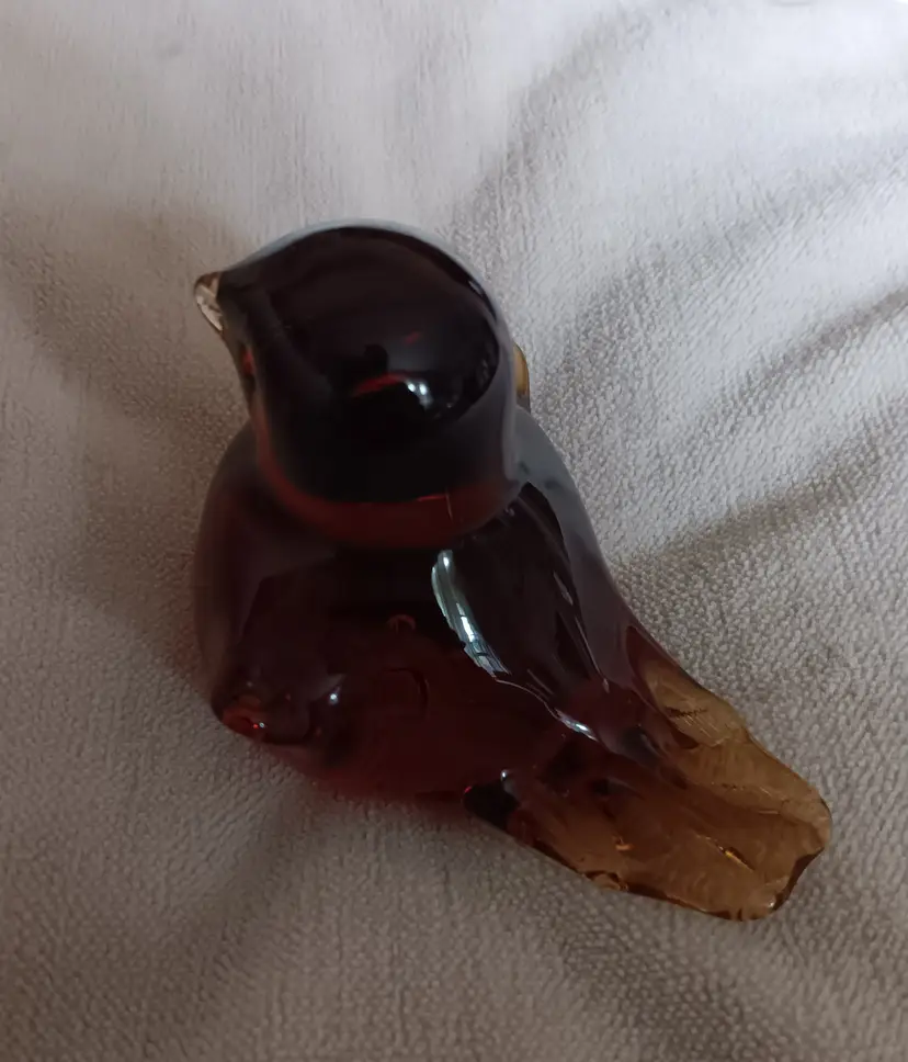 Add a touch of vintage charm to your decor with this beautiful solid amber glass bird figurine. Crafted in the mid 20th century in the United States, this original piece features intricate details and a unique mid-century modern style. The decorative bird is made of high-quality glass and is perfect for collectors and bird lovers alike.