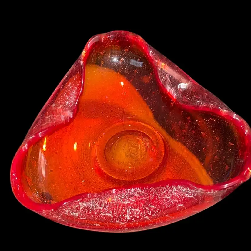 Vintage Viking Glass Ruby Red Amberina Georgian Ruffle Pedestal Bowl Compote. It features a distinctive ruby/amber color gradient that intensifies to a deeper orange at the base and lightens towards the top edge. The compote has ruffled or scalloped edges and a pedestal base. It is a mid-century modern style piece and is popular with collectors. The item in the image appears to be in excellent vintage condition with no visible chips, cracks, or breaks