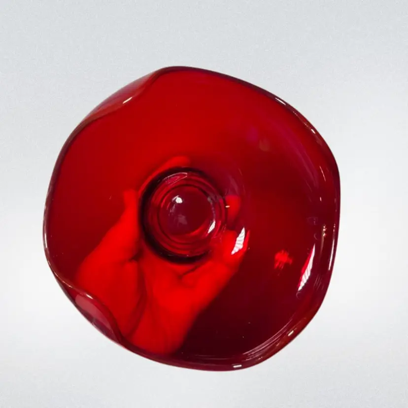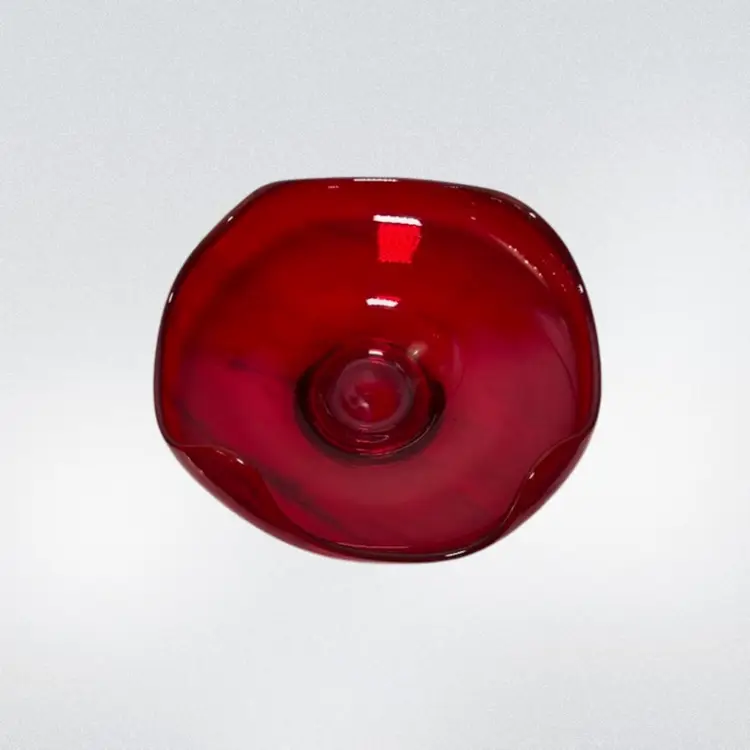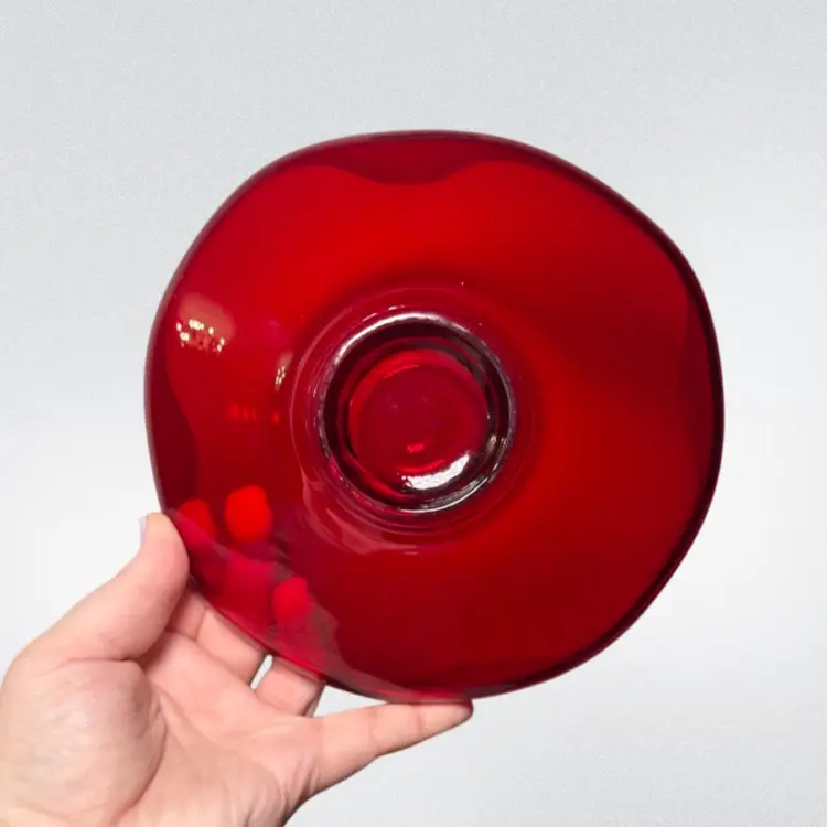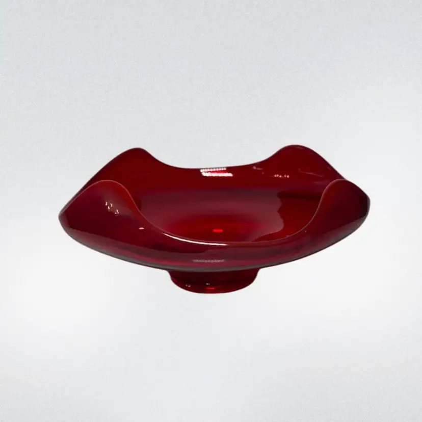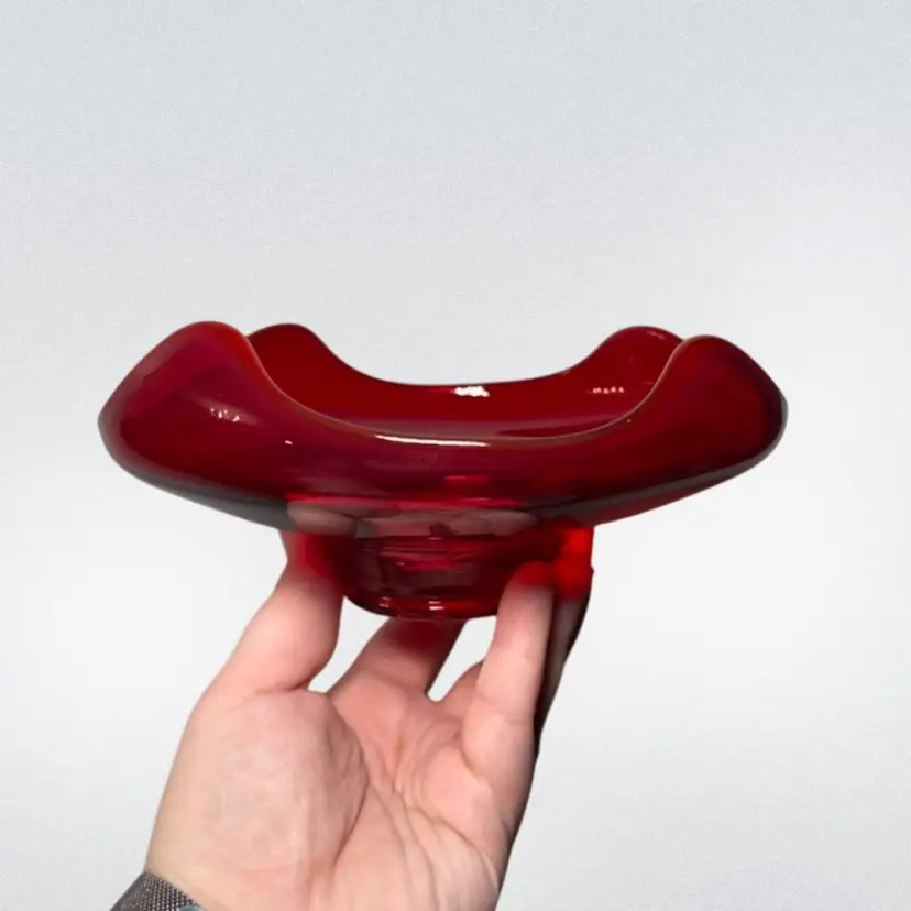 Classic Viking glass in the color Ruby. A unique four point bowl with a cadmium glow around the rim. It measures about 3in tall and 7in wide. In good vintage condition- no chips or cracks but does have some light surface scratches.