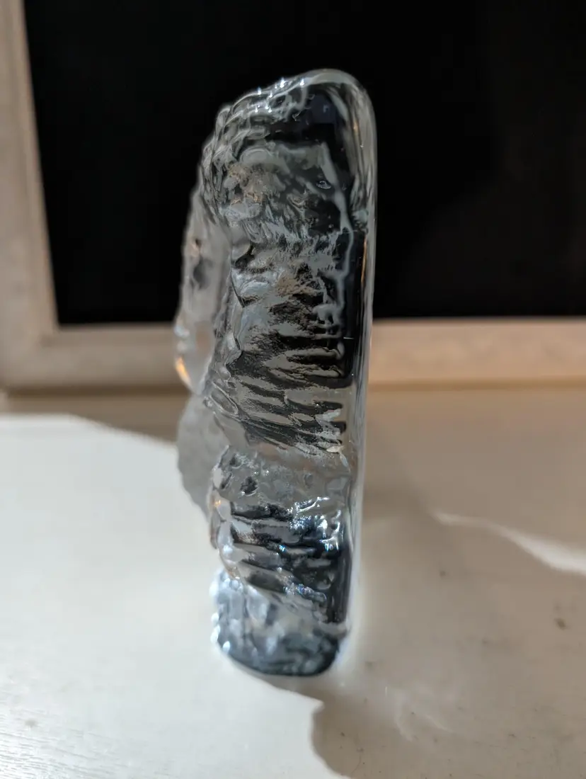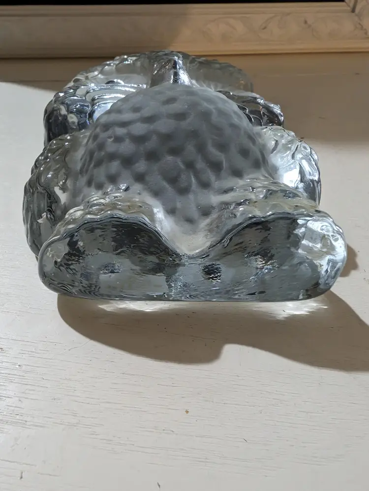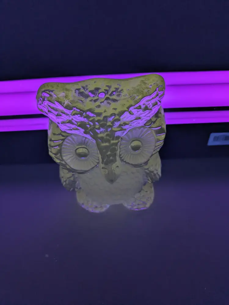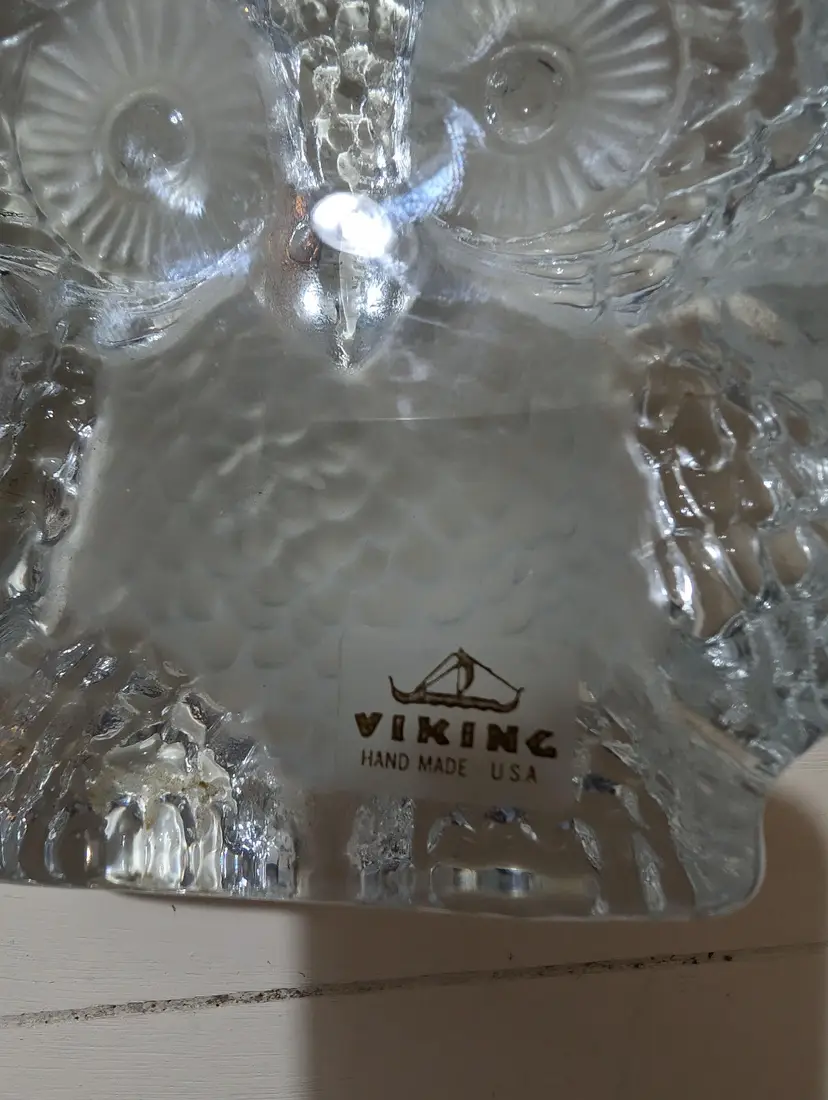 Adorable vintage Viking glass owl figurine with clear and frosted glass details.This piece is used but in excellent condition with no cracks or chips. The owl features intricate feather details and large, expressive eyes, making it a charming addition to any collection and it glow. The figurine stands approximately 6 inches tall and 4 inches length and 2 inches width and weighs around 2.3 lb. Perfect for owl lovers or as a unique decorative piece that Glows under UV light.