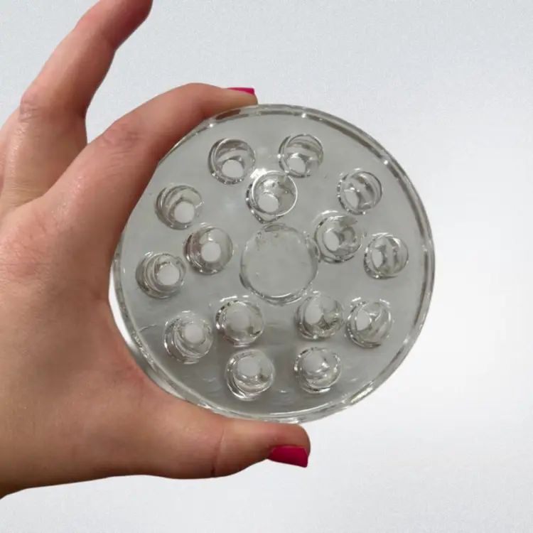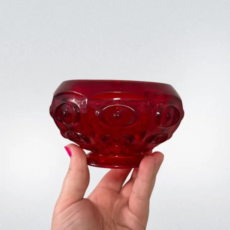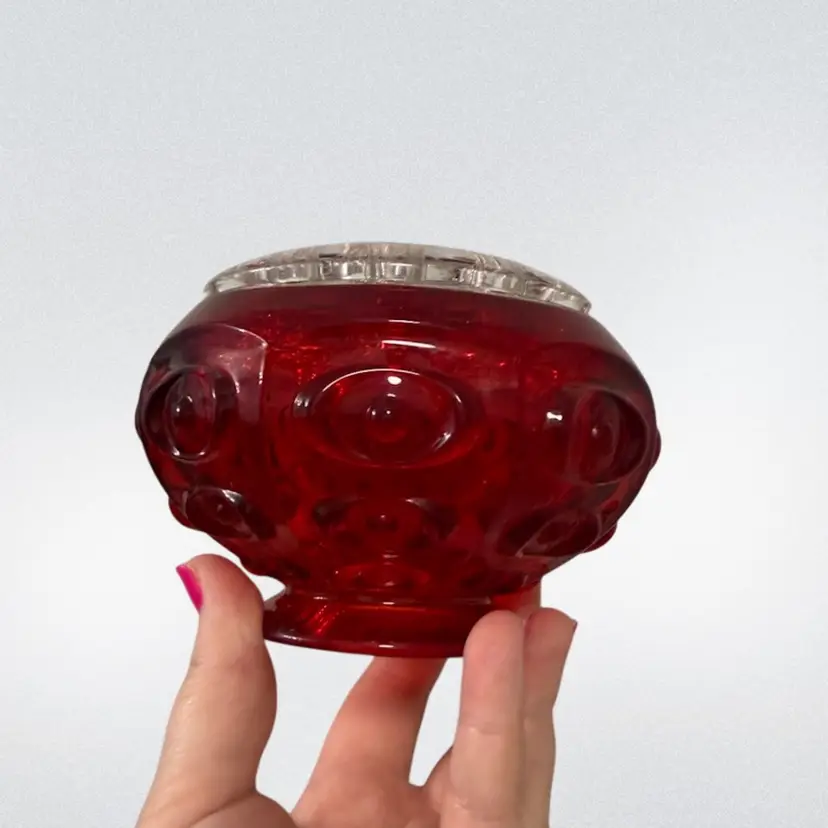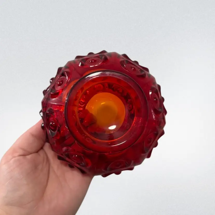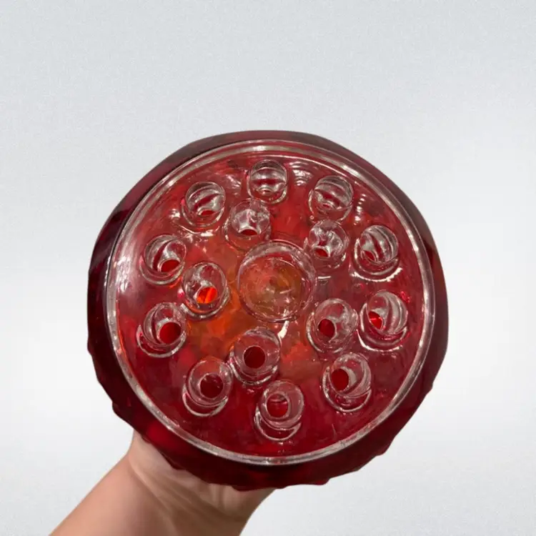 Vintage MCM flowerlite by Viking in the gorgeous Ruby color. This is the bullseye pattern and much harder to find! About 3.75in tall with the flower frog and 5in wide. Has a beautiful cadmium glow, mainly on the base.