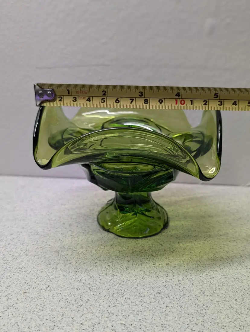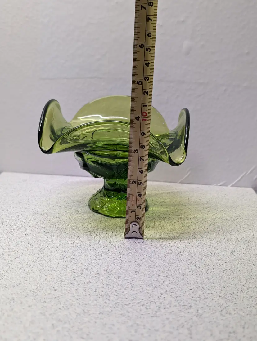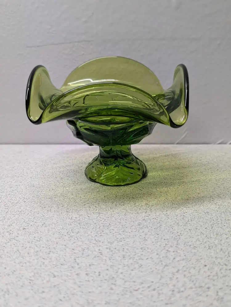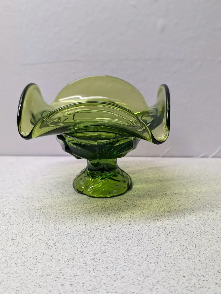 This vintage glass compote dish is a true work of art. With a beautiful green color and abstract shape, it is sure to add a touch of elegance to any room. The hand blown glass production technique gives it a unique and glossy finish, while the solid pattern and single compartment make it perfect for storing candy or other small items. The dish is made by the renowned brand New Martinsville/Viking and is part of the Viking product line. Its decorative features and vintage style make it a great addition to any collection. Whether you use it to serve candy, as a centerpiece, or as a decorative piece in your home, this glass compote dish is sure to impress.