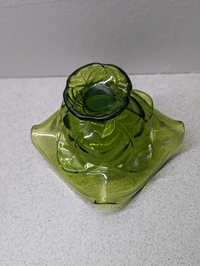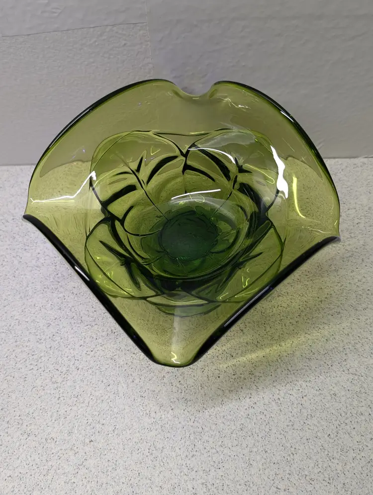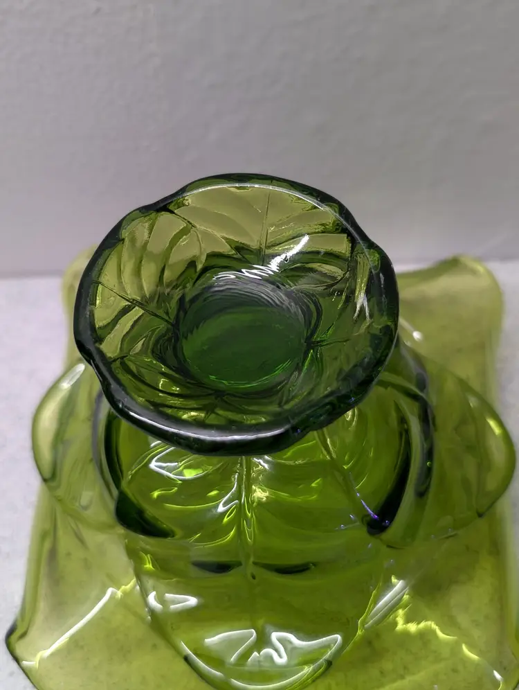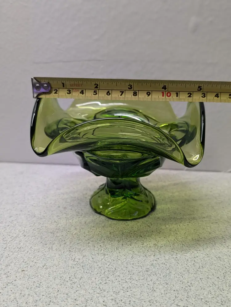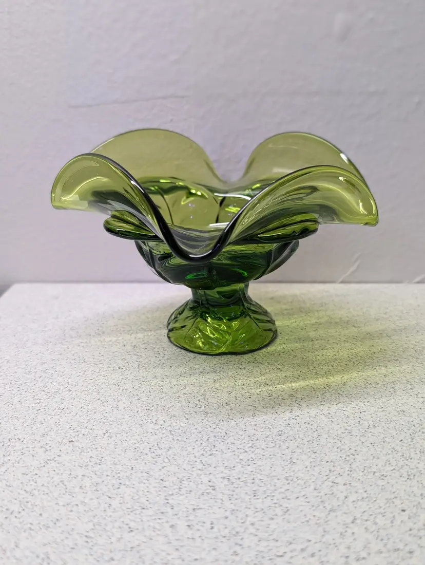 This vintage glass compote dish is a true work of art. With a beautiful green color and abstract shape, it is sure to add a touch of elegance to any room. The hand blown glass production technique gives it a unique and glossy finish, while the solid pattern and single compartment make it perfect for storing candy or other small items. The dish is made by the renowned brand New Martinsville/Viking and is part of the Viking product line. Its decorative features and vintage style make it a great addition to any collection. Whether you use it to serve candy, as a centerpiece, or as a decorative piece in your home, this glass compote dish is sure to impress.