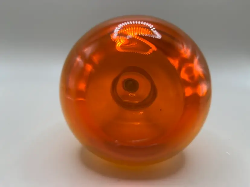 Features a vibrant orange body with an applied green glass stem. Measures 5.5 inches tall