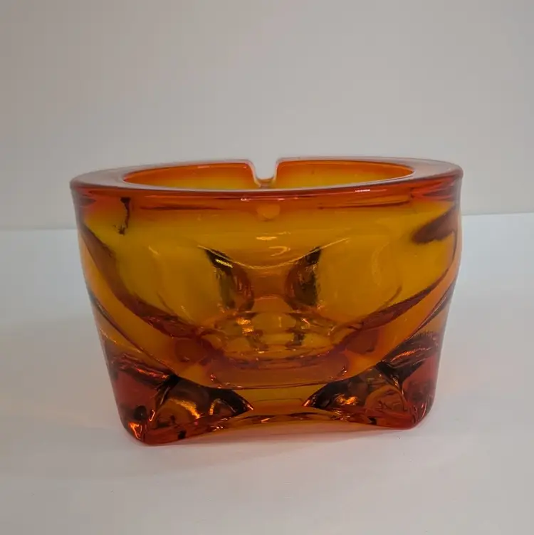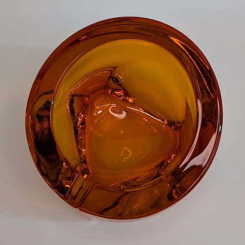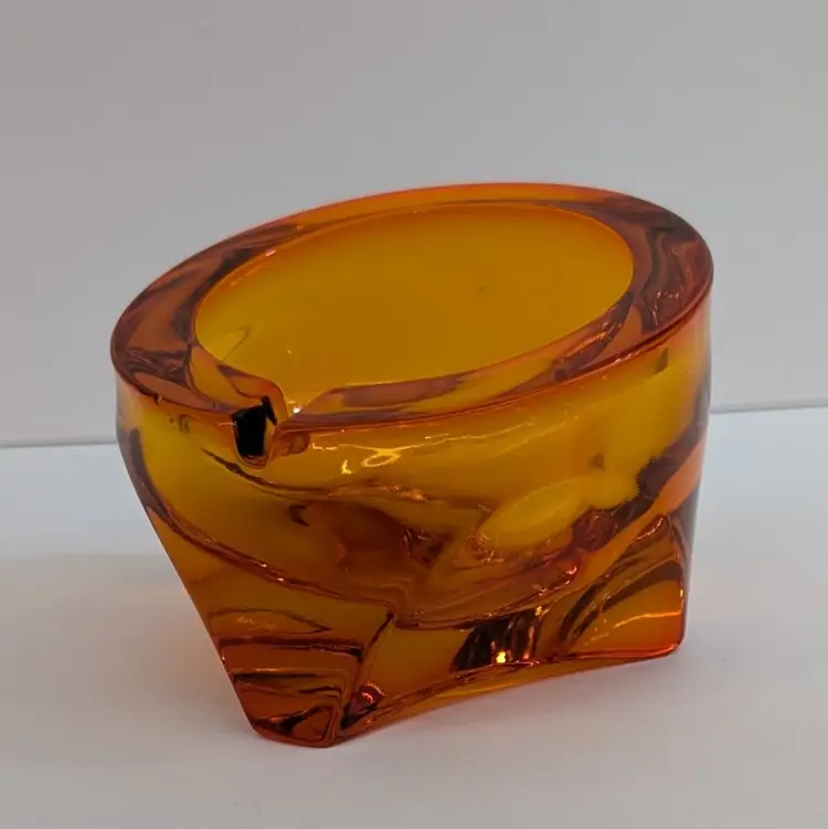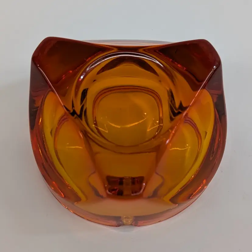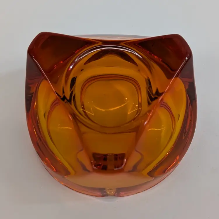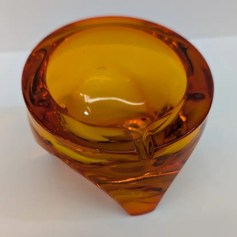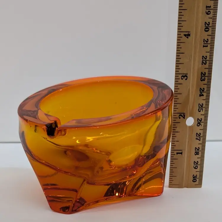 Delightfully, bright persimmon orange Viking ashtray with tripod feet, a slanted opening and one slot at the bottom. There are a couple small chips on the rim to the right of the opening and a small scuff on the back (see pictures). It does glow under black light from its cadmium content. Measurements ~ 3-7/8 x 4 x 2-3/4"