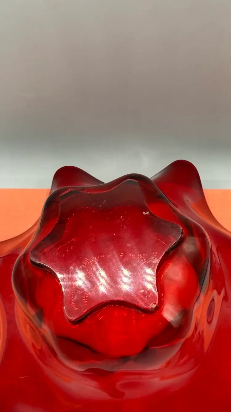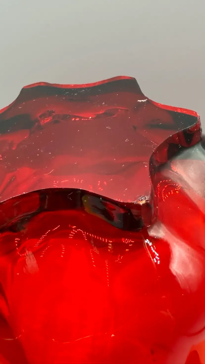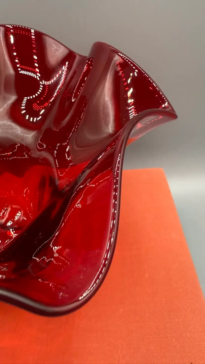 heavy art glass piece features the iconic ruby red color with a dramatic ruffled "handkerchief" edge and the signature "Epic" six-petal footed base. Excellent condition no chips or cracks except where noted. “Foot” has slight flea bites from use.