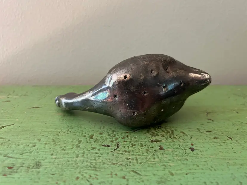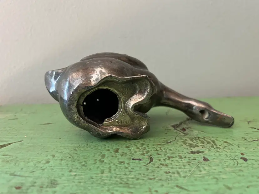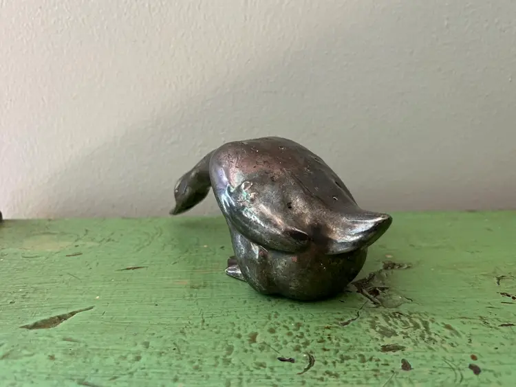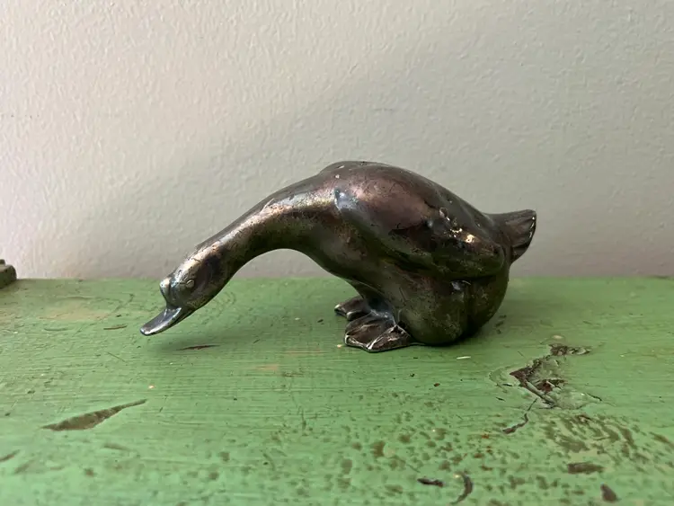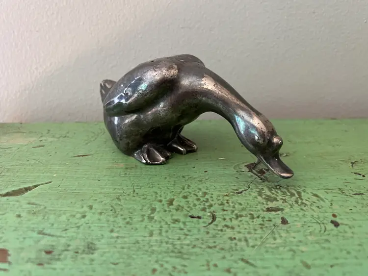 Vintage Goose figurine/ shaker made by Viking in the 1930s Silver plated lead. Lots of tarnish adds to his charm! No stopper. The bottom where the stopper inserts is no longer round. See photos. Measurements: 6.25" long, 3" tall, and 2.5" wide. It weighs 12.5 oz.