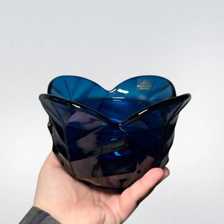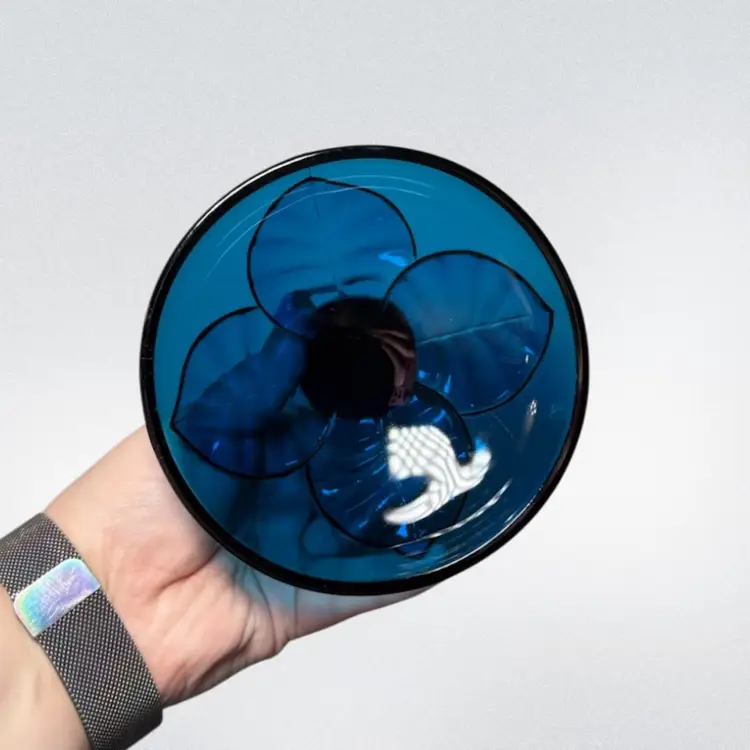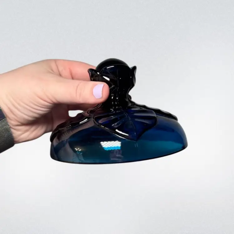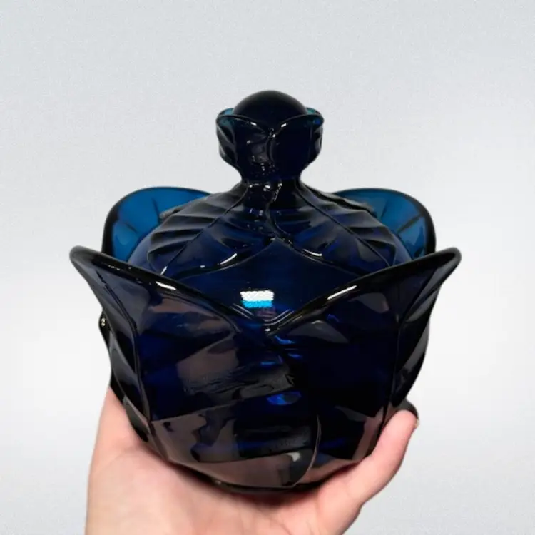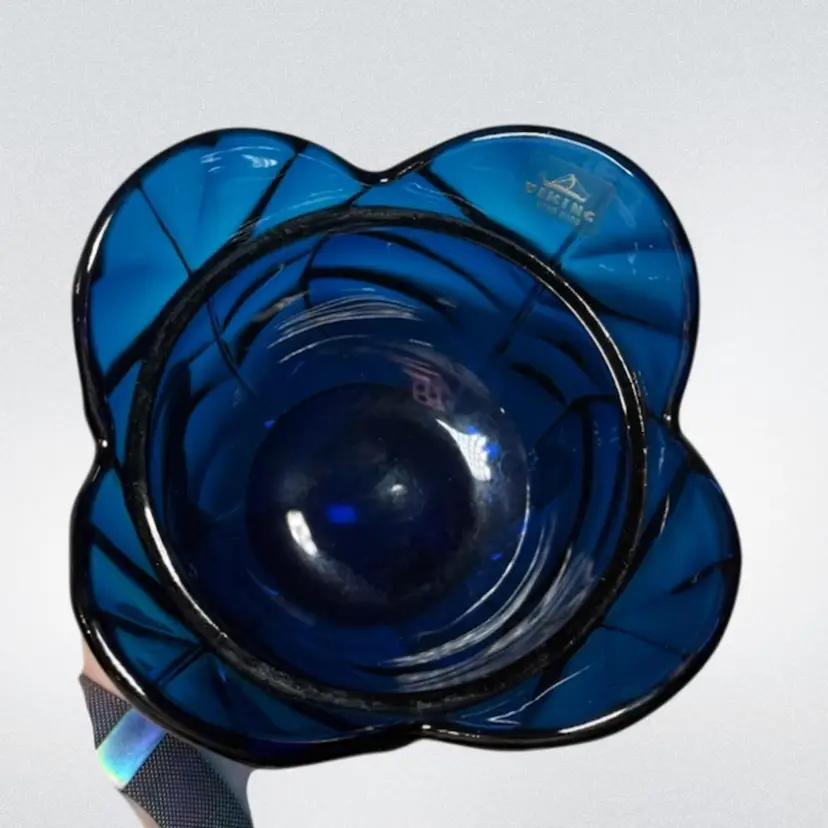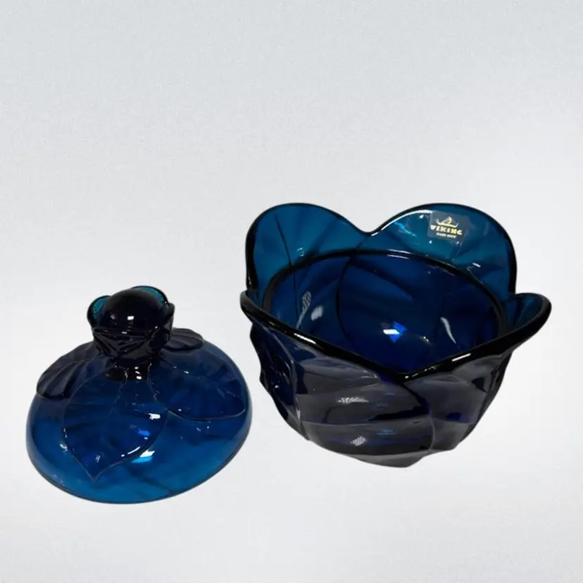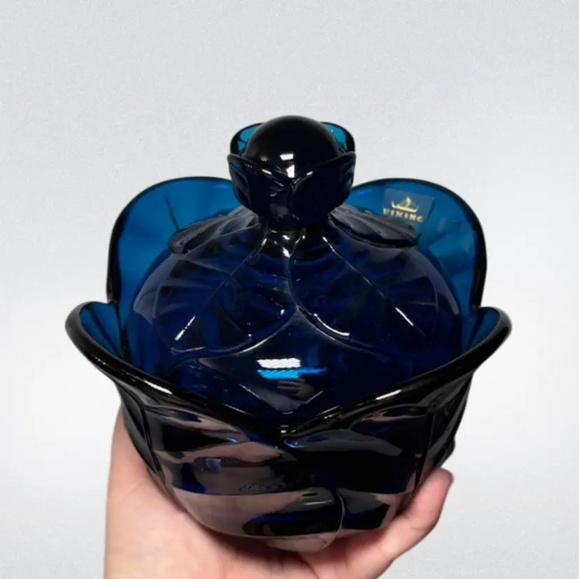 Gorgeous, heavy piece of Viking glass, with the original sticker. This candy dish is complete with its lid and comes in the beautiful bluenique color. It is about 6in tall, with the lid. In good vintage condition- no chips or cracks.