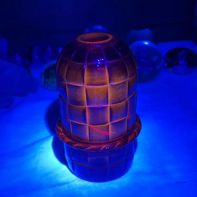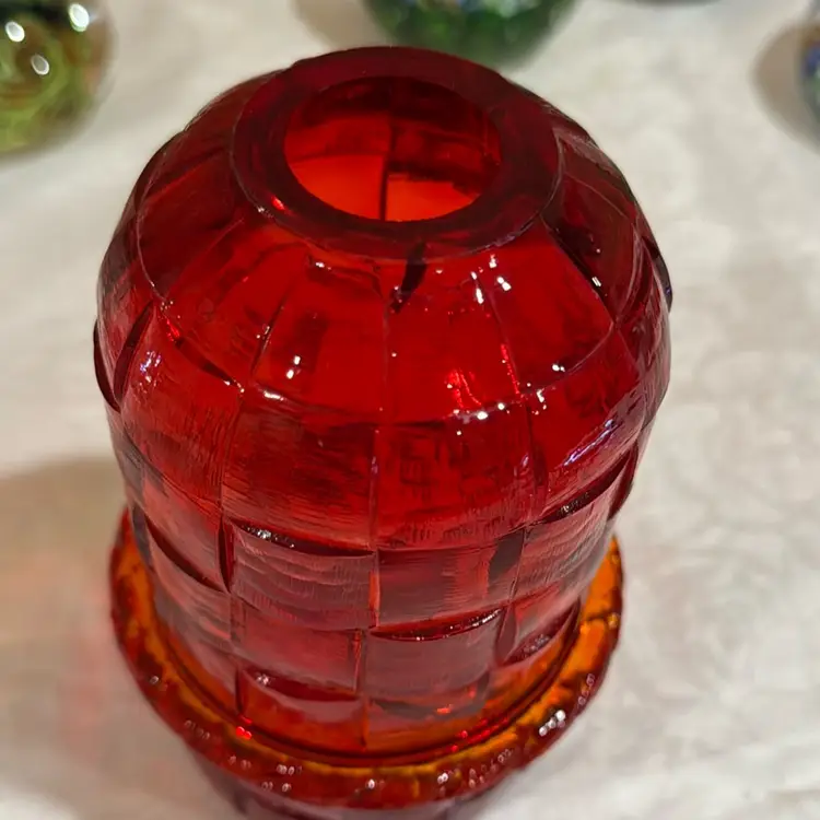 This is a beautiful piece and is fully functional, but it is important to note that you can see two internal cracks in the glass, one in the top running from the middle of the top to the bottom and the second is shown at the top of the top. The cracks do not affect the beauty or the integrity of the lamp.