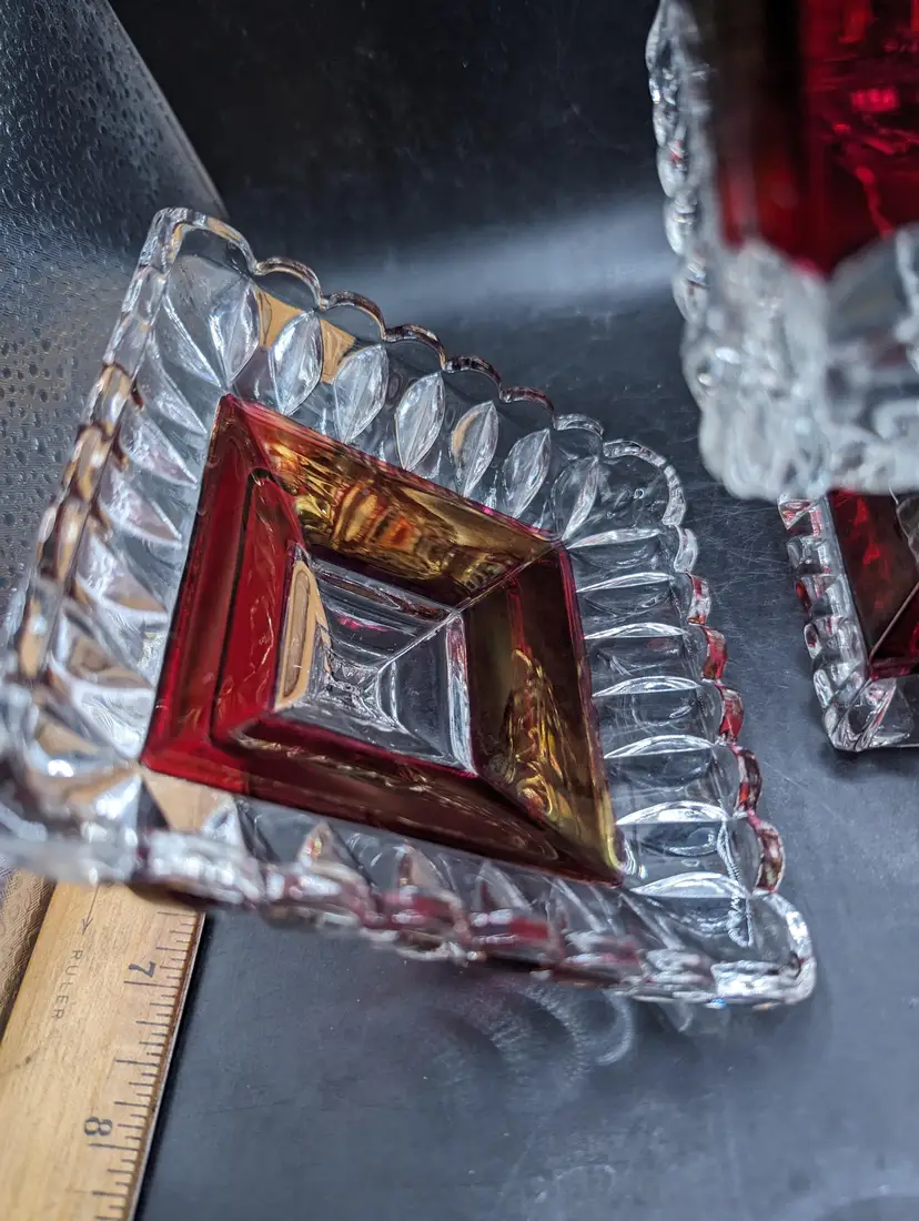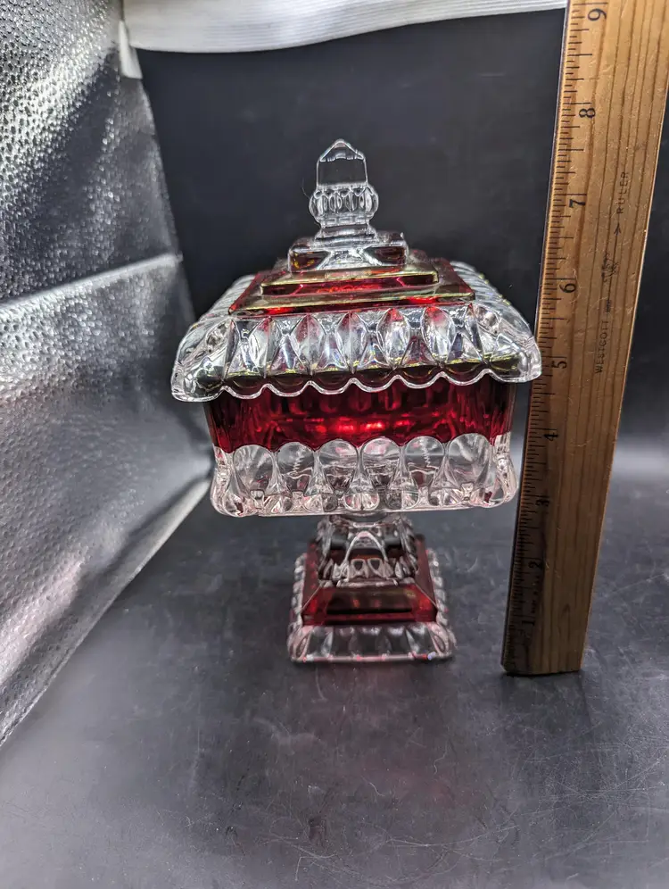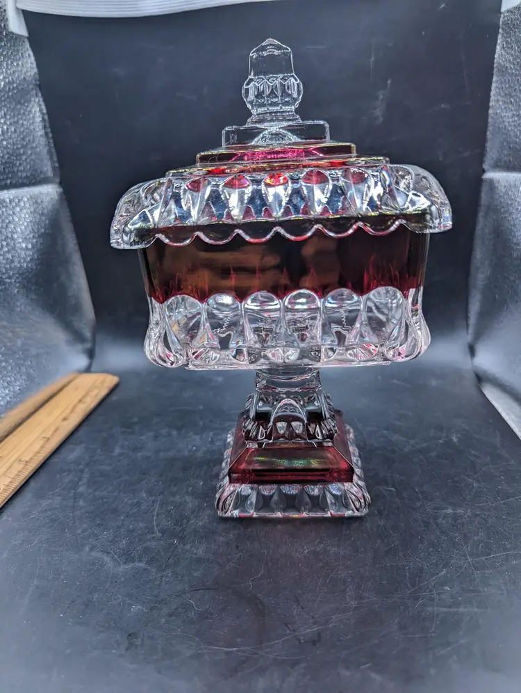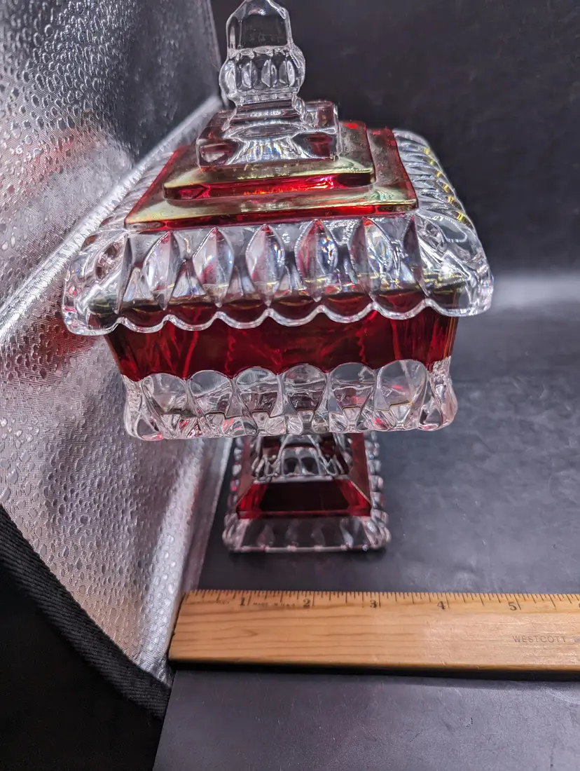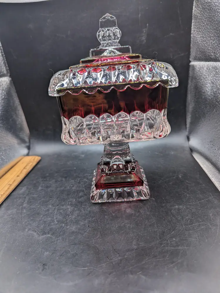 Add a touch of elegance to your home with this vintage ruby red glass candy dish. Perfect for storing sweets or as a decorative piece, it features intricate detailing and a charming lid. Please see all pictures for condition and measurements.